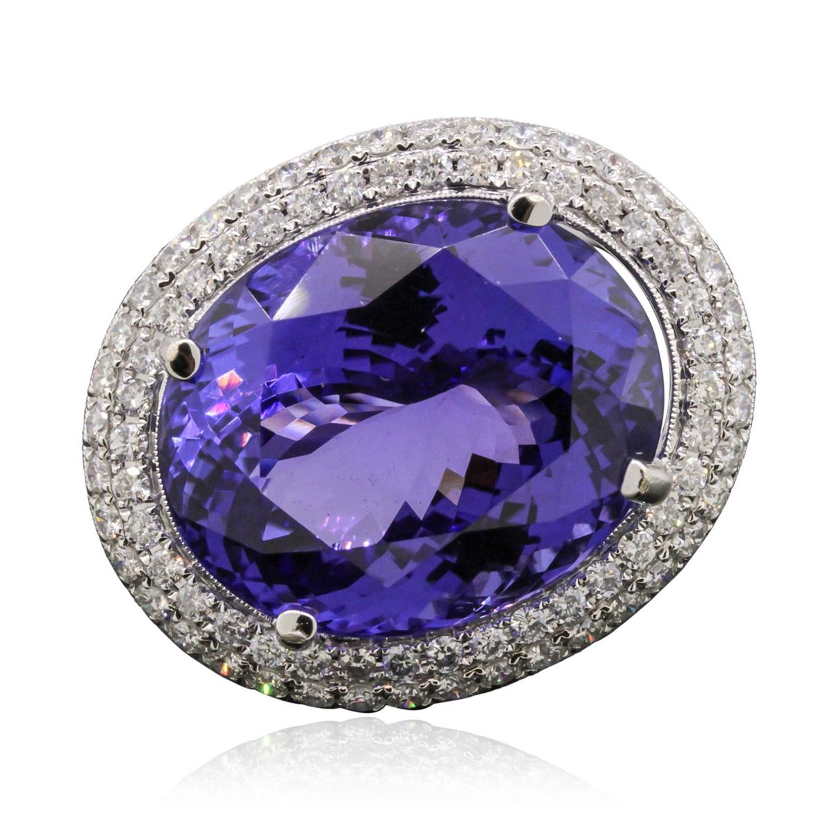 One electronically tested 18KT white gold ladies cast tanzanite and diamond ring. The featured tanzanite is set within a tiered diamond bezel supported by intertwining shoulders, completed by a two and one-half millimeter wide band. Bright polish finish with milgrain detailing. Trademark is UCG. Identified with markings of "18K 750". Containing: One prong set oval modified brilliant cut natural tanzanite, measuring 21.30 x 17.40 x 11.32mm, exact weight 30.19ct., clarity is eye clean, type I, medium dark, moderately strong, bluish violet color, (GIA bV 6/4), cut is good. Transmitting light with no distortion, transparent. GIA Gemological Report attached. Graded loose prior to setting in the GIA Laboratory, Report #2161211925.Tanzanite is a very rare gemstone that is only found in the country of Tanzania. Originally discovered in 1967. Tiffany & Company, named the stone Tanzanite. It is found in the Usumburu Mountains that border the Umba Valley of northern Tanzania. Tanzanite occurs in gray, brown, violet, blue, reddish-purple, & green. The gem is interesting because of its exceptional pleochroism. Rotated in different directions a tanzanite will exhibit multiple changes of color. Tanzanite has a low tolerance to ultrasonic cleaning, and should not be cleaned using this method. Seventy-Eight prong set round brilliant cut diamonds, measuring 1.60 - 1.60 x 0.96mm (depth est.) approximate total weight of 78 Stones = 1.26ct. Graded in the setting. Clarity: SI-1 to I-1 . Color: G - I. Total Weight of Colored Stones 30.19ct. Total Weight of Diamonds 1.26ct. Total Weight of Ring 16.30 grams. AIG Appraised at $82,275.00.