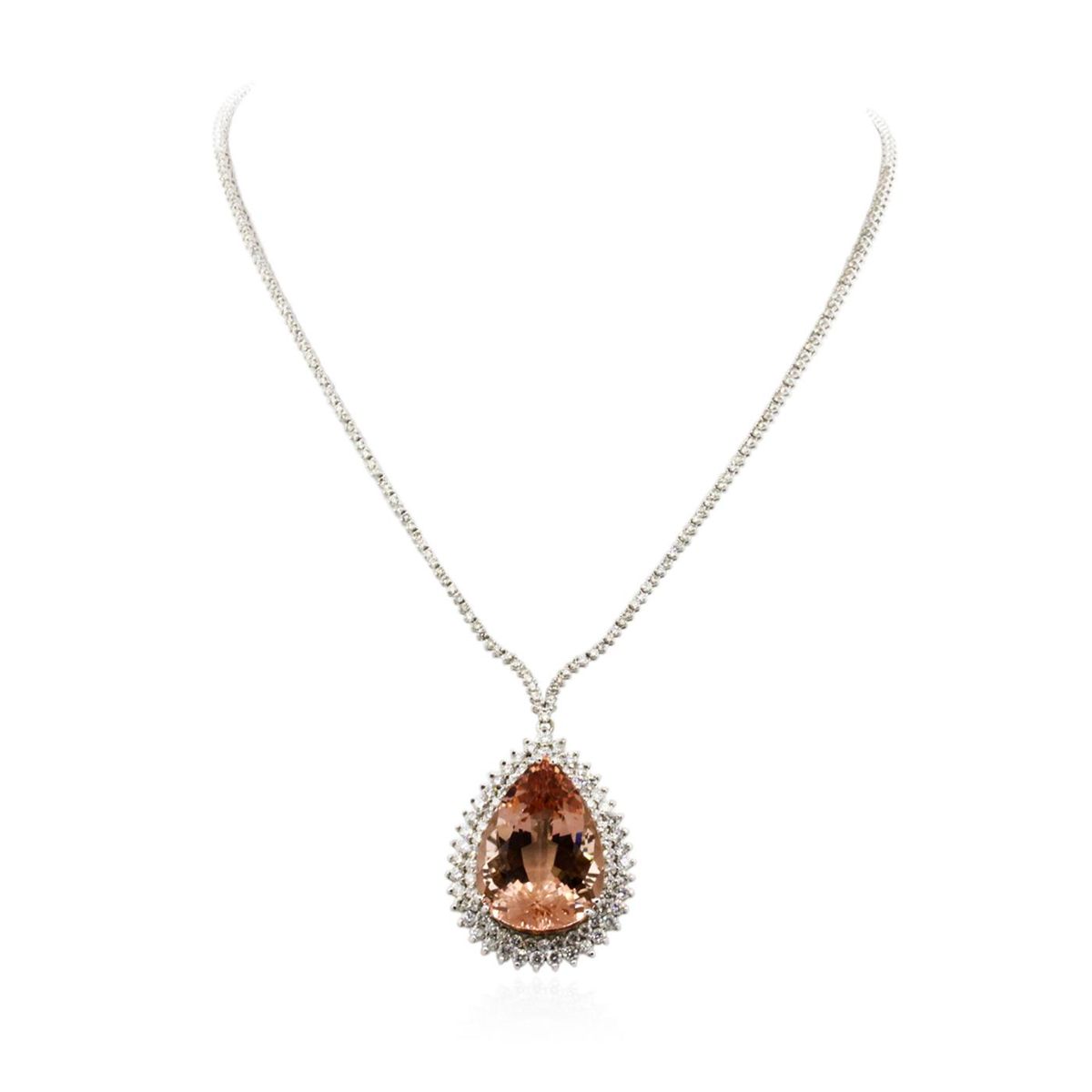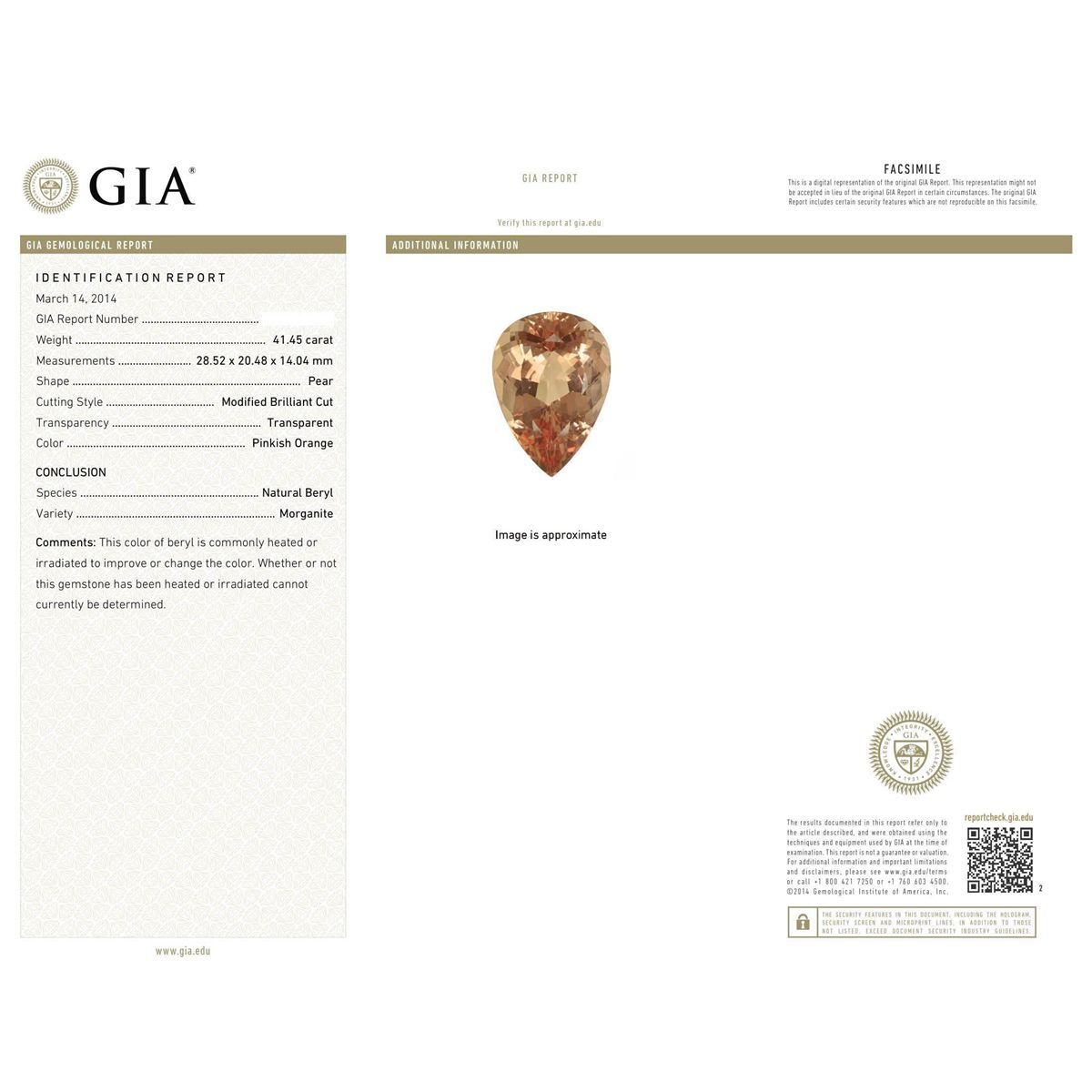 One electronically tested 18KT white gold lady's combination cast & assembled necklace with a hidden box clasp with a bright polish finish. Condition is new. Identified with markings of "750". Containing: One prong set pear modified brilliant cut natural morganite, measuring 28.52 x 20.48 x 14.04mm, approximate weight of 41.45ct., clarity is eye clean, type I, light, brownish, reddish orange color, (GIA rO 3/1), cut is very good. GIA REPORT: 1156961978. One Hundred Forty prong set round brilliant cut diamonds, measuring 1.40 - 1.40 x 0.84mm (depth est.) approximate. Total Weight of 140 Stones = 1.40ct. Clarity: I-1 to I-2. Color: I - J, Cut is Good. Seventy-Five prong set round brilliant cut diamonds, measuring 2.40 - 2.00 x 0.00mm (depth est.) approximate. Total Weight of 75 Stones = 2.38ct. Clarity: I-1 to I-2. Color: I - J, Cut is Good. Colored gemstones are presumed to have been subjected to commonly used enhancement processes. All diamonds and colored gemstones are graded in the mounting, unless otherwise stated. Total Weight of Colored Stones 41.45ct. Total Weight of Diamonds 3.78ct. Total Weight of Necklace 36.40 grams. GGL Appraised at $44,115.00.