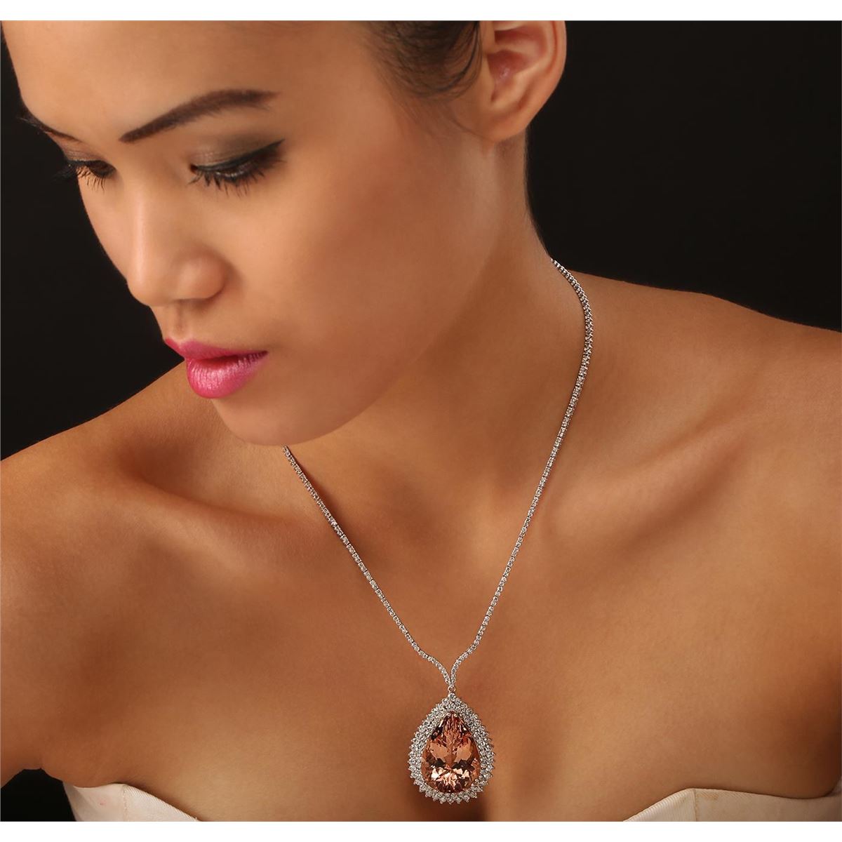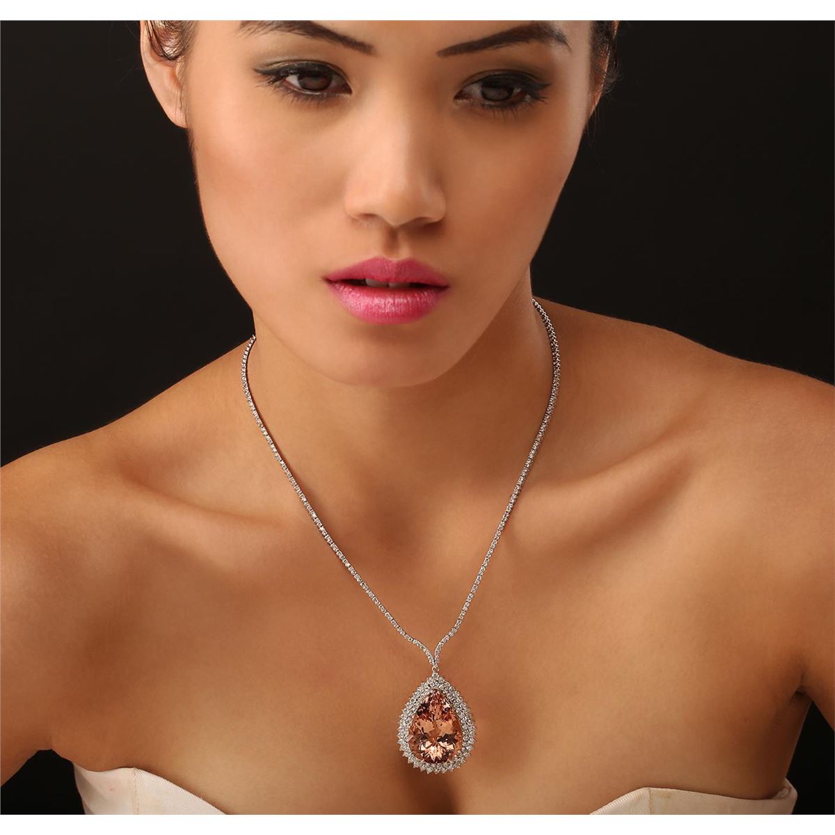 One electronically tested 18KT white gold lady's combination cast & assembled necklace with a hidden box clasp with a bright polish finish. Condition is new. Identified with markings of "750". Containing: One prong set pear modified brilliant cut natural morganite, measuring 28.52 x 20.48 x 14.04mm, approximate weight of 41.45ct., clarity is eye clean, type I, light, brownish, reddish orange color, (GIA rO 3/1), cut is very good. GIA REPORT: 1156961978. One Hundred Forty prong set round brilliant cut diamonds, measuring 1.40 - 1.40 x 0.84mm (depth est.) approximate. Total Weight of 140 Stones = 1.40ct. Clarity: I-1 to I-2. Color: I - J, Cut is Good. Seventy-Five prong set round brilliant cut diamonds, measuring 2.40 - 2.00 x 0.00mm (depth est.) approximate. Total Weight of 75 Stones = 2.38ct. Clarity: I-1 to I-2. Color: I - J, Cut is Good. Colored gemstones are presumed to have been subjected to commonly used enhancement processes. All diamonds and colored gemstones are graded in the mounting, unless otherwise stated. Total Weight of Colored Stones 41.45ct. Total Weight of Diamonds 3.78ct. Total Weight of Necklace 36.40 grams. GGL Appraised at $44,115.00.