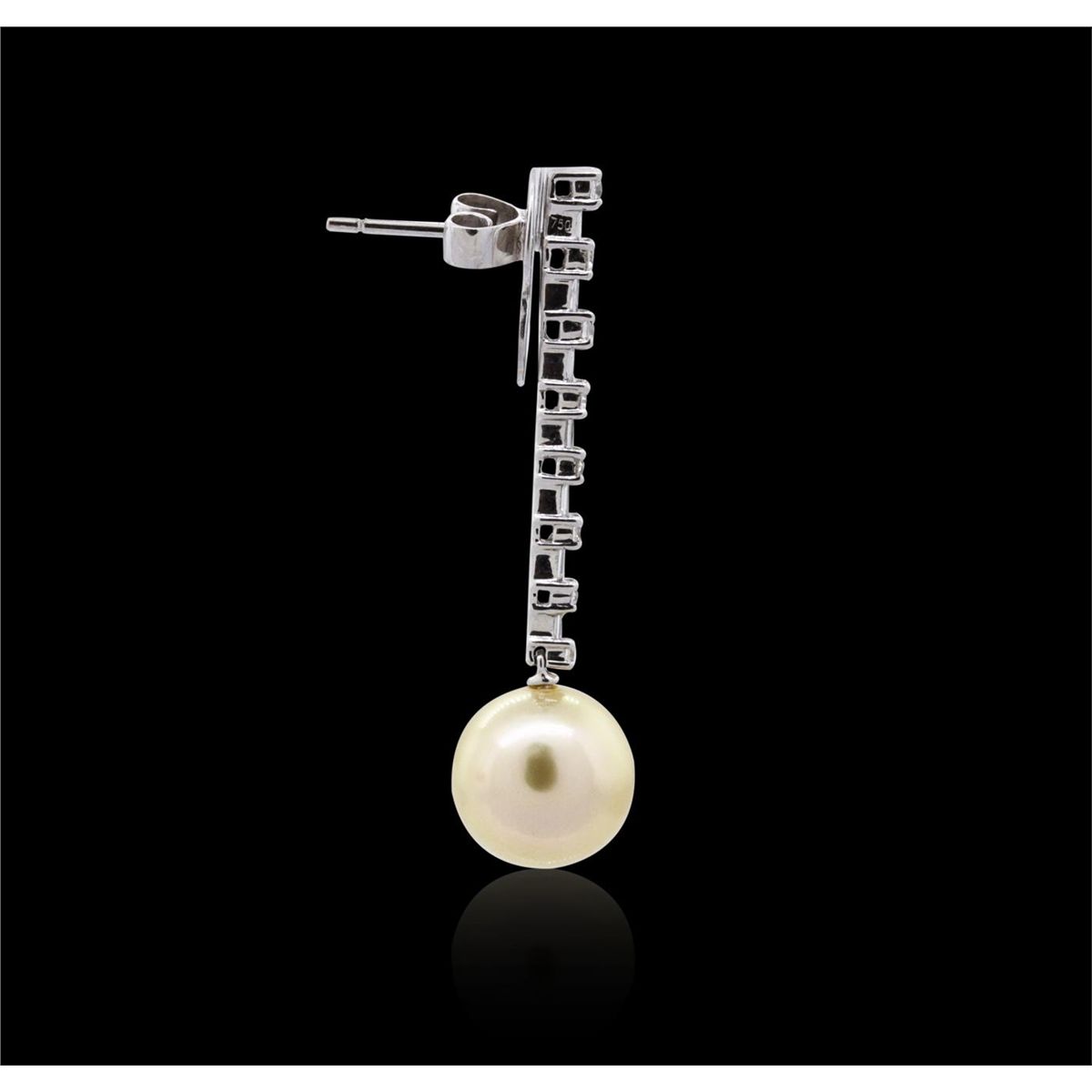 One pair of earrings featuring: 18KT white gold weighing 3.76 grams containing two pearls measuring 11.00 mm and 30 baguette/round cut diamonds with a total weight of 0.76cts.