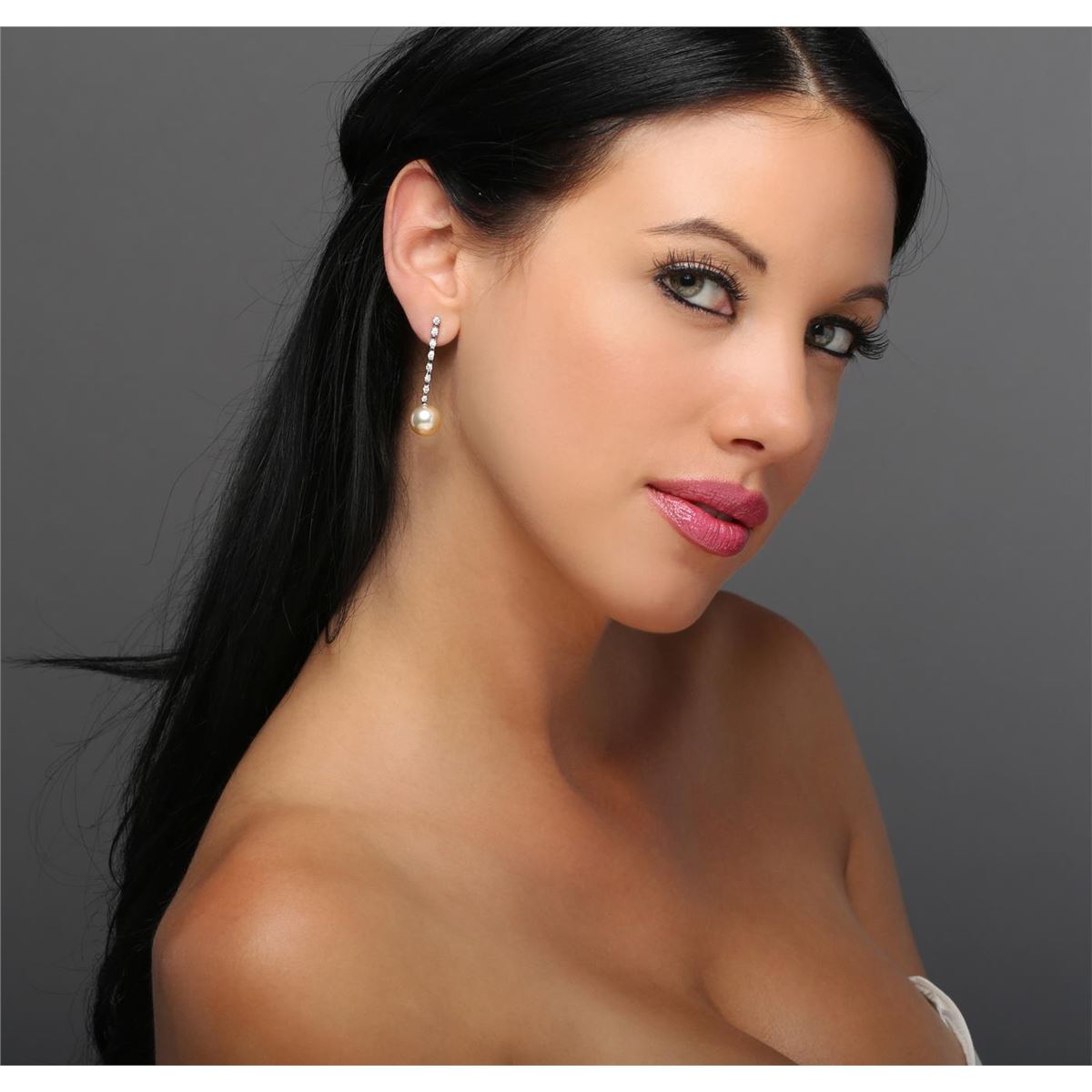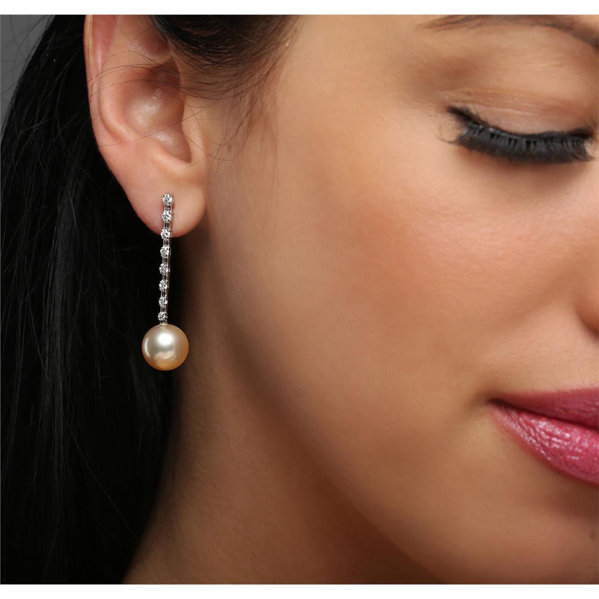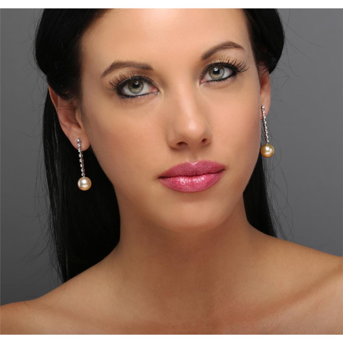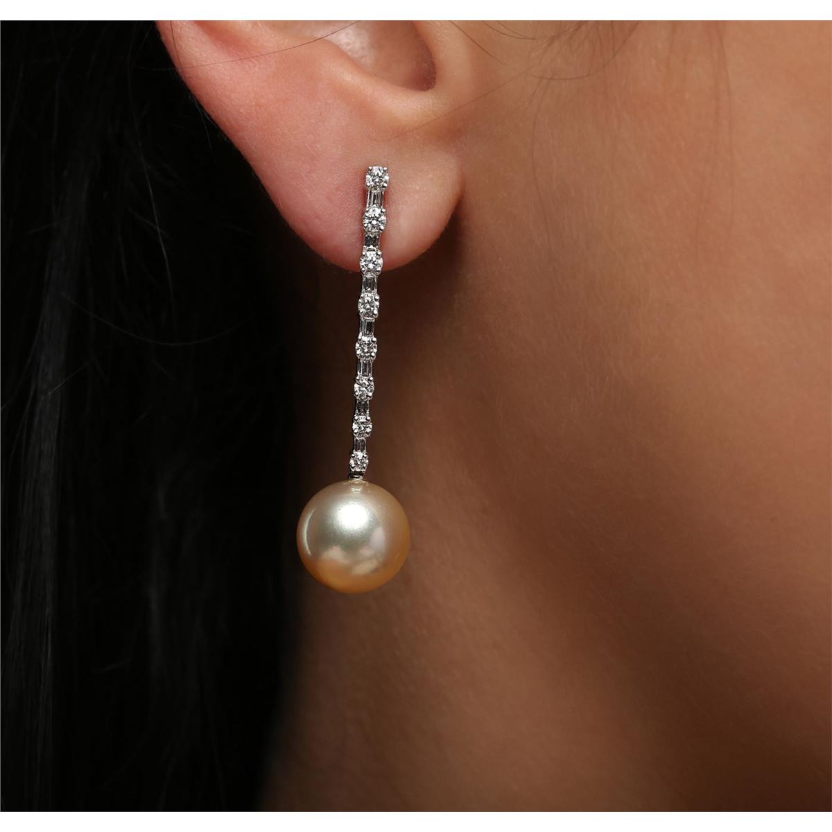 One pair of earrings featuring: 18KT white gold weighing 3.76 grams containing two pearls measuring 11.00 mm and 30 baguette/round cut diamonds with a total weight of 0.76cts.