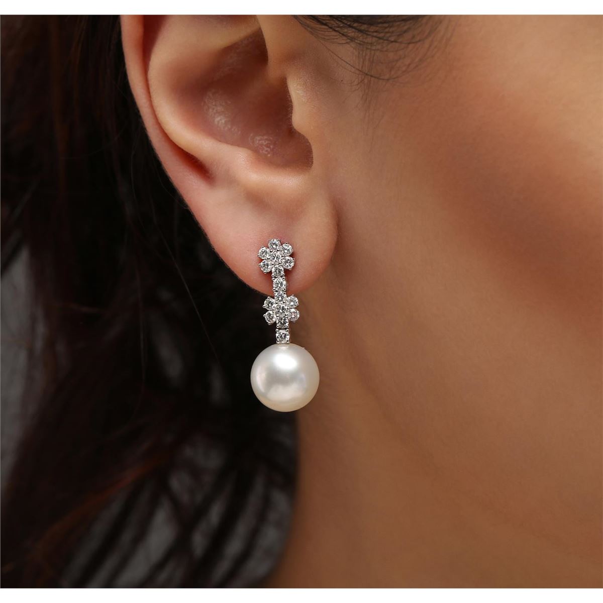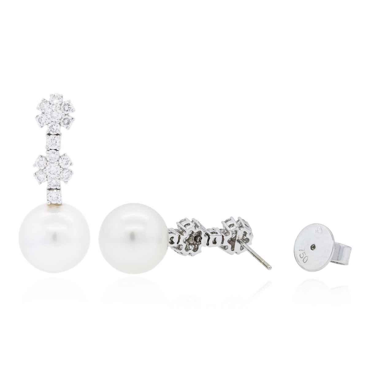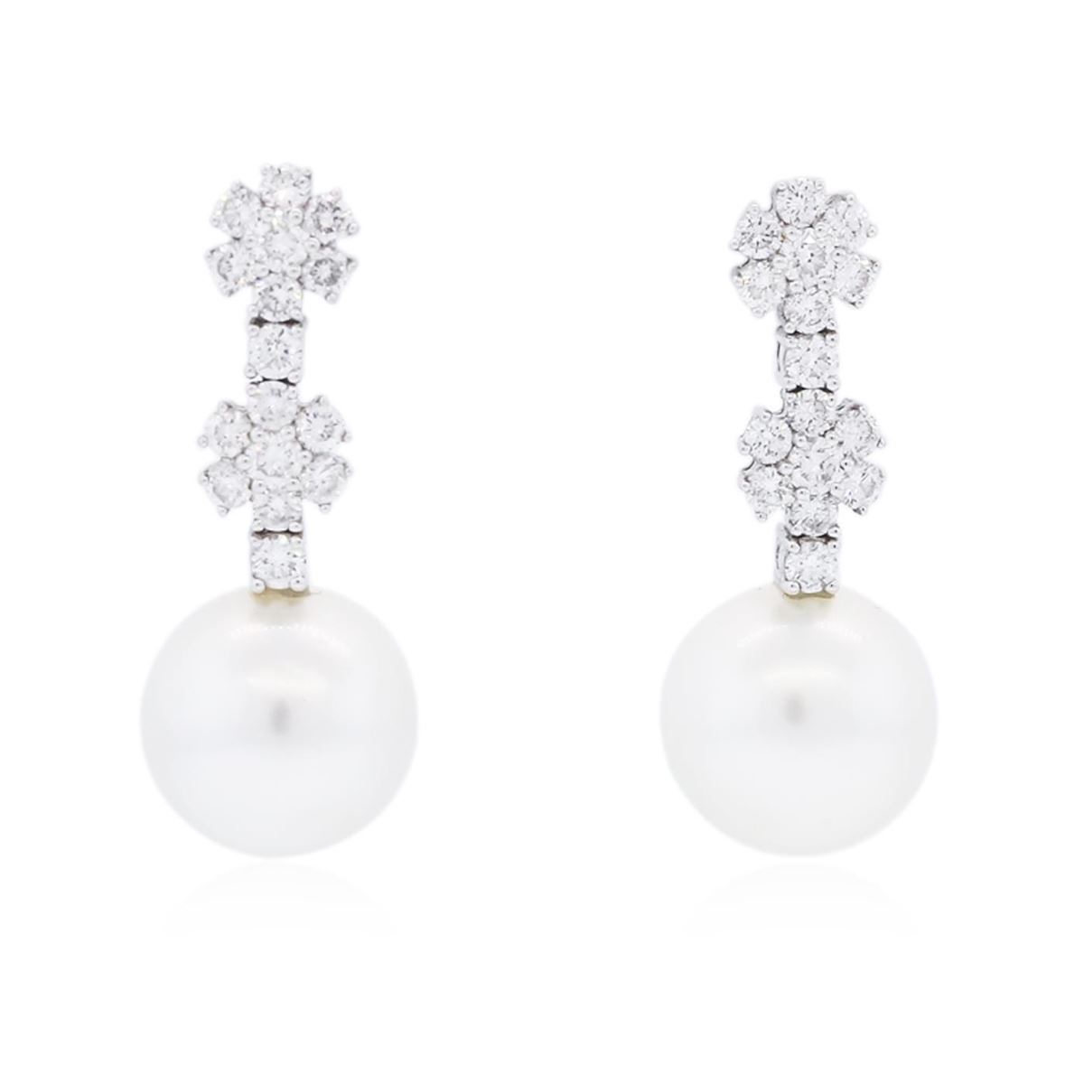 One pair of earrings featuring: 18KT white gold weighing 9.00 grams containing two pearls measuring approximately 12.00mm and round diamonds with a total weight of 1.50ct.