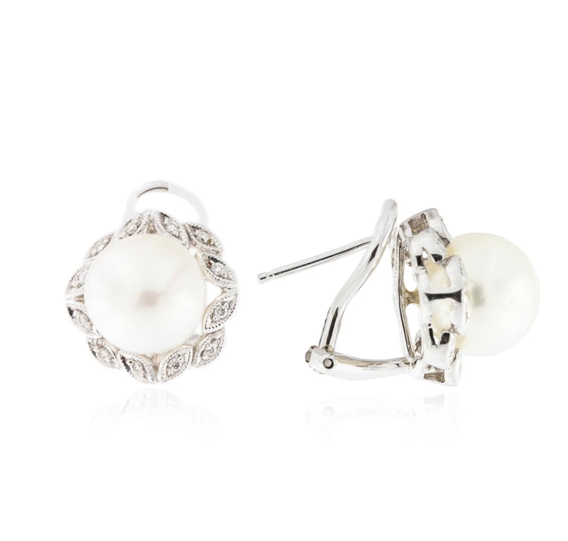 One pair of earrings featuring: 18KT white gold containing two pearls and diamonds with a total weight of 0.12ct. Total weight of item 8.3 grams.
