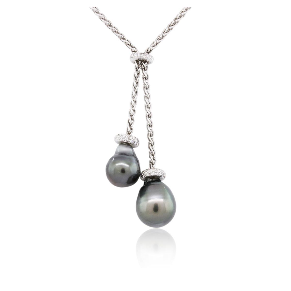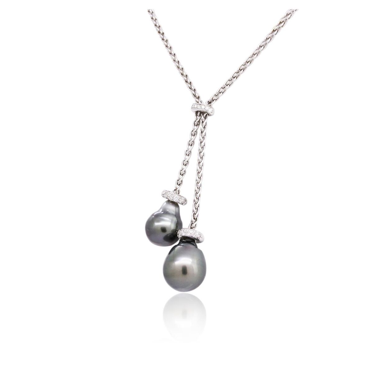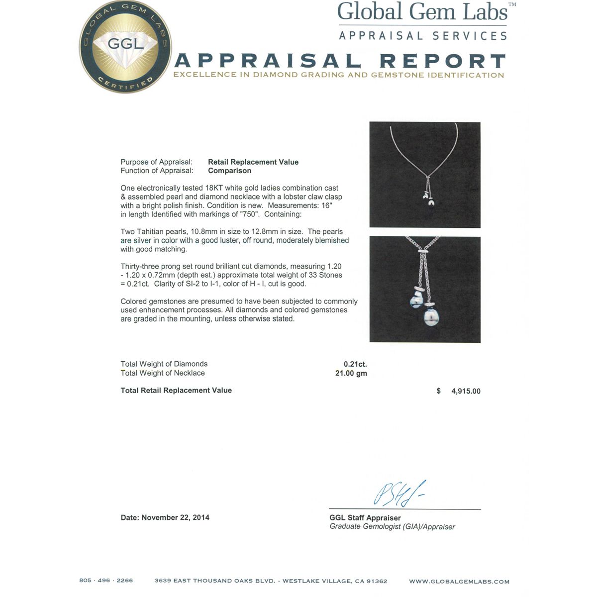 One electronically tested 18KT white gold ladies combination cast & assembled pearl and diamond necklace with a lobster claw clasp with a bright polish finish. Measurements: 16" in length Identified with markings of "750". Condition is new. Containing: Two Tahitian pearls, 10.8mm in size to 12.8mm in size. The pearls are silver in color with a good luster, off round, moderately blemished. Thirty-Three prong set round brilliant cut diamonds, measuring 1.20 - 1.20 x 0.72mm (depth est.) approximate total weight of 33 Stones = 0.21ct. Clarity: SI-2 to I-1. Color: H - I, Cut is Good. Colored gemstones are presumed to have been subjected to commonly used enhancement processes. All diamonds and colored gemstones are graded in the mounting, unless otherwise stated. Total Weight of Diamonds 0.21ct. Total Weight of Necklace 21.00 grams. GGL Appraised at $4,915.00.