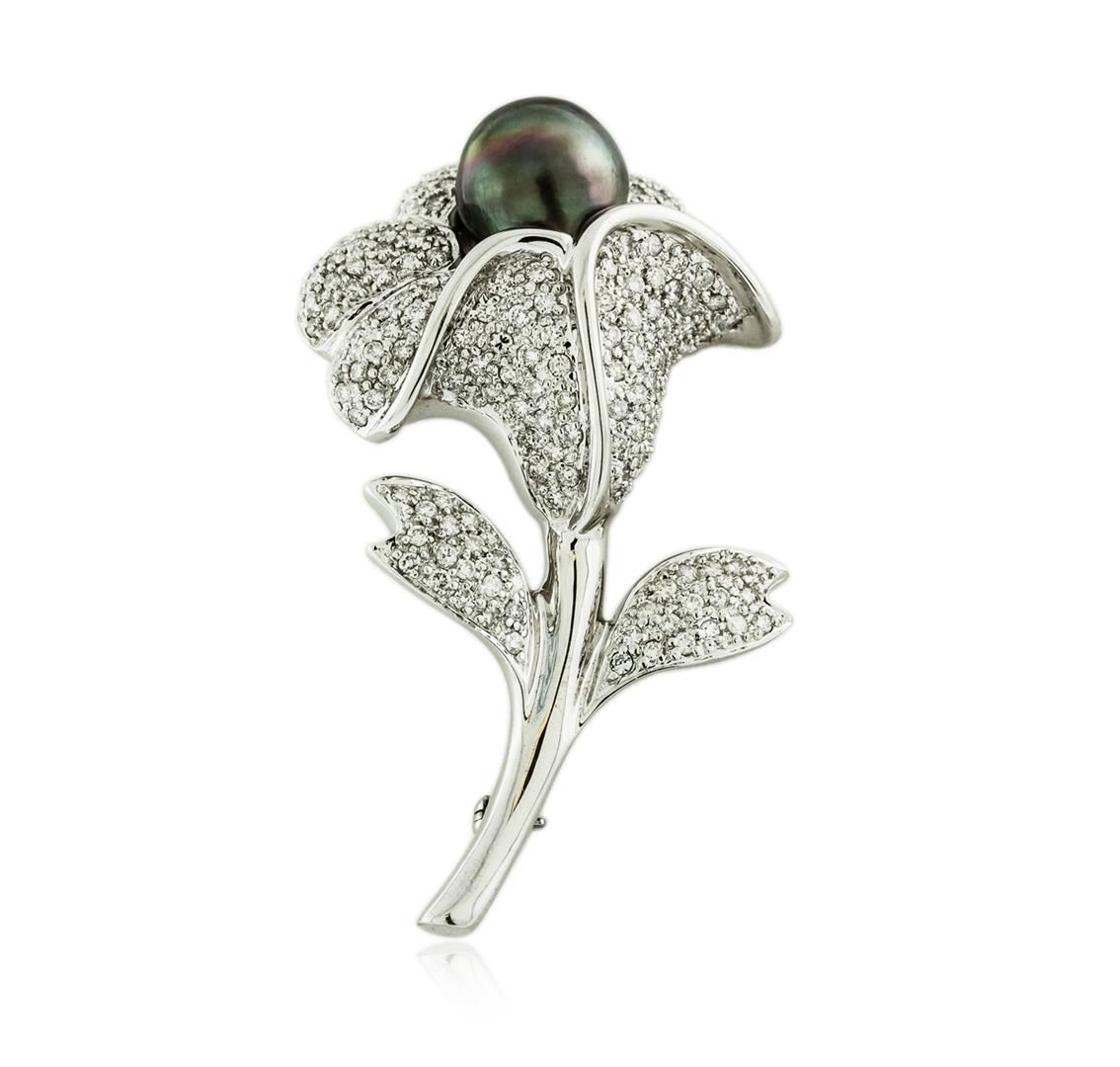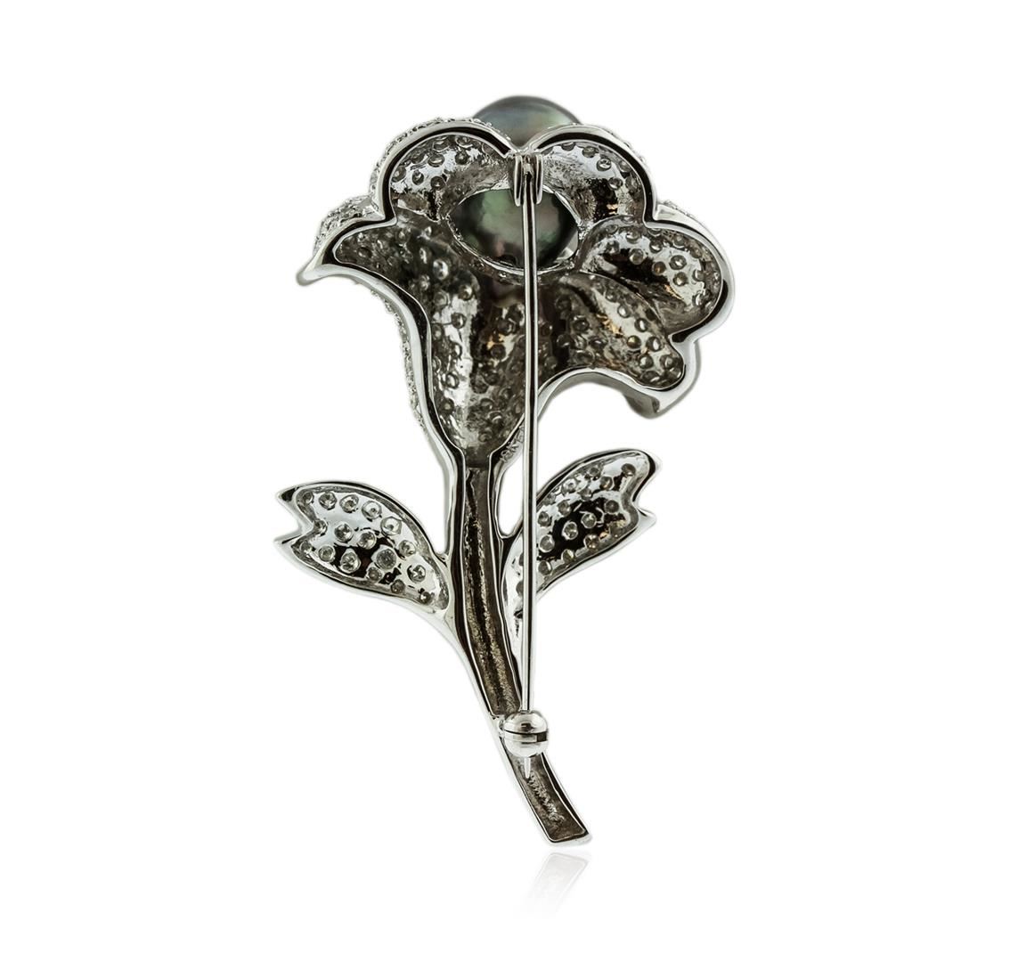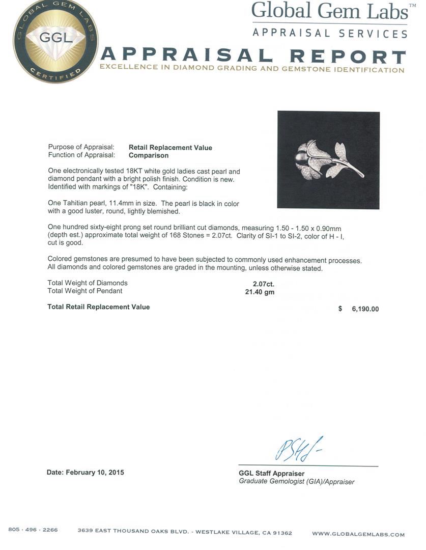 One electronically tested 18KT white gold ladies cast pearl and diamond pendant with a bright polish finish. Identified with markings of "18K". Condition is new. Containing: One Tahitian pearl, 11.4mm in size. The pearl is black in color with a good luster, round, lightly blemished. One Hundred Sixty-Eight prong set round brilliant cut diamonds, measuring 1.50 - 1.50 x 0.90mm (depth est.) approximate total weight of 168 Stones = 2.07ct. Clarity: SI-1 to SI-2. Color: H - I, Cut is Good. Colored gemstones are presumed to have been subjected to commonly used enhancement processes. All diamonds and colored gemstones are graded in the mounting, unless otherwise stated. Total Weight of Diamonds 2.07ct. Total Weight of Pendant 21.40 grams. GGL Appraised at $6,190.00.