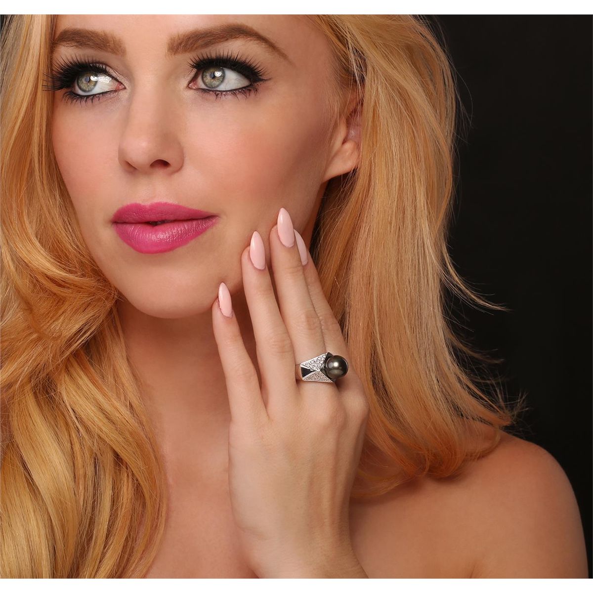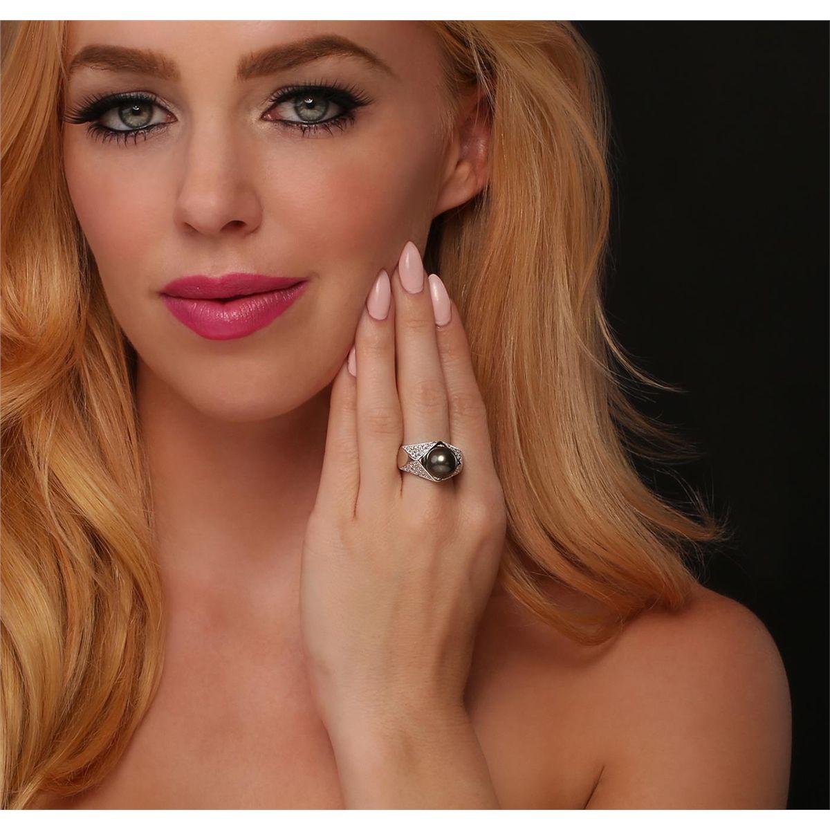 One electronically tested 18KT white gold ladies cast Tahitian cultured pearl and diamond ring with a bright polish finish. Condition is new, good workmanship. The featured Tahitian cultured pearl is set with stylized diamond shoulders, completed by a three and one-half millimeter wide band. Identified with markings of "750". Containing: One Tahitian cultured pearl, 11.0mm in size. The pearl is dark silver in color and exhibiting orient with a high luster, thick nacre, all round, lightly spotted Graded in the setting. Tahitian cultured pearls form in the large "Black Lipped" Pinctada Margaritifera oyster, which is about twice the size of the Japanese Akoya oyster. This warm water species from across the central and South Pacific Ocean is at home in the bays and lagoons of the islands & atolls of French Polynesia. Tahitian cultured pearl farmers generally raise their oysters in lagoons. Tahitian cultured pearls take from two to four years to form. Black pearls are known for their iridescent, vibrant, almost metallic natural colors, unique among saltwater cultured pearls. Though commonly called "Tahitian" pearls, they are actually gray, to a lighter or darker degree. Tahitian pearls have the unique ability to display a variety of colors at the same time, which can be seen glistening on their surface. Sixty-Four prong set round brilliant cut diamonds, measuring 1.50 - 1.40 x 0.87mm (depth est.) approximate. Total Weight of 64 Stones = 0.81ct. Graded in the setting. Clarity: SI-1 to SI-2. Color: G - I. Total Weight of Diamonds 0.81ct. Total Weight of Ring 10.11 grams. AIG Appraised at $5,935.00.
