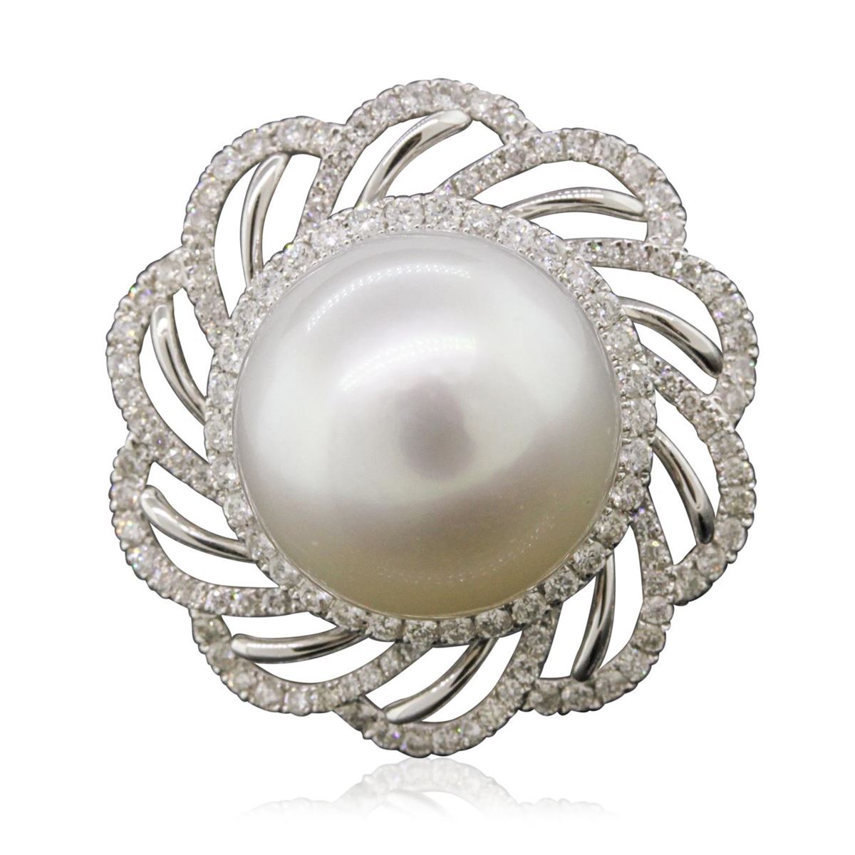 One ring featuring: 7.73 grams of 18KT white gold, (1) pearl measuring 15.00mm, (134) round cut diamonds with a total weight of 1.02cts.