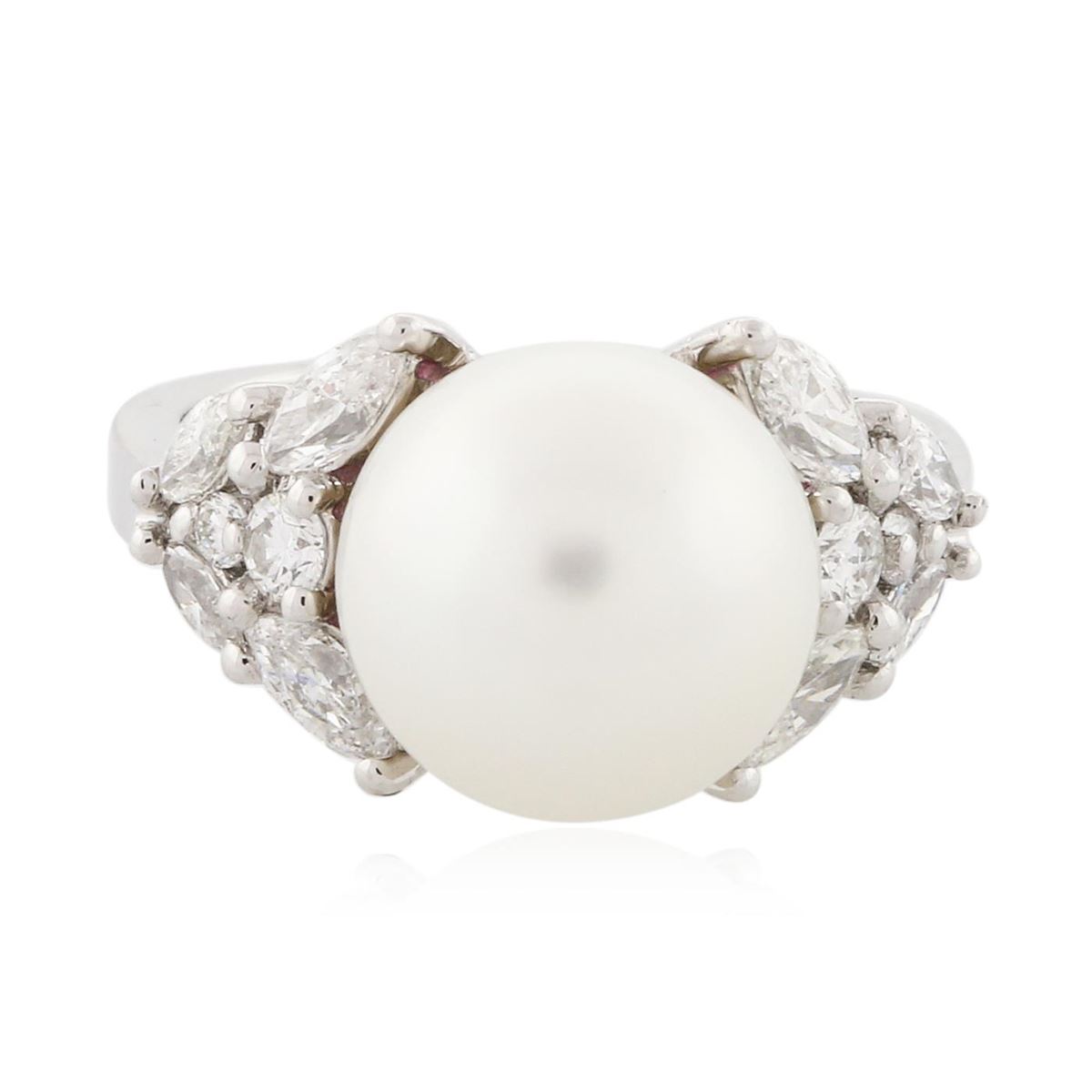 One electronically tested 18KT white gold ladies cast pearl and diamond ring with a bright polish finish. Identified with markings of "18K". Condition is new. Containing: One Chinese freshwater pearl, 10.9mm in size to 10.9mm in size. The pearl is white in color with a good luster, round, moderately blemished. Eight prong set marquise shaped cut diamonds, measuring 4.00. x 2.00. x 1.26mm (depth est.) approximate total weight of 8 Stones = 0.47ct. Clarity: SI-1. Color: I - J, Cut is Good. Four prong set round brilliant cut diamonds, measuring 2.20 - 1.50 x 1.11mm (depth est.) approximate total weight of 4 Stones = 0.09ct. Clarity: SI-1. Color: I - J, Cut is Good. Colored gemstones are presumed to have been subjected to commonly used enhancement processes. All diamonds and colored gemstones are graded in the mounting, unless otherwise stated. Total Weight of Diamonds 0.56ct. Total Weight of Ring 5.00. grams. GGL Appraised at $3,640.00.