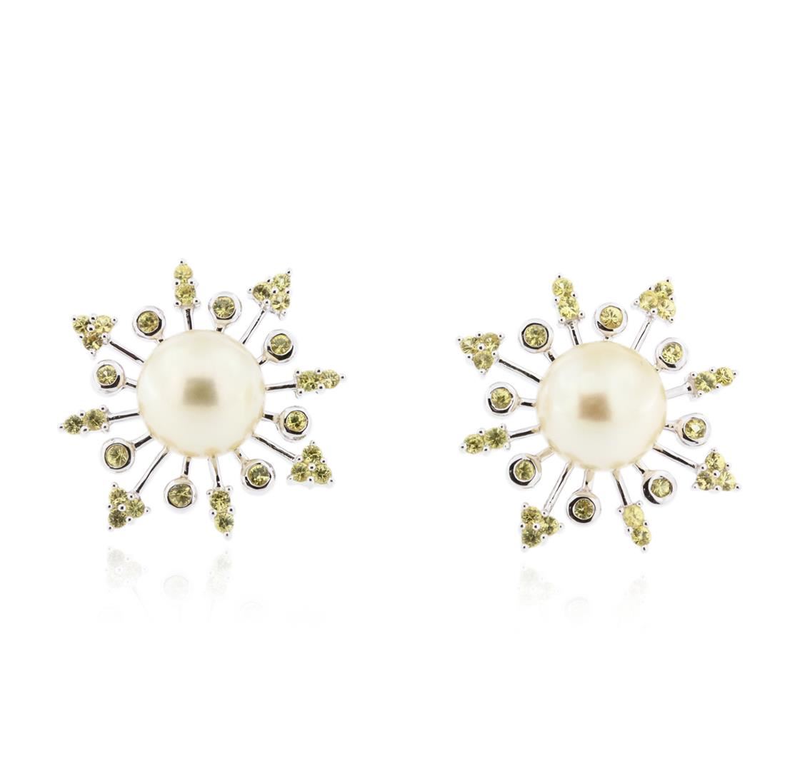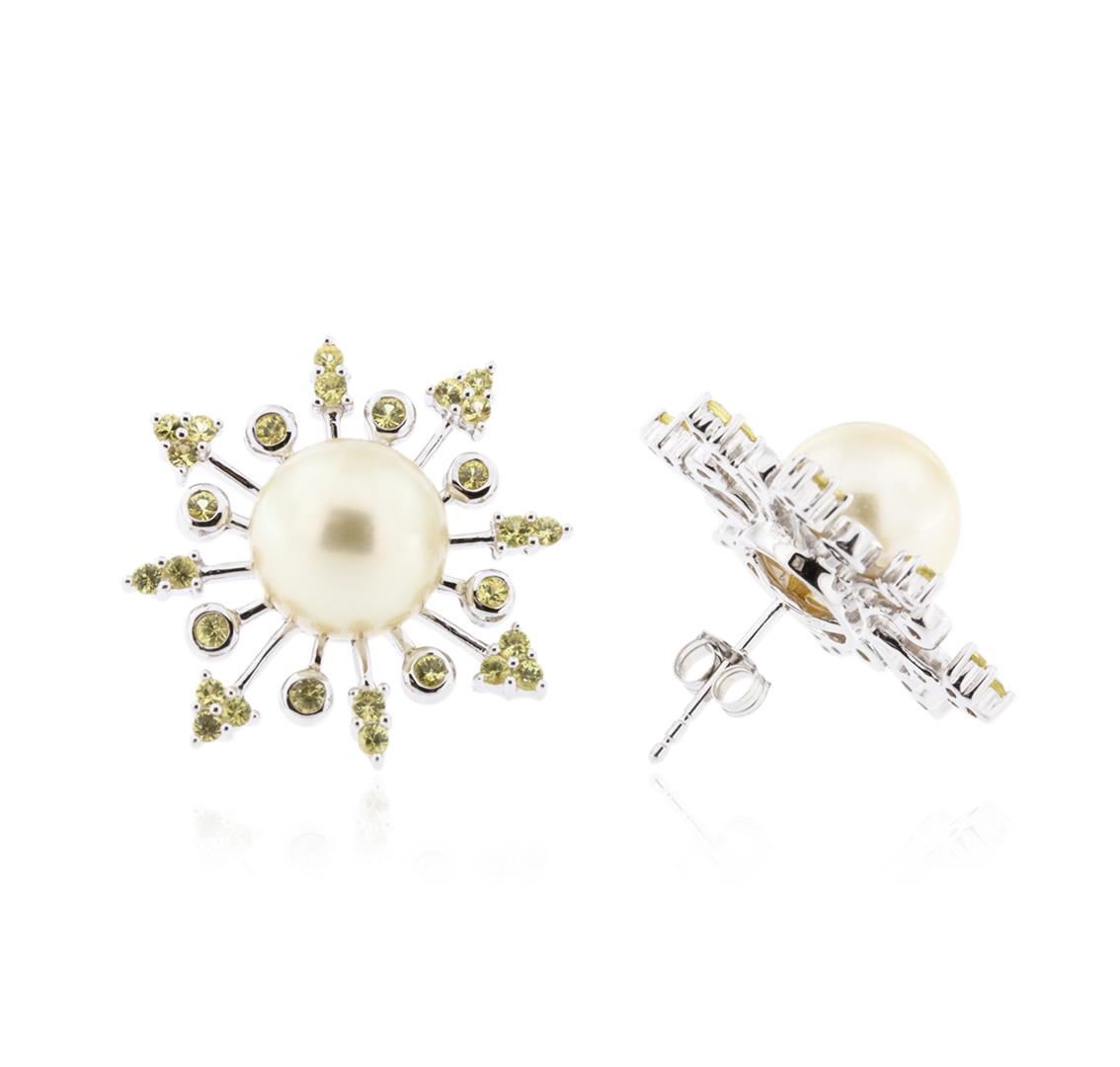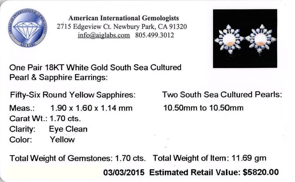 One pair of earrings featuring: 18KT white gold weighing 11.69 grams containing two south sea cultured pearls measuring 10.50mm and fifty-six round yellow sapphires with a total weight of 1.70ct. AIG Appraised at $5,820.00.
