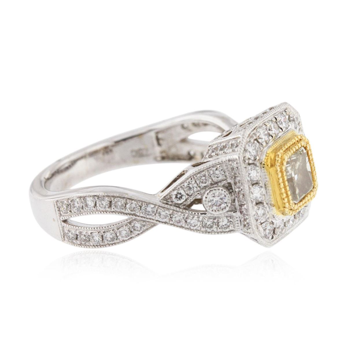 One electronically tested 18KT white and yellow gold Ladies combination cast & assembled engagement ring with a bright polish finish. Identified with markings of "18K". Condition is excellent. Containing: One bezel set radiant shaped cut diamond, measuring 4.30 x 4.00 x 0.00mm (depth est.) approximate weight of 0.78ct. Clarity of VS-2, Cut is Good. Sixty bead set round brilliant cut diamonds, measuring 1.50 - 1.50 x 0.90mm (depth est.) approximate total weight of 60 Stones = 0.72ct. Clarity of VS-2 to SI-1, Color of F, Cut is Very Good. Total Weight of Diamonds 1.50ct. Total Weight of Ring 6.30gm. GGL Appraised at $13,575.00.