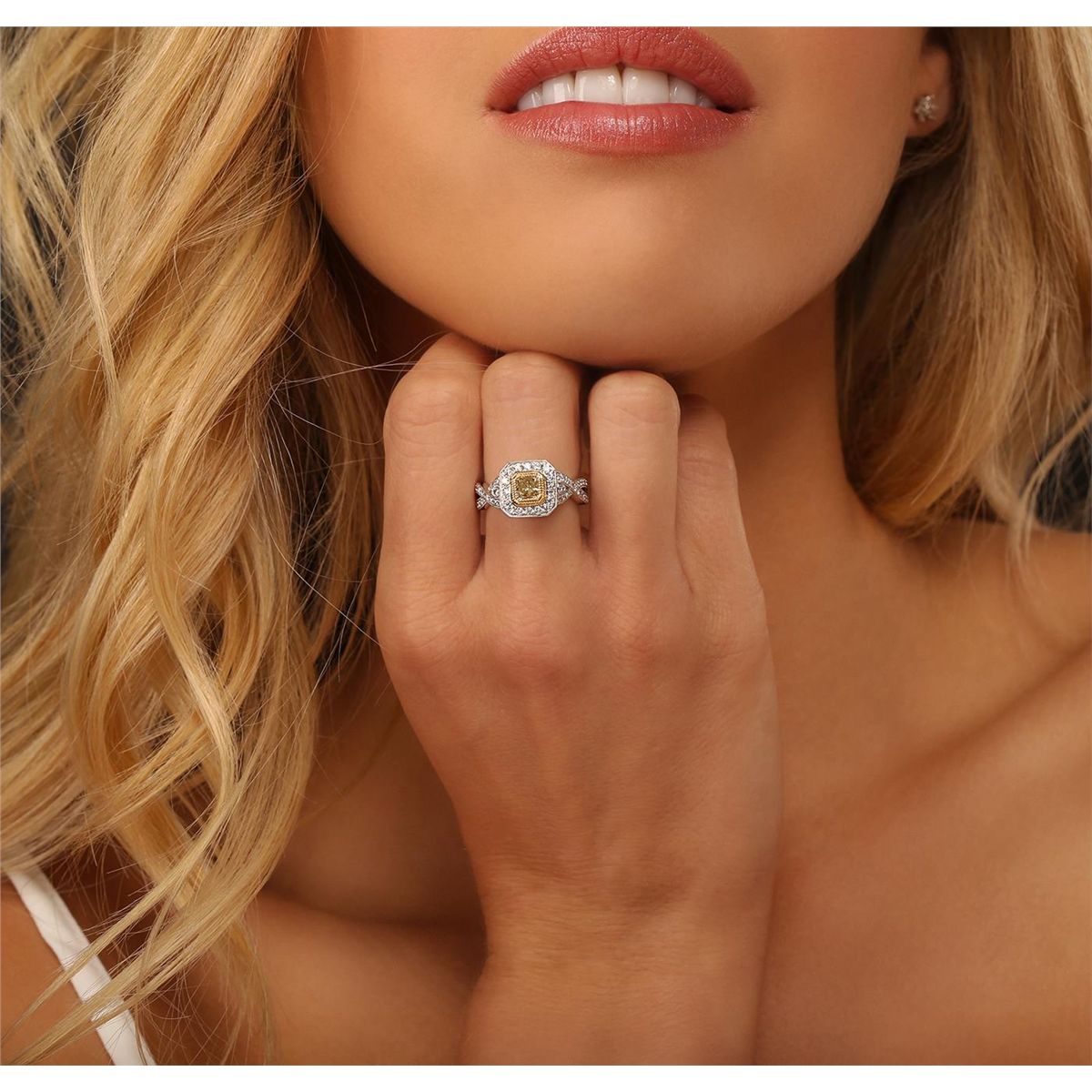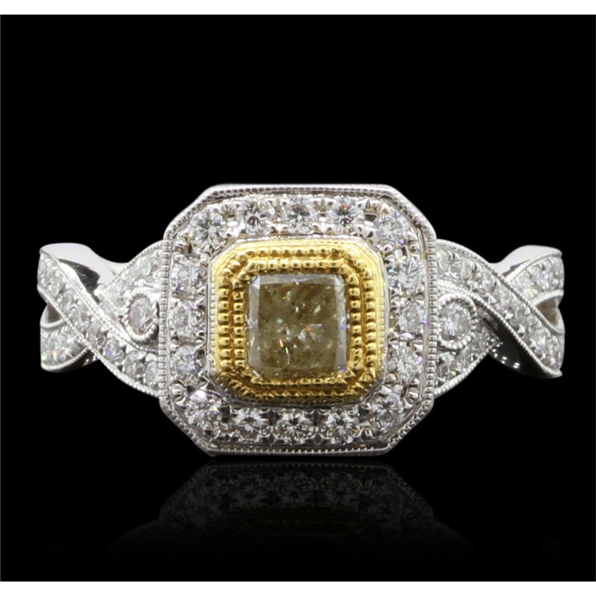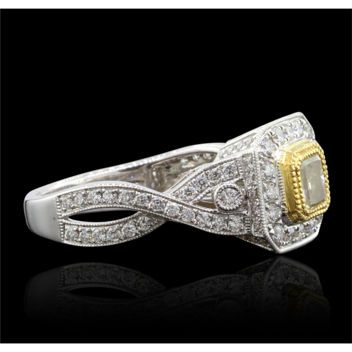 One electronically tested 18KT white and yellow gold Ladies combination cast & assembled engagement ring with a bright polish finish. Identified with markings of "18K". Condition is excellent. Containing: One bezel set radiant shaped cut diamond, measuring 4.30 x 4.00 x 0.00mm (depth est.) approximate weight of 0.78ct. Clarity of VS-2, Cut is Good. Sixty bead set round brilliant cut diamonds, measuring 1.50 - 1.50 x 0.90mm (depth est.) approximate total weight of 60 Stones = 0.72ct. Clarity of VS-2 to SI-1, Color of F, Cut is Very Good. Total Weight of Diamonds 1.50ct. Total Weight of Ring 6.30gm. GGL Appraised at $13,575.00.