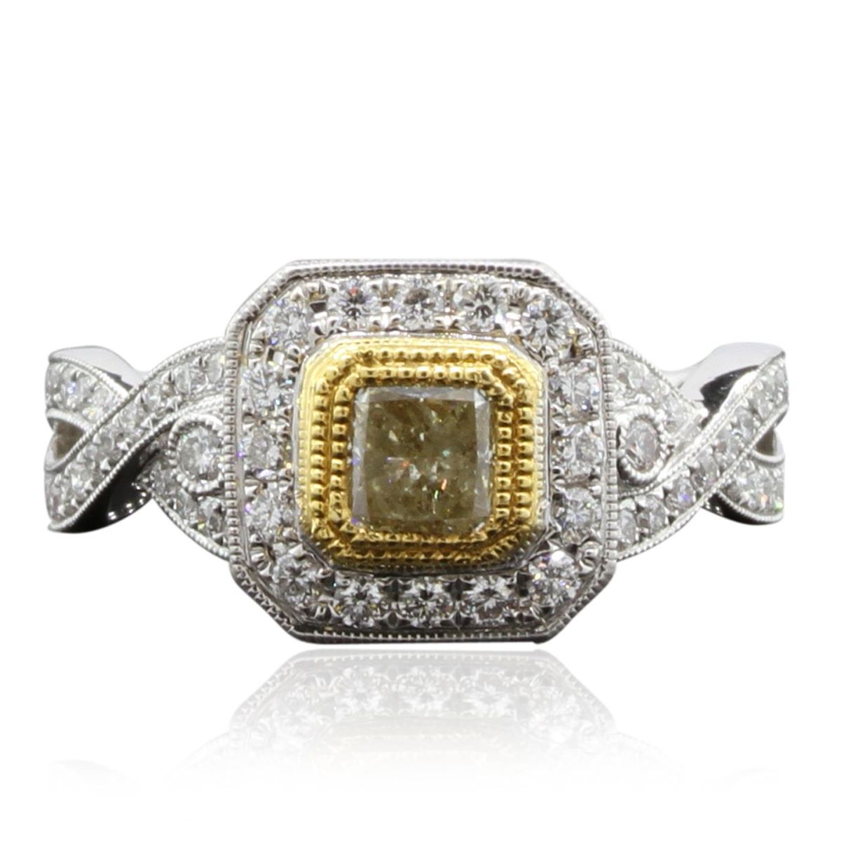 One electronically tested 18KT white and yellow gold Ladies combination cast & assembled engagement ring with a bright polish finish. Identified with markings of "18K". Condition is excellent. Containing: One bezel set radiant shaped cut diamond, measuring 4.30 x 4.00 x 0.00mm (depth est.) approximate weight of 0.78ct. Clarity of VS-2, Cut is Good. Sixty bead set round brilliant cut diamonds, measuring 1.50 - 1.50 x 0.90mm (depth est.) approximate total weight of 60 Stones = 0.72ct. Clarity of VS-2 to SI-1, Color of F, Cut is Very Good. Total Weight of Diamonds 1.50ct. Total Weight of Ring 6.30gm. GGL Appraised at $13,575.00.