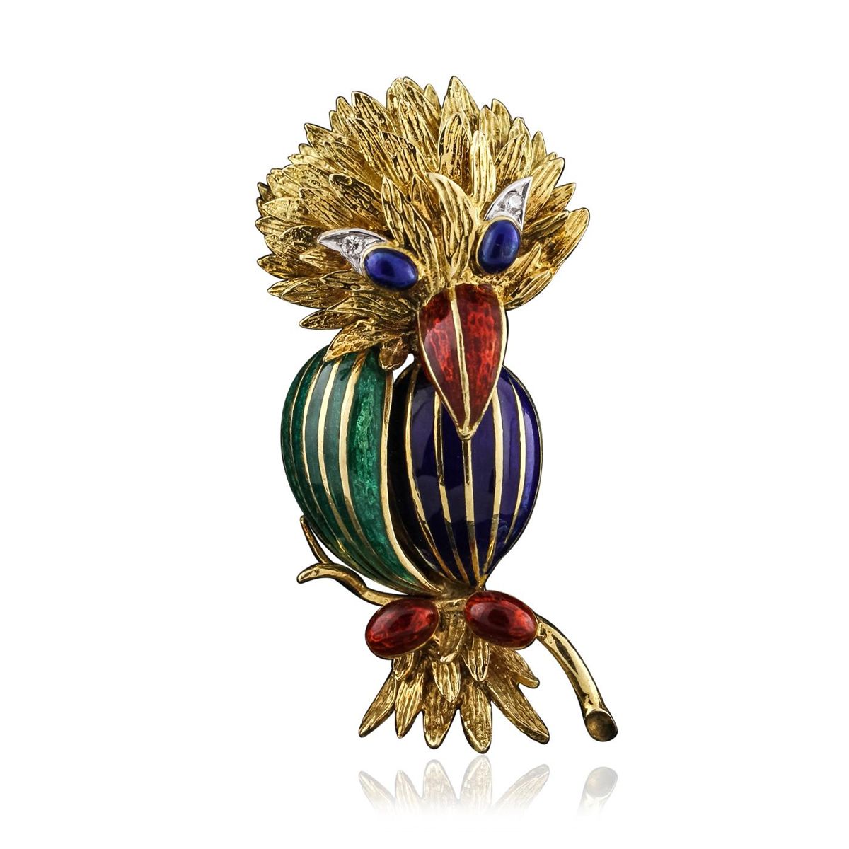 One electronically tested 18KT yellow gold and multicolor enamel ladies cast Bird pin with a bright polish finish. Measurements: 2.40" x 1.00.". Needle clasp closure. Identified with markings of "18K". Condition is very good. Containing: Two prong set round brilliant cut diamonds, measuring 1.80 - 1.80 x 1.08mm (depth est.) approximate total weight of 2 Stones = 0.04ct. Clarity: SI-1. Color: I, Cut is Good. All diamonds are graded in the mounting, unless otherwise stated. Total Weight of Diamonds 0.04ct. Total Weight of Pin 28.70 grams. GGL Appraised at $5,150.00.
