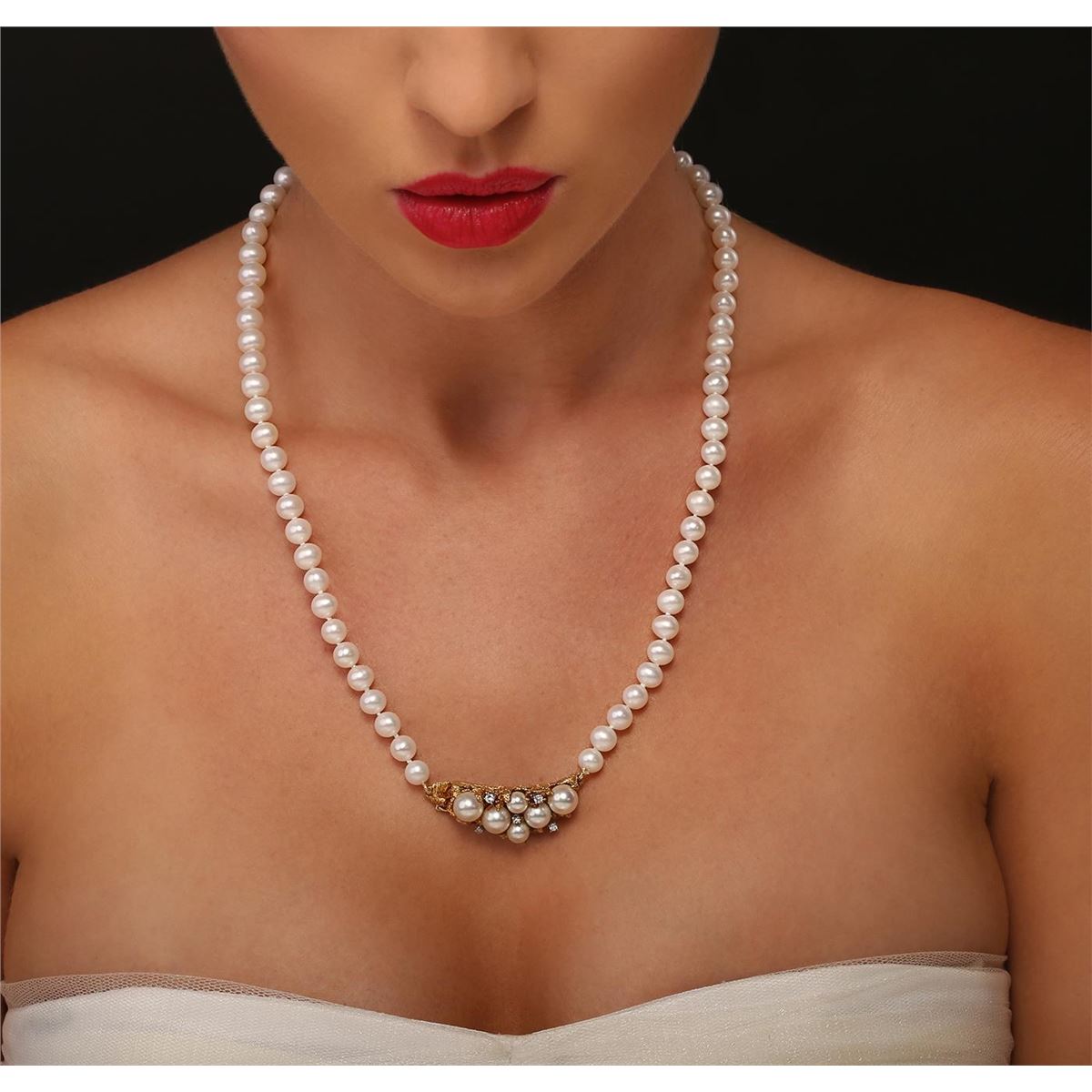 One varied single strand pearl necklace 19.0 inch matinee length, knotted with a hidden box clasp containing 77 cultured pearls, 6.0mm in size to 7.3mm in size. The pearls are white in color with a medium luster, medium nacre, off-round, spotted.Three prong set round brilliant cut diamonds, measuring 2.40 - 2.40 x 1.44mm (depth est.) approximate total weight of 3 Stones = 0.15ct. Clarity of SI-1 to SI-2, Color of G - H, Cut is Good. Two prong set single cut diamonds, measuring 1.60 - 1.60 x 0.96mm (depth est.) approximate total weight of 2 Stones = 0.03ct. Clarity of SI-1, Color of G, Cut is Good. Total Weight of Diamonds 0.18ct. Total Weight of Necklace 46.00gm. GGL Appraised at $7,475.00.