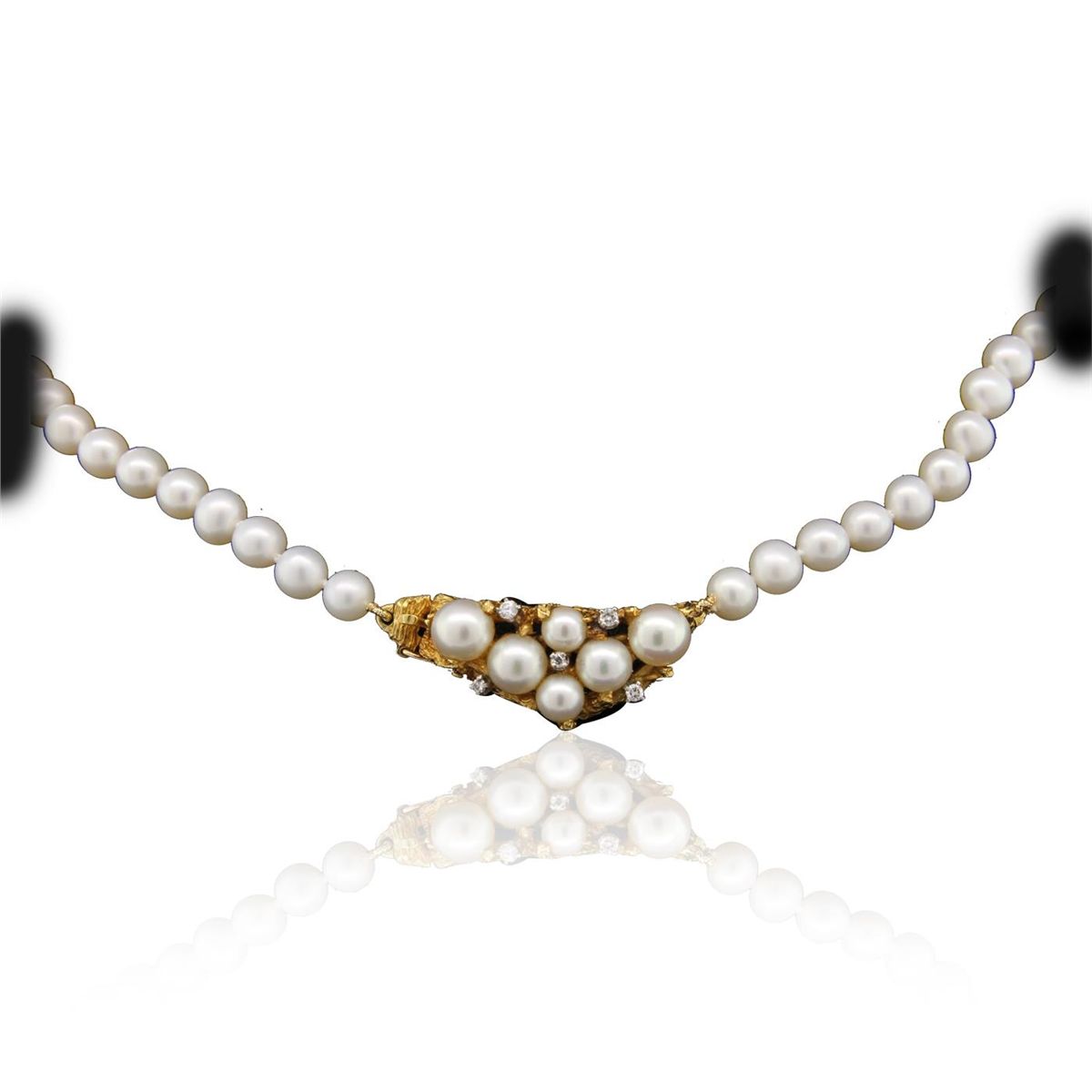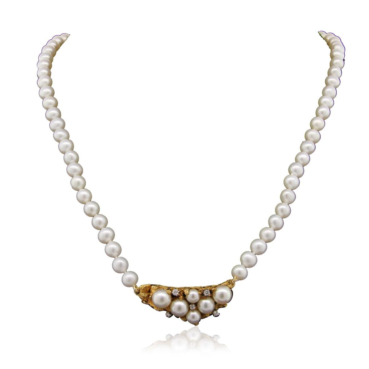 One varied single strand pearl necklace 19.0 inch matinee length, knotted with a hidden box clasp containing 77 cultured pearls, 6.0mm in size to 7.3mm in size. The pearls are white in color with a medium luster, medium nacre, off-round, spotted.Three prong set round brilliant cut diamonds, measuring 2.40 - 2.40 x 1.44mm (depth est.) approximate total weight of 3 Stones = 0.15ct. Clarity of SI-1 to SI-2, Color of G - H, Cut is Good. Two prong set single cut diamonds, measuring 1.60 - 1.60 x 0.96mm (depth est.) approximate total weight of 2 Stones = 0.03ct. Clarity of SI-1, Color of G, Cut is Good. Total Weight of Diamonds 0.18ct. Total Weight of Necklace 46.00gm. GGL Appraised at $7,475.00.