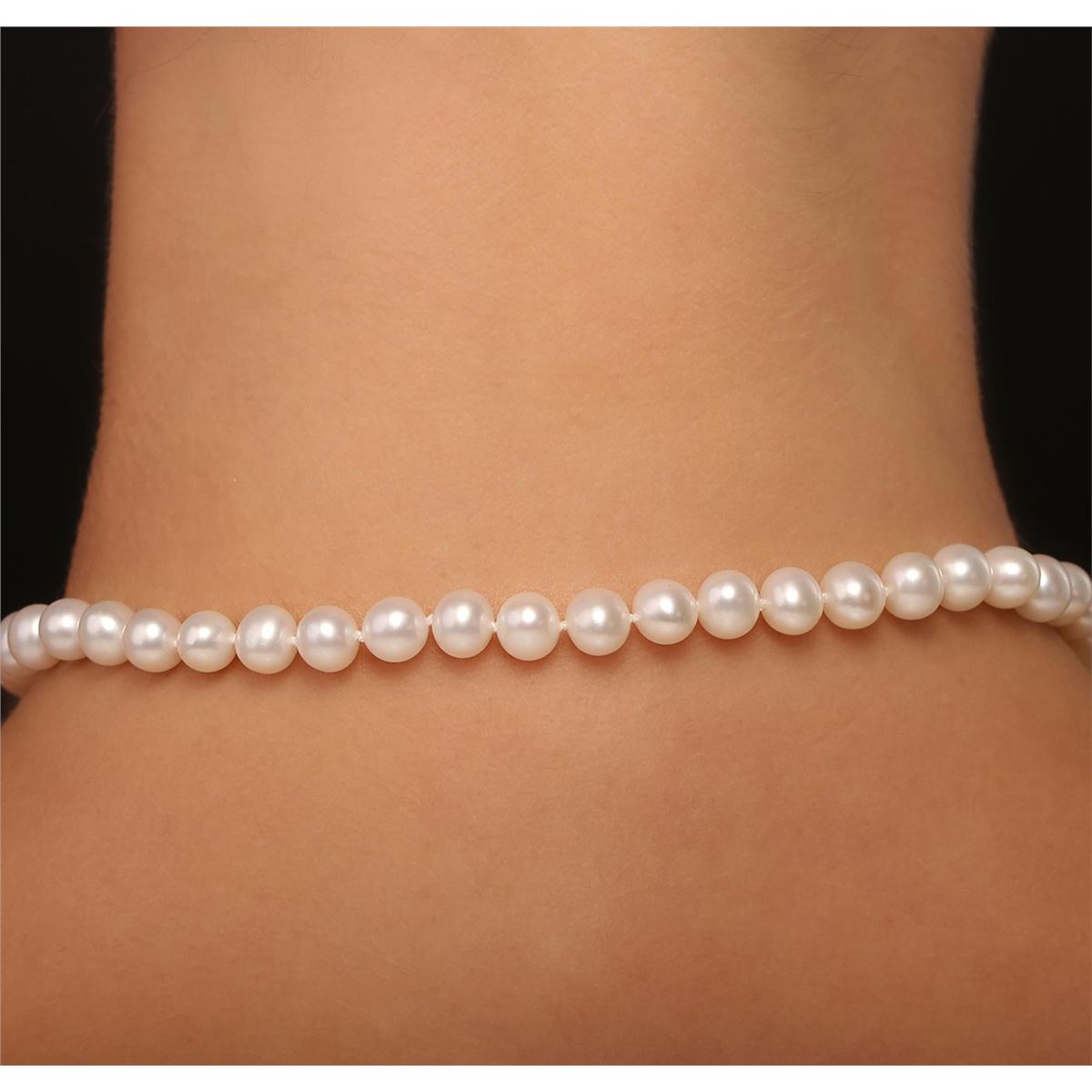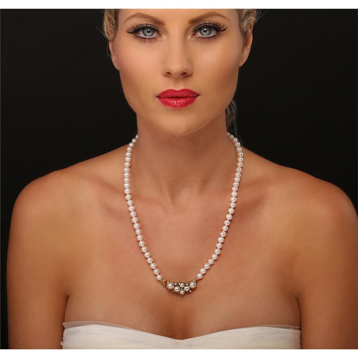 One varied single strand pearl necklace 19.0 inch matinee length, knotted with a hidden box clasp containing 77 cultured pearls, 6.0mm in size to 7.3mm in size. The pearls are white in color with a medium luster, medium nacre, off-round, spotted.Three prong set round brilliant cut diamonds, measuring 2.40 - 2.40 x 1.44mm (depth est.) approximate total weight of 3 Stones = 0.15ct. Clarity of SI-1 to SI-2, Color of G - H, Cut is Good. Two prong set single cut diamonds, measuring 1.60 - 1.60 x 0.96mm (depth est.) approximate total weight of 2 Stones = 0.03ct. Clarity of SI-1, Color of G, Cut is Good. Total Weight of Diamonds 0.18ct. Total Weight of Necklace 46.00gm. GGL Appraised at $7,475.00.