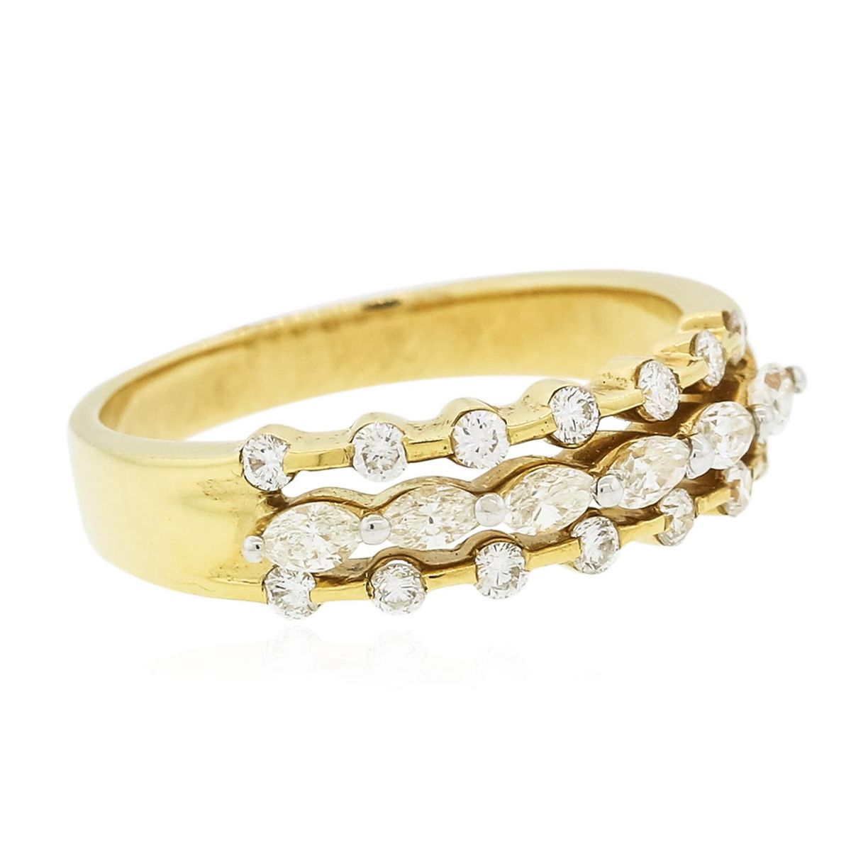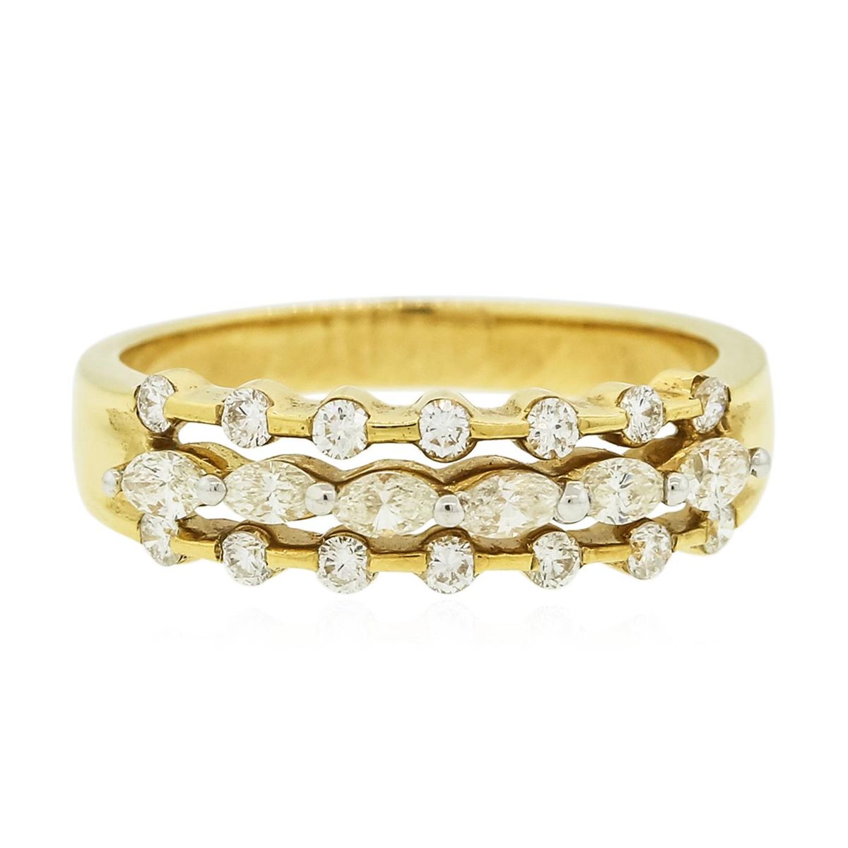One electronically tested 18KT yellow gold ladies cast diamond ring with a tapered shank with a bright polish finish. Identified with markings of "18K". Condition is new. Containing: Six prong set marquise shaped cut diamonds, measuring 3.00 x 1.80 x 1.13mm (depth est.) approximate total weight of 6 Stones = 0.21ct. Clarity: SI-1. Color: L, Cut is Good. Fourteen prong set round brilliant cut diamonds, measuring 1.50 - 1.50 x 0.90mm (depth est.) approximate total weight of 14 Stones = 0.17ct. Clarity: SI-1 to SI-2. Color: H - I, Cut is Good. All diamonds are graded in the mounting, unless otherwise stated. Total Weight of Diamonds 0.38ct. Total Weight of Ring 4.10 grams. GGL Appraised at $2,750.00.