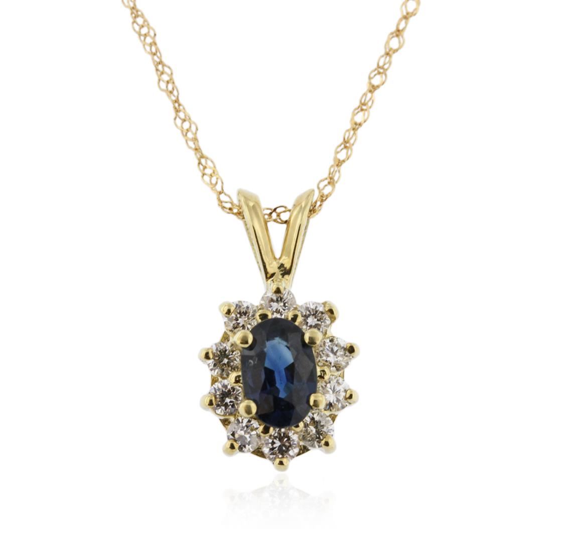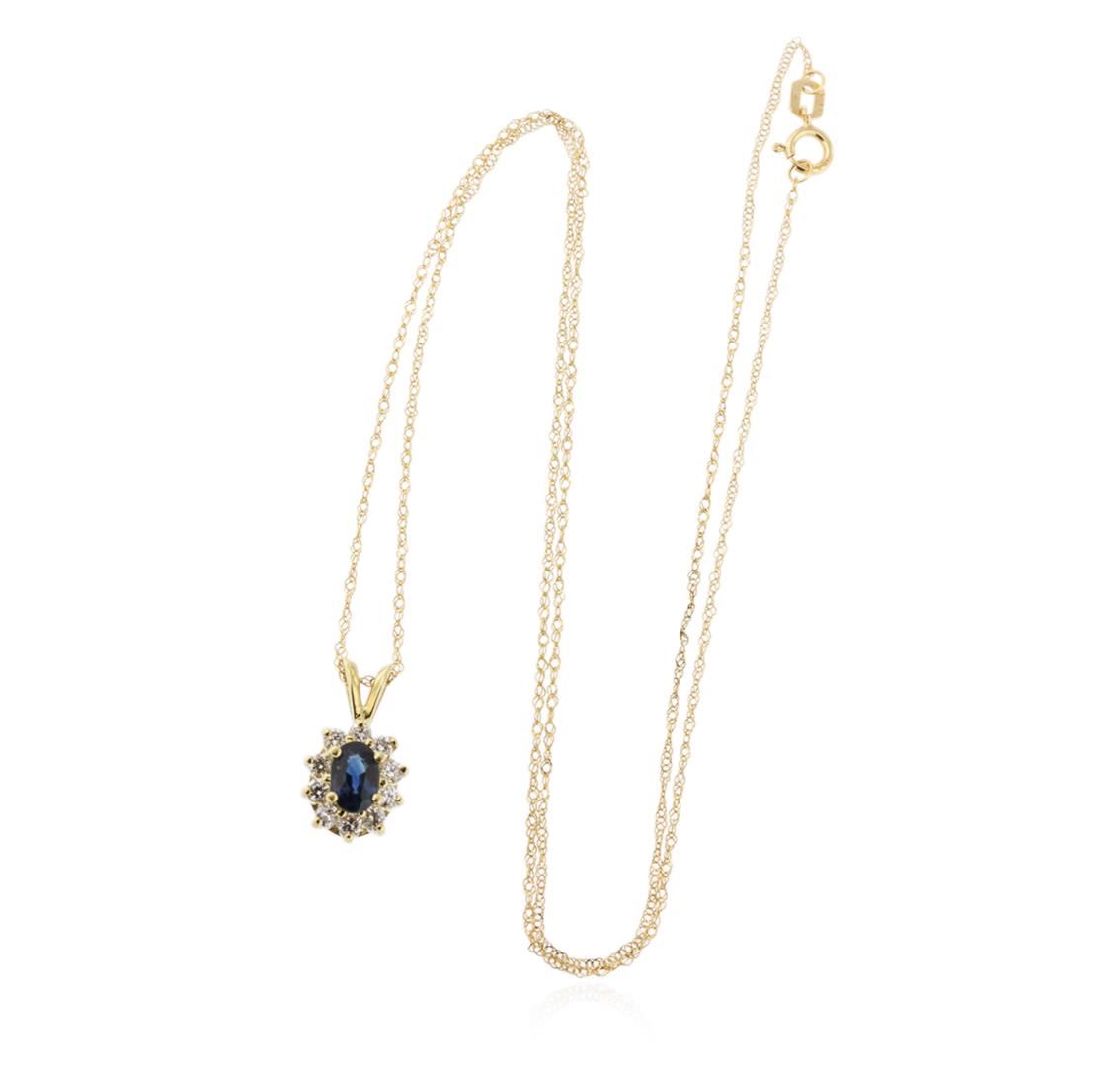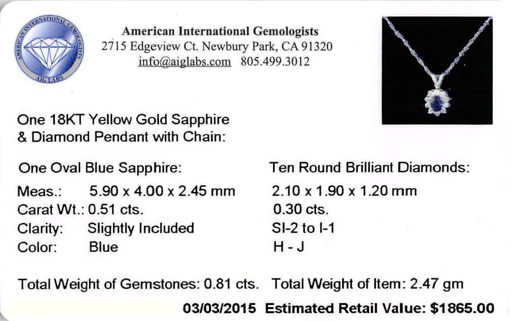 One pendant with chain featuring: 18KT yellow gold weighing 2.47 grams containing one oval blue sapphire with a total weight of 0.51ct and 10 round brilliant diamonds with a total weight of 0.30ct. AIG Appraised at $1,865.00.