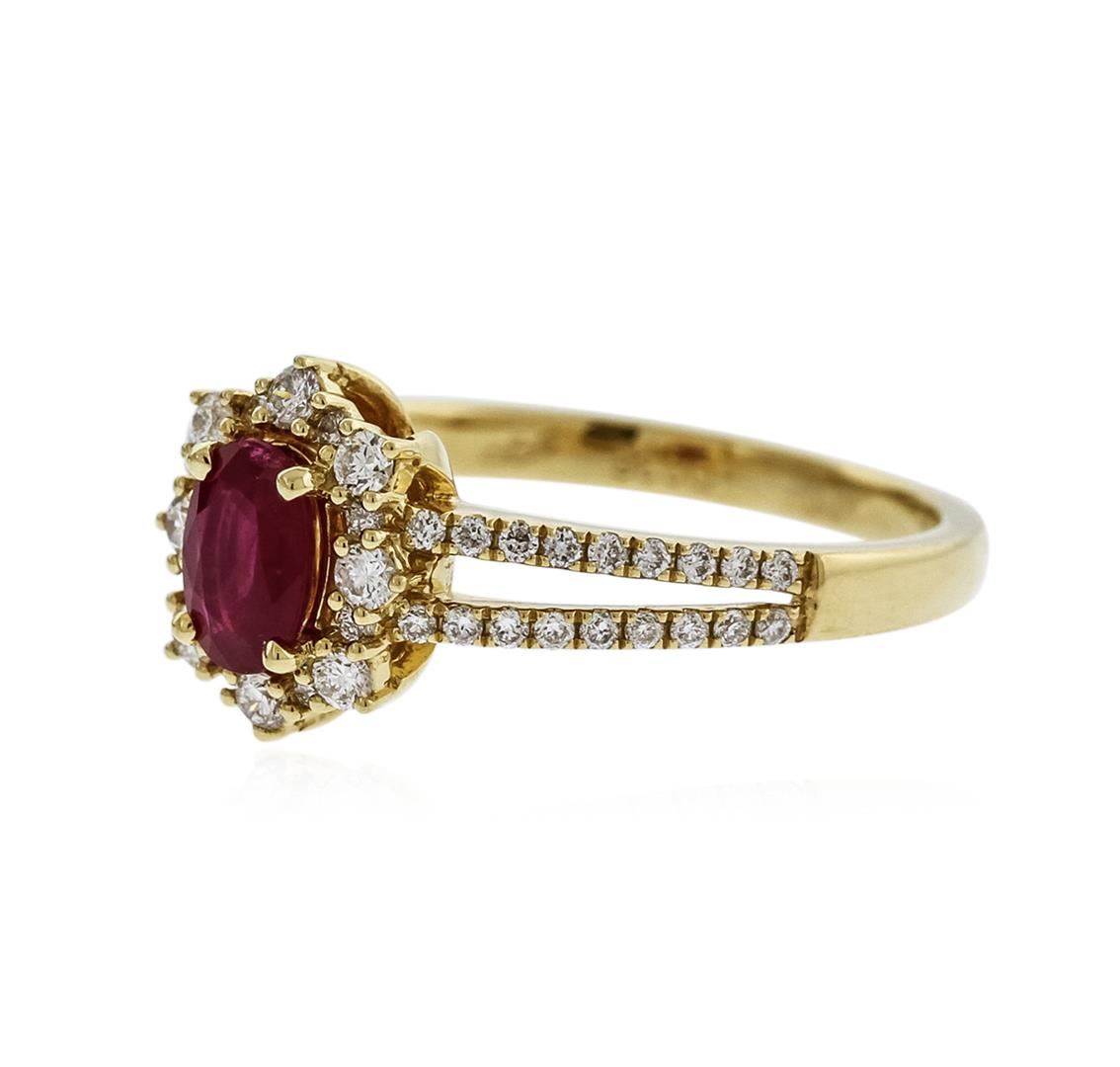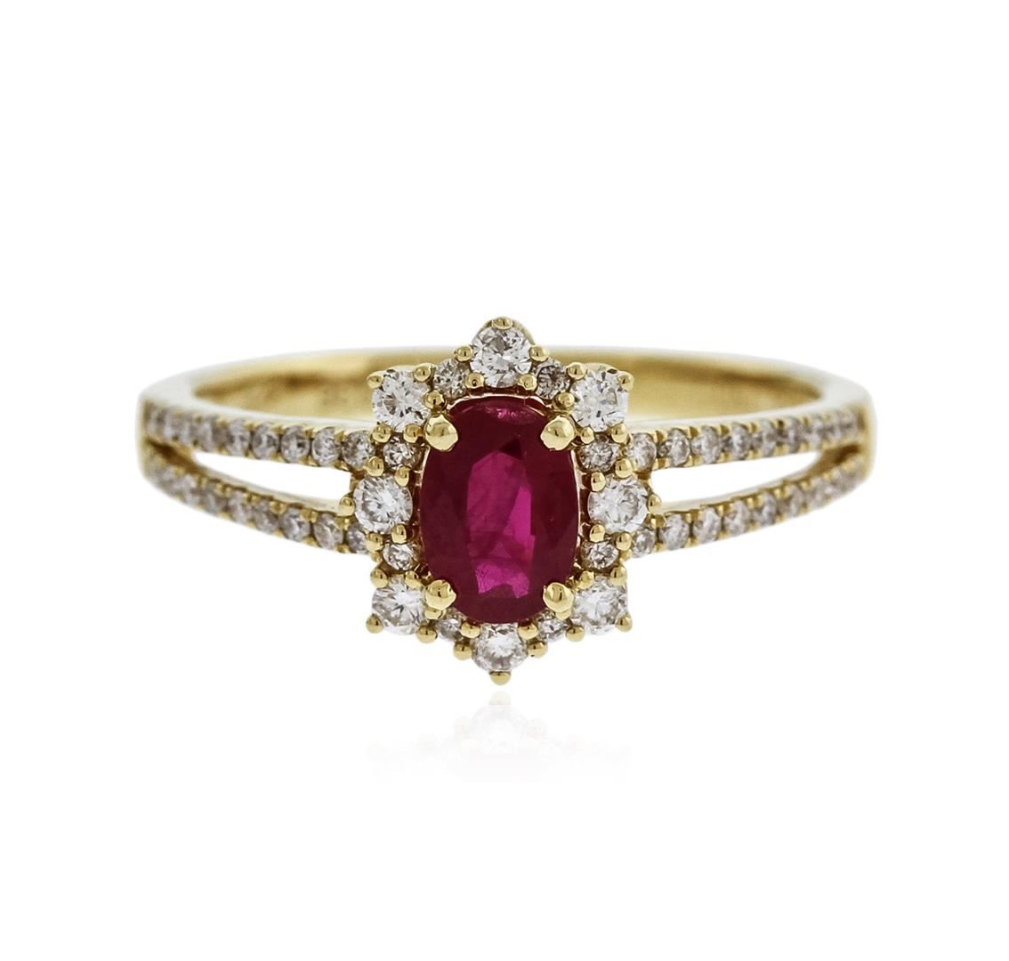 One ring featuring: 18KT yellow gold containing one ruby center stone with a total weight of 0.54ct and diamonds with a total weight of 0.36ct. Total weight of item 3.7 grams.
