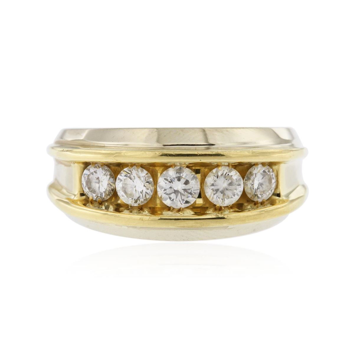 One electronically tested 18KT yellow gold cast diamond ring with a bright polish finish. Condition is new, good workmanship. The ring features a five diamond curvature supported by tapering shoulders, completed by a five millimeter wide band. Identified with markings of "18K". Containing: Five bead set round brilliant cut diamonds, measuring 3.90 - 3.70 x 2.28mm (depth est.) approximate. Total Weight of 5 Stones = 1.10ct. Graded in the setting. Clarity: SI-1 to SI-2. Color: F - G. Total Weight of Diamonds 1.10ct. Total Weight of Ring 13.00 grams. AIG Appraised at $8,290.00.