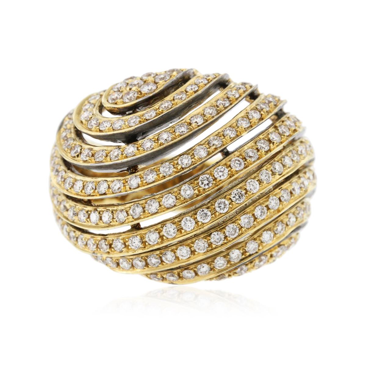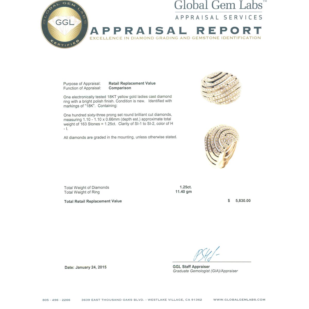 One electronically tested 18KT yellow gold ladies cast diamond ring with a bright polish finish. Identified with markings of "18K". Condition is new. Containing: One Hundred Sixty-Three prong set round brilliant cut diamonds, measuring 1.10 - 1.10 x 0.66mm (depth est.) approximate total weight of 163 Stones = 1.25ct. Clarity: SI-1 to SI-2. Color: H - I. All diamonds are graded in the mounting, unless otherwise stated. Total Weight of Diamonds 1.25ct. Total Weight of Ring 11.40 grams. GGL Appraised at $5,830.00.