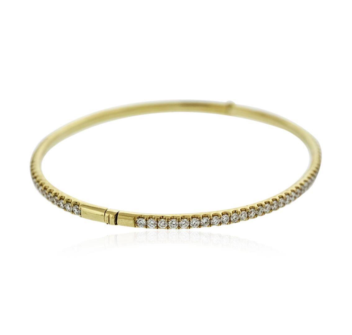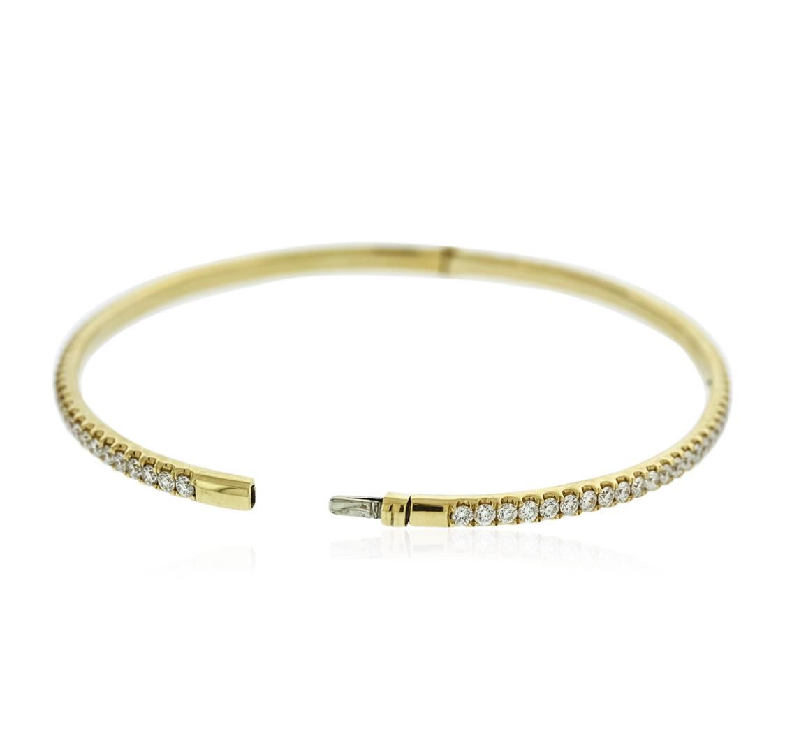 One electronically tested 18KT yellow gold ladies combination cast & assembled diamond bangle bracelet with a hidden box clasp with a bright polish finish. Trademark is Odelia. Identified with markings of "750". Condition is new. Containing: Eighty-Eight prong set round brilliant cut diamonds, measuring 1.60 - 1.60 x 0.96mm (depth est.) approximate total weight of 88 Stones = 1.31ct. Clarity: SI-1 to SI-2. Color: I - J, Cut is Very Good. All diamonds are graded in the mounting, unless otherwise stated. Total Weight of Diamonds 1.31ct. Total Weight of Bangle Bracelet 9.30 grams. GGL Appraised at $5,710.00.