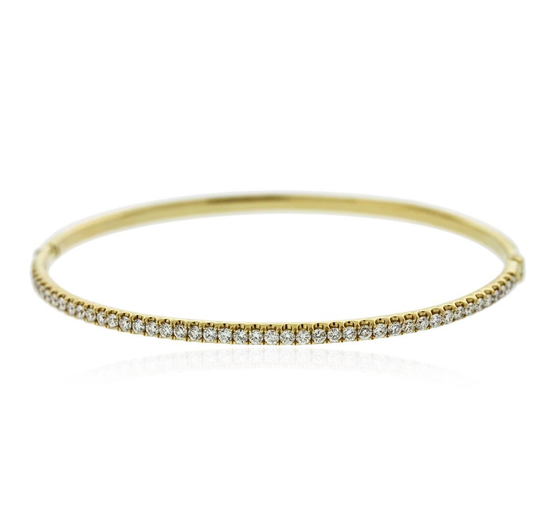 One electronically tested 18KT yellow gold ladies combination cast & assembled diamond bangle bracelet with a hidden box clasp with a bright polish finish. Trademark is Odelia. Identified with markings of "750". Condition is new. Containing: Eighty-Eight prong set round brilliant cut diamonds, measuring 1.60 - 1.60 x 0.96mm (depth est.) approximate total weight of 88 Stones = 1.31ct. Clarity: SI-1 to SI-2. Color: I - J, Cut is Very Good. All diamonds are graded in the mounting, unless otherwise stated. Total Weight of Diamonds 1.31ct. Total Weight of Bangle Bracelet 9.30 grams. GGL Appraised at $5,710.00.