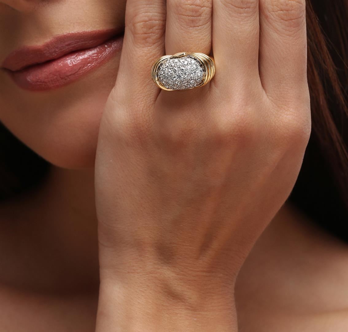 One electronically tested 18KT yellow gold ladies cast diamond ring with a bright polish finish. Condition is new. Containing: Thirty-Seven pave' set round brilliant cut diamonds, measuring 2.50 - 1.80 x 1.29mm (depth est.) approximate total weight of 37 Stones = 1.34ct. Clarity: SI-1 to SI-2. Color: H - I. All diamonds are graded in the mounting, unless otherwise stated. Total Weight of Diamonds 1.34ct. Total Weight of Ring 10.30 grams. GGL Appraised at $6,345.00.