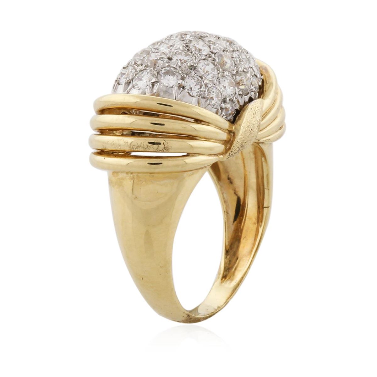 One electronically tested 18KT yellow gold ladies cast diamond ring with a bright polish finish. Condition is new. Containing: Thirty-Seven pave' set round brilliant cut diamonds, measuring 2.50 - 1.80 x 1.29mm (depth est.) approximate total weight of 37 Stones = 1.34ct. Clarity: SI-1 to SI-2. Color: H - I. All diamonds are graded in the mounting, unless otherwise stated. Total Weight of Diamonds 1.34ct. Total Weight of Ring 10.30 grams. GGL Appraised at $6,345.00.