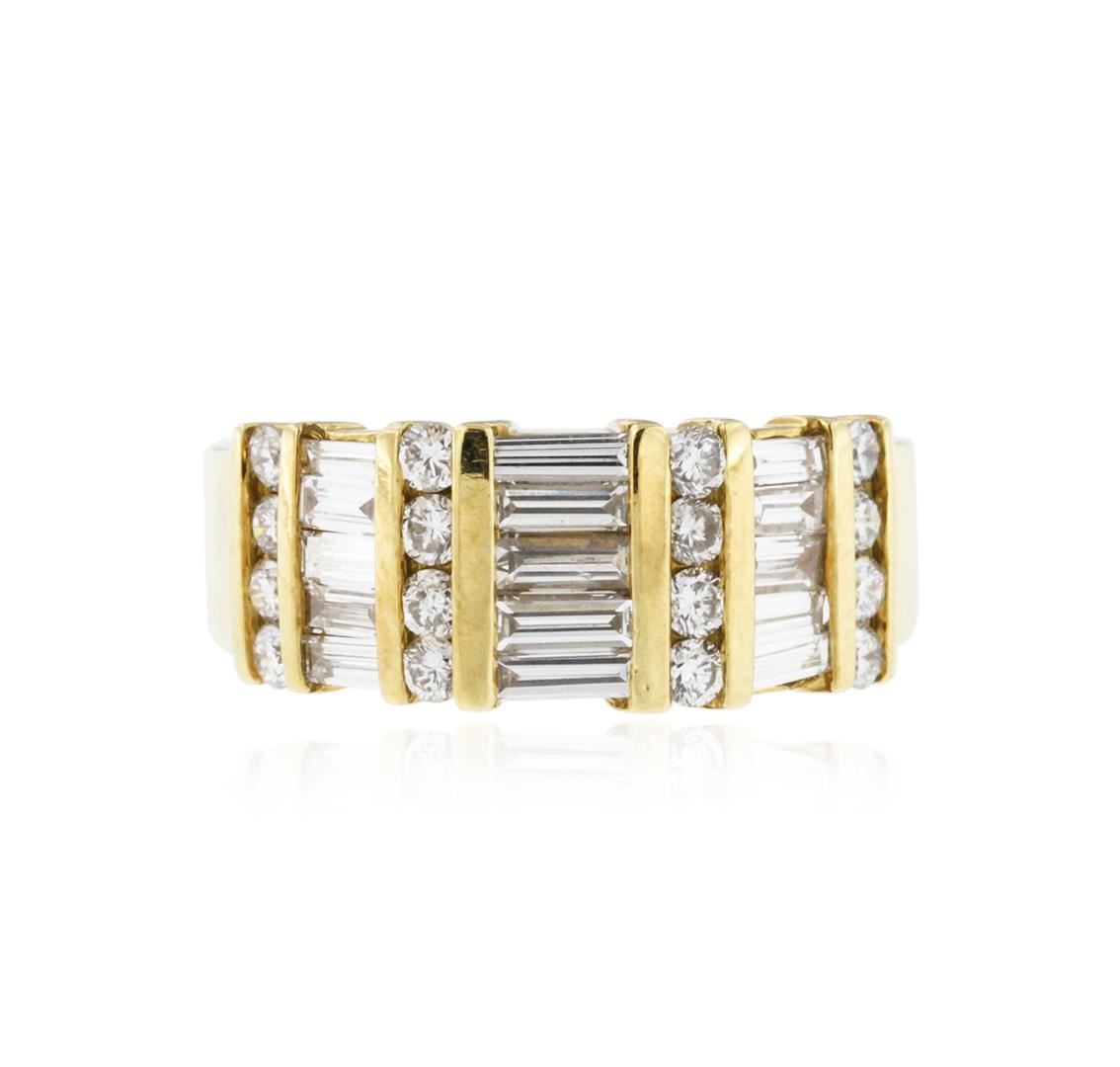 One electronically tested 18KT yellow gold ladies cast diamond ring with a bright polish finish. Identified with markings of "18K". Condition is new. Containing: Sixteen channel set round brilliant cut diamonds, measuring 1.80 - 1.80 x 1.08mm (depth est.) approximate total weight of 16 Stones = 0.34ct. Clarity: SI-1 to I-1. Color: G - H, Cut is Good. Fifteen channel set baguette cut diamonds, measuring 4.00 x 1.50 x 1.28mm (depth est.) approximate total weight of 15 Stones = 1.05ct. Clarity: VS-2 to SI-1. Color: G - H, Cut is Good. All diamonds are graded in the mounting, unless otherwise stated. Total Weight of Diamonds 1.39ct. Total Weight of Ring 10.00 grams. GGL Appraised at $5,700.00.