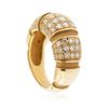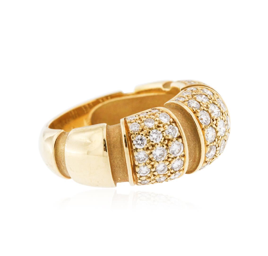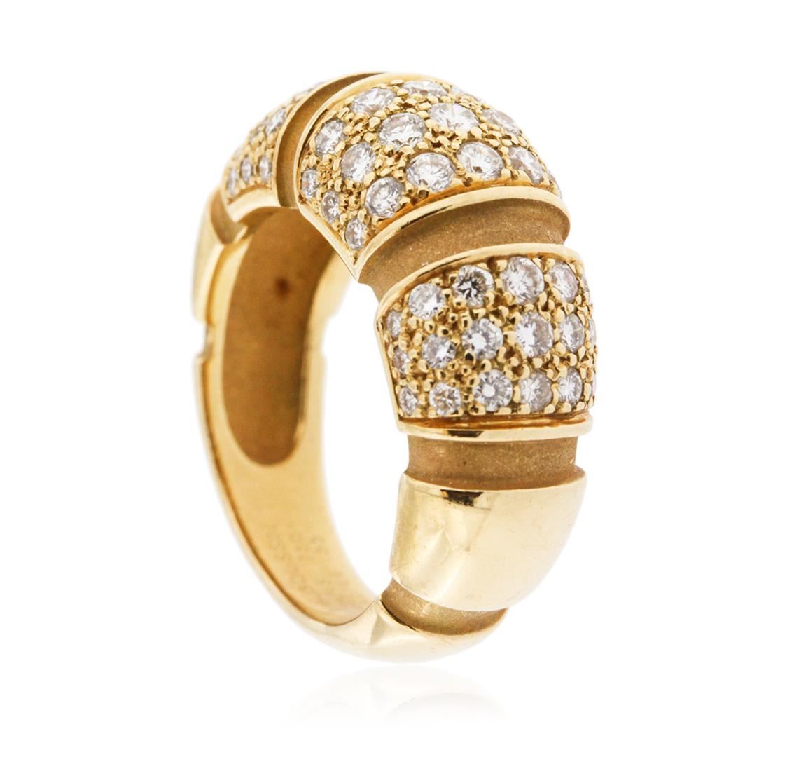 One electronically tested 18KT yellow gold ladies cast diamond ring with a bright polish finish. The ring features an organized domed diamond set curvature, completed by a four and one-half millimeter wide band. Trademark is MAUBOUSSIN. Identified with markings of "750". Condition is good. Containing: Eighty-Four pave set round brilliant cut diamonds, measuring 2.10 - 1.60 x 1.11mm (depth est.) approximate total weight of 84 Stones = 1.50ct. Graded in the setting. Clarity: VVS-2 to VS-2. Color: G - I. Total Weight of Diamonds 1.50ct. Total Weight of Ring 9.82 grams. AIG Appraised at $6,275.00.