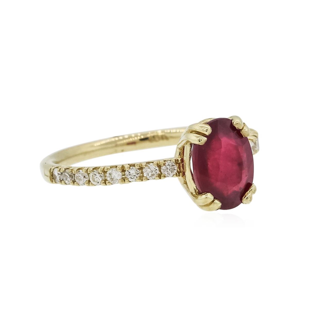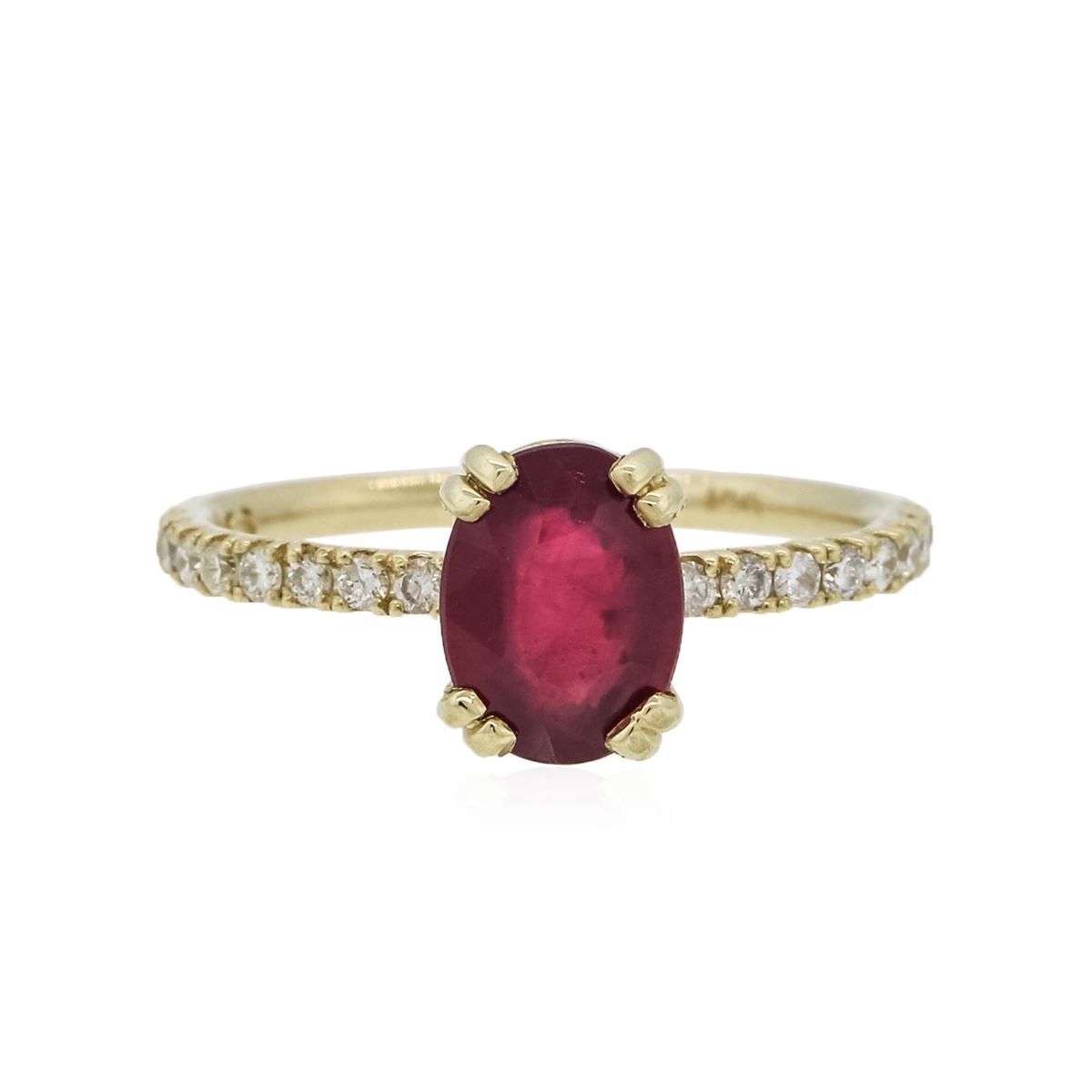 One electronically tested 18KT yellow gold ladies cast ruby and diamond ring with a bright polish finish. The featured ruby is supported by diamond set shoulders, completed by a one and one-half millimeter wide band. Identified with markings of "18K". Condition is new, good workmanship. Containing: One prong set oval mixed cut natural ruby, measuring 8.10 x 6.10 x 3.60mm, 8%. bulge factor, approximate weight of 1.57ct., clarity is heavily included, type II, dark, very slightly brownish, slightly purplish red color, (GIA slpR 7/3), cut is good. Transmitting light somewhat diffusely, transparent to translucent. Naturally occurring internal & external characteristics are present. Indications of laboratory high temperature heat treatment, with glass & flux additives. Graded in the setting. Ruby has a low tolerance to rhodium plating, repolishing the surface, & ultrasonic cleaning. Sixteen prong set round brilliant cut diamonds, measuring 1.40 - 1.30 x 0.81mm (depth est.) approximate total weight of 16 Stones = 0.24ct. Graded in the setting. Clarity: SI-1 to I-1. Color: G - I. Total Weight of Colored Stones 1.57ct. Total Weight of Diamonds 0.24ct. Total Weight of Ring 2.14 grams. AIG Appraised at $1,570.00.