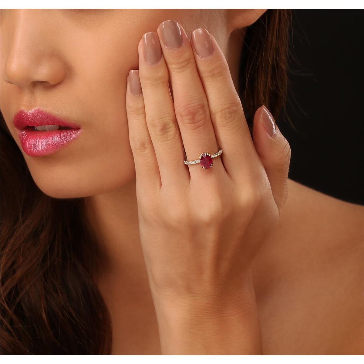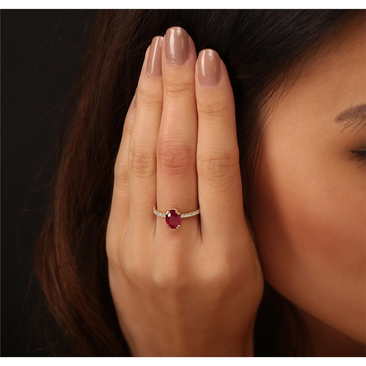 One electronically tested 18KT yellow gold ladies cast ruby and diamond ring with a bright polish finish. The featured ruby is supported by diamond set shoulders, completed by a one and one-half millimeter wide band. Identified with markings of "18K". Condition is new, good workmanship. Containing: One prong set oval mixed cut natural ruby, measuring 8.10 x 6.10 x 3.60mm, 8%. bulge factor, approximate weight of 1.57ct., clarity is heavily included, type II, dark, very slightly brownish, slightly purplish red color, (GIA slpR 7/3), cut is good. Transmitting light somewhat diffusely, transparent to translucent. Naturally occurring internal & external characteristics are present. Indications of laboratory high temperature heat treatment, with glass & flux additives. Graded in the setting. Ruby has a low tolerance to rhodium plating, repolishing the surface, & ultrasonic cleaning. Sixteen prong set round brilliant cut diamonds, measuring 1.40 - 1.30 x 0.81mm (depth est.) approximate total weight of 16 Stones = 0.24ct. Graded in the setting. Clarity: SI-1 to I-1. Color: G - I. Total Weight of Colored Stones 1.57ct. Total Weight of Diamonds 0.24ct. Total Weight of Ring 2.14 grams. AIG Appraised at $1,570.00.