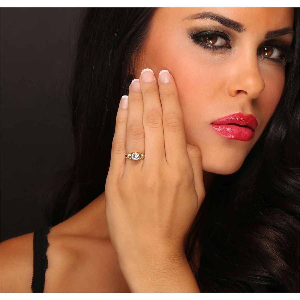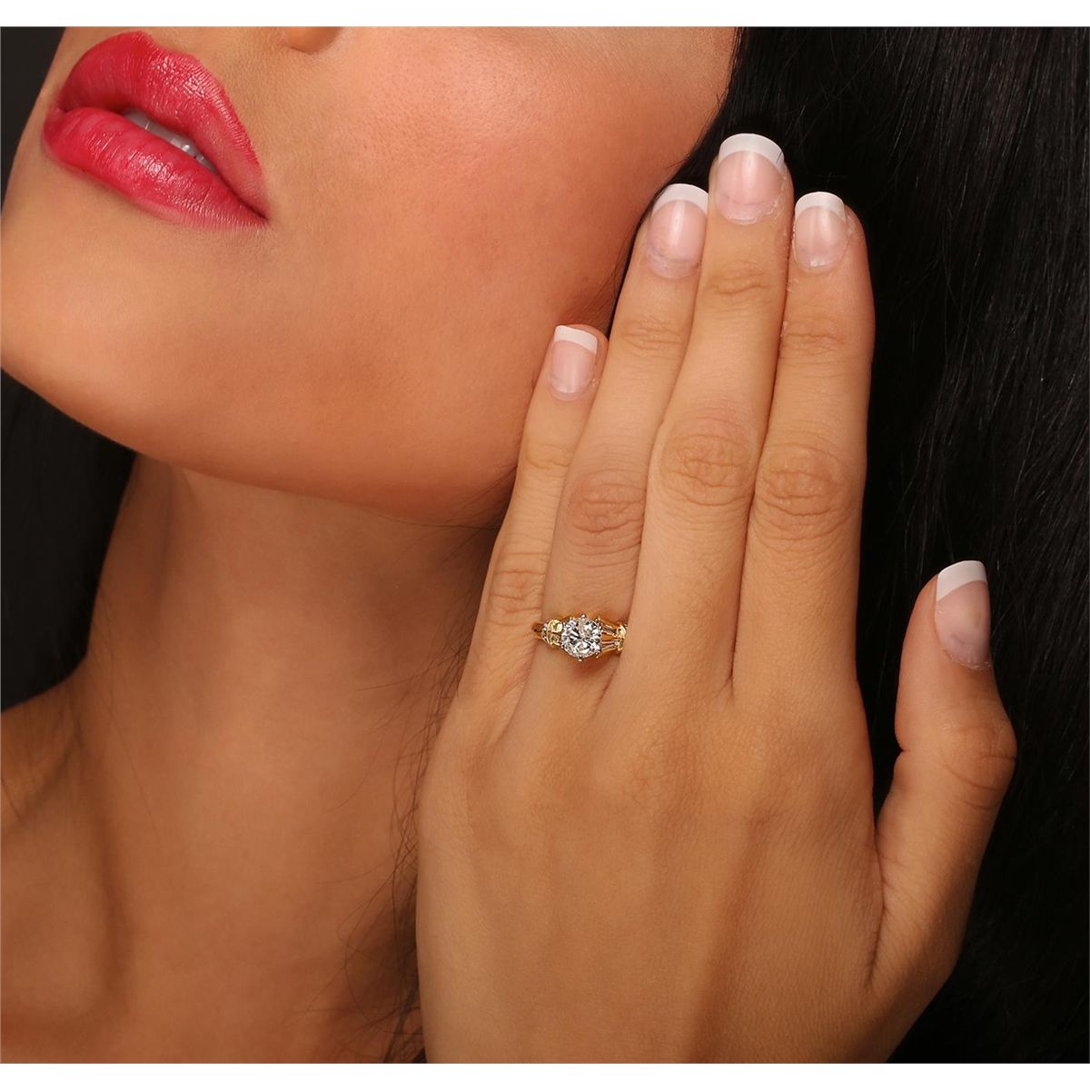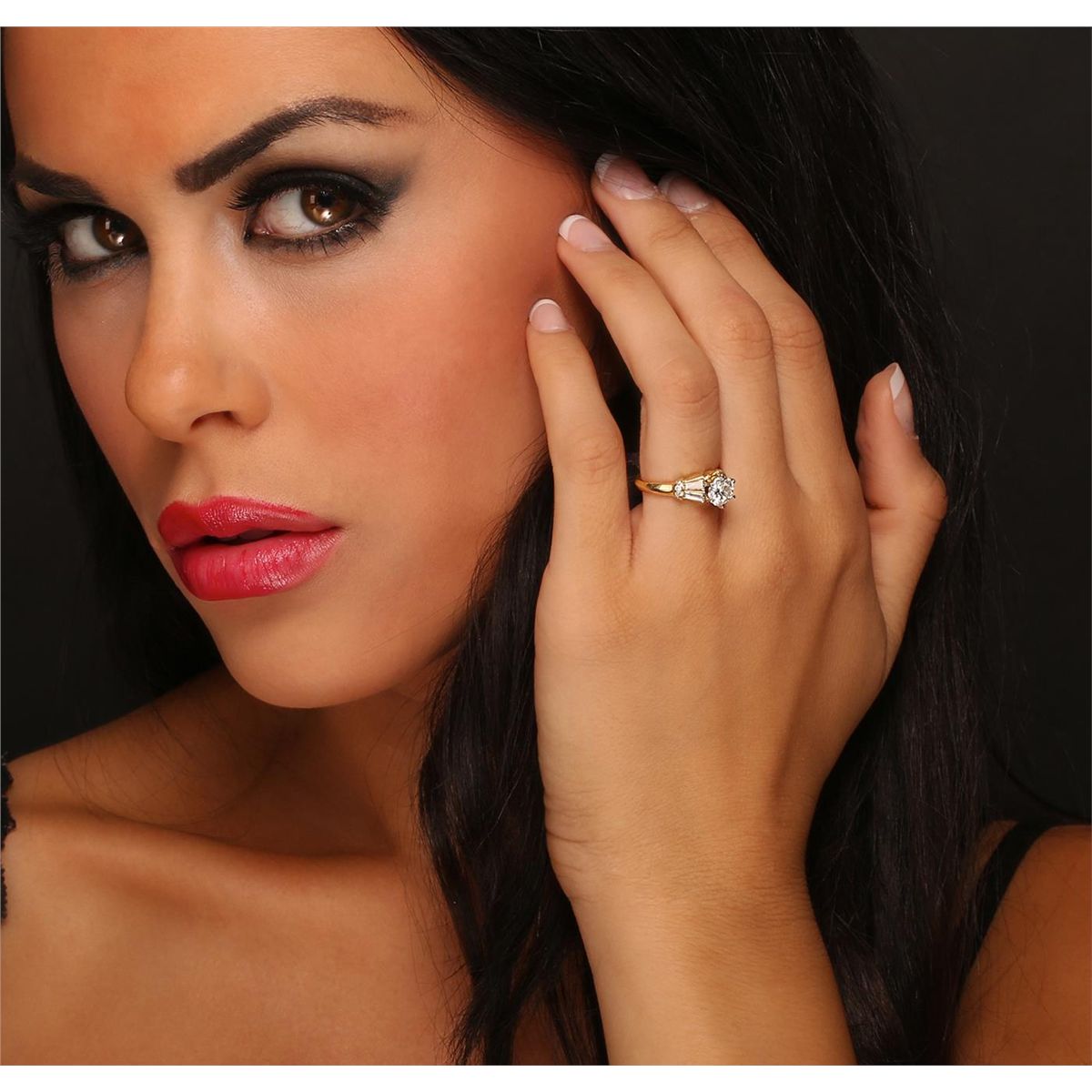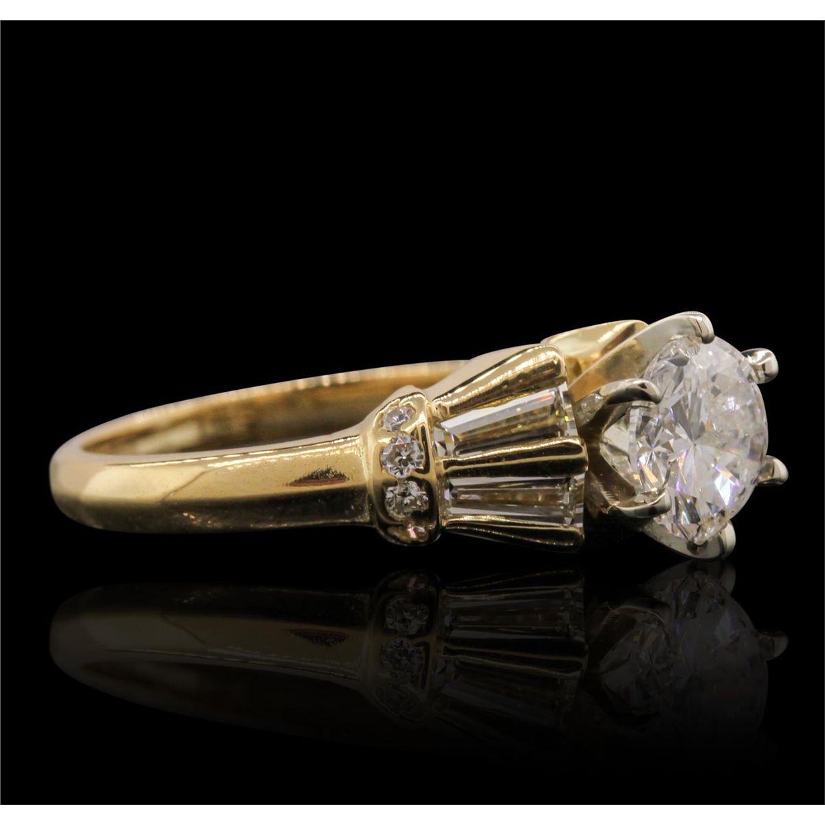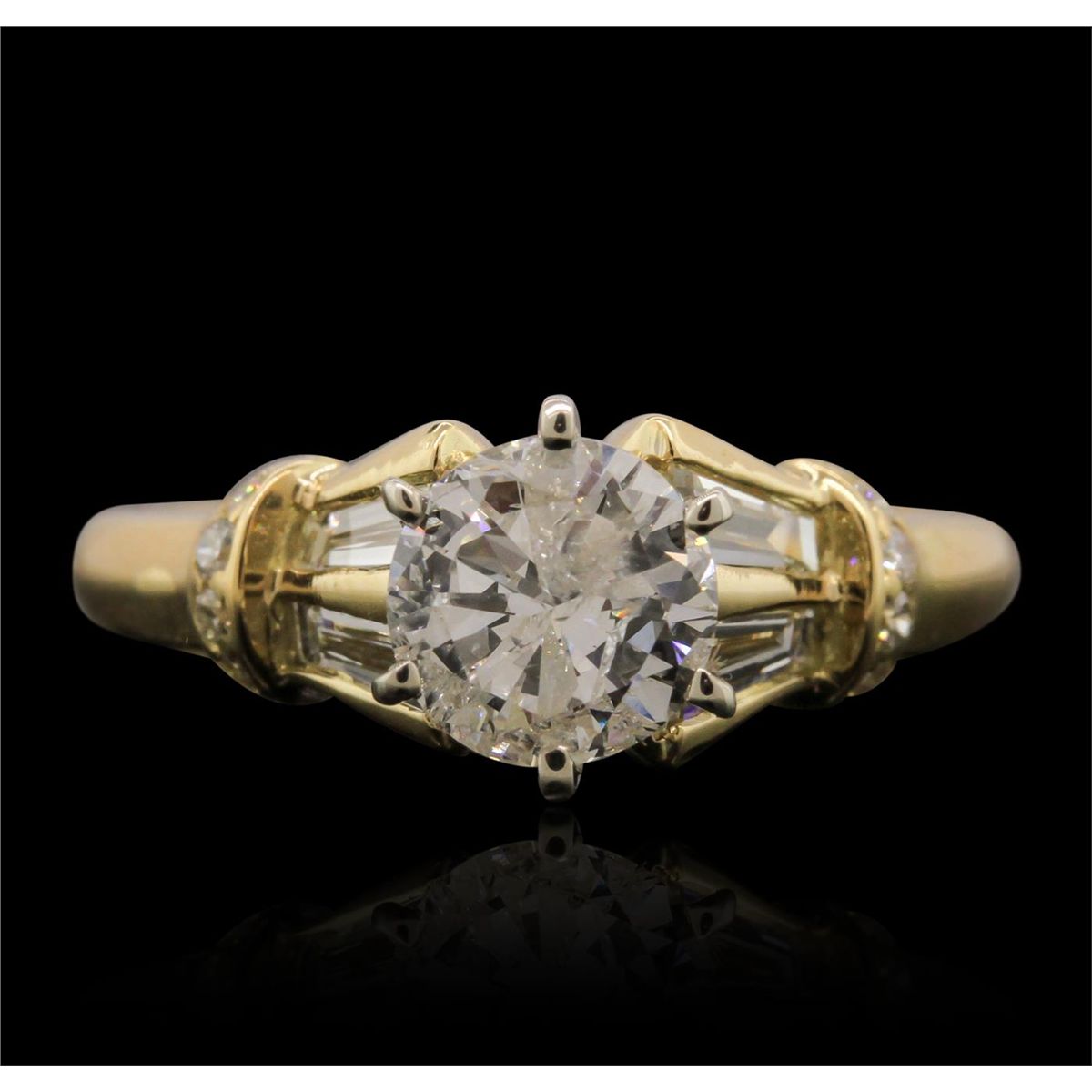One electronically tested 18KT yellow gold ladies cast diamond unity ring with a bright polish finish. Condition is good. The featured diamond is supported by diamond set shoulders, completed by a two millimeter wide band. Identified with markings of "18K". Containing: One prong set round brilliant cut diamond, measuring 6.25 - 6.20 x 4.00mm (depth est.) approximate weight of 1.04ct. Faint brown secondary color throughout. Graded in the setting. Clarity: I-1. Color: IDepth 64.2%. Table 73.8%. Four channel set baguette cut (tapered) diamonds, measuring from 4.50 x 2.10 x 1.47mm (depth est.) to 4.60 x 2.20 x 1.54mm (depth est.) approximate. Total Weight of 4 Stones = 0.54ct. Graded in the setting. Clarity: VS-1 to VS-2. Color: L - M Eight flush set round brilliant cut diamonds, measuring 1.40 - 1.30 x 0.81mm (depth est.) approximate. Total Weight of 8 Stones = 0.17ct. Graded in the setting. Clarity: VS-1 to VS-2. Color: G - I. Total Weight of Diamonds 1.75ct. Total Weight of Ring 4.18 grams. AIG Appraised at $18,105.00.