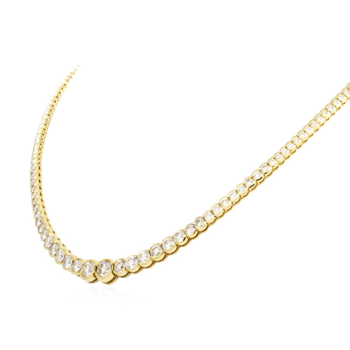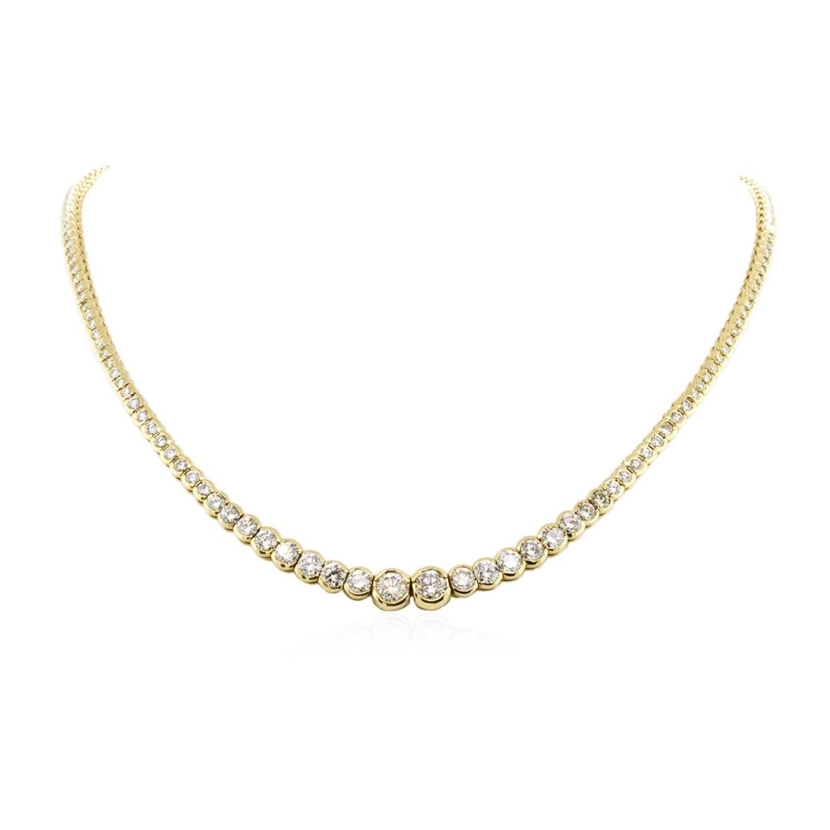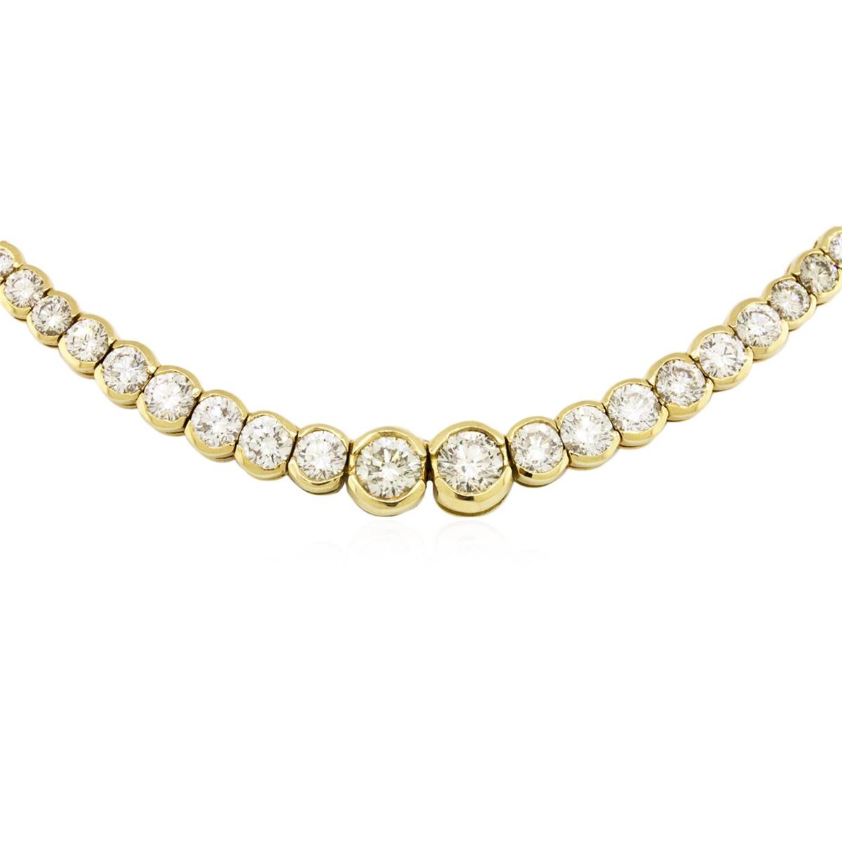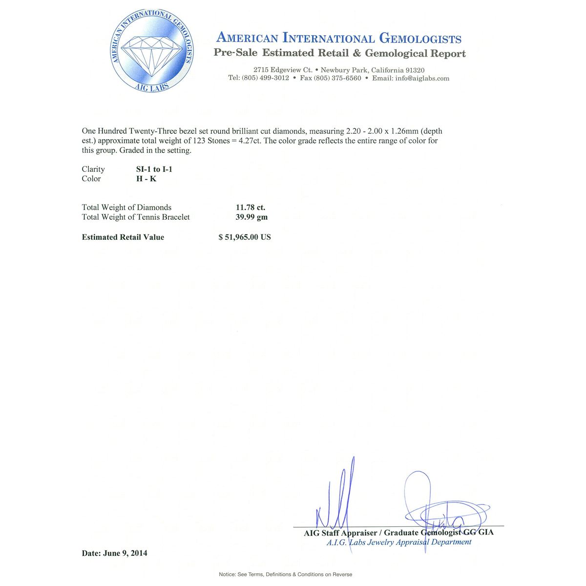 One electronically tested 18KT yellow gold ladies cast & assembled diamond tennis bracelet with a bright polish finish. Condition is good. Eighteen inch length necklace composed of a flexible tapering ribbon of diamonds, terminating in a concealed clasp with safety bar. Identified with markings of "18K". Tennis bracelets & necklaces got their unusual name from an incident involving the U.S. professional tennis player Chris Evert during a tennis match in the 1980's. Evert had been wearing an expensive diamond bracelet, an inline string of individually-set diamonds. Previously these bracelets were known as eternity bracelets. When the clasp snapped during play, she asked the officials to stop the tennis match until the bracelet could be found. Since that day, bracelets and necklaces featuring an inline string of diamonds have been called tennis bracelets and tennis necklaces. Containing: Two bezel set round brilliant cut diamonds, measuring 5.90 - 5.80 x 3.60mm (depth est.) approximate. Total Weight of 2 Stones = 1.60ct. Graded in the setting. Clarity: SI-1 to SI-2. Color: J - K Twelve bezel set round brilliant cut diamonds, measuring 4.50 - 4.10 x 2.58mm (depth est.) approximate. Total Weight of 12 Stones = 3.59ct. Graded in the setting. Clarity: VS-2 to SI-2. Color: I - K Four bezel set round brilliant cut diamonds, measuring 3.80 - 3.70 x 2.25mm (depth est.) approximate. Total Weight of 4 Stones = 0.87ct. Graded in the setting. Clarity: VS-2 to SI-1. Color: I - K Sixteen bezel set round brilliant cut diamonds, measuring 2.90 - 2.80 x 1.71mm (depth est.) approximate. Total Weight of 16 Stones = 1.45ct. Clarity: VS-2 to SI-1. Color: I - K One Hundred Twenty-Three bezel set round brilliant cut diamonds, measuring 2.20 - 2.00 x 1.26mm (depth est.) approximate. Total Weight of 123 Stones = 4.27ct. The color grade reflects the entire range of color for this group. Graded in the setting. Clarity: SI-1 to I-1. Color: H - K. Total Weight of Diamonds 11.78ct. Total Weight of Tennis Bracelet 39.99 grams. AIG Appraised at $51,965.00.