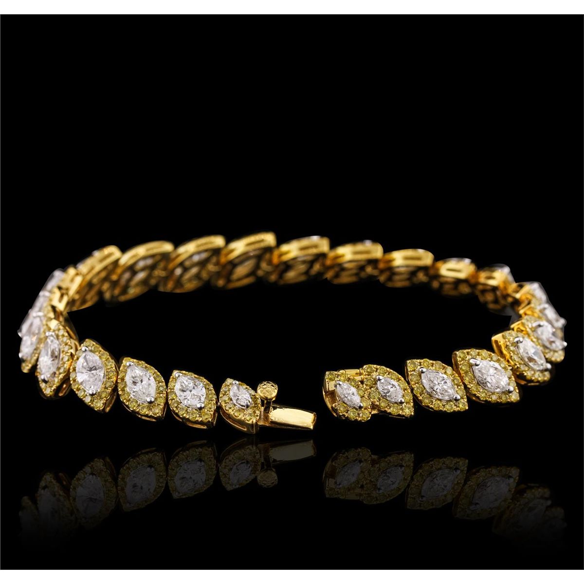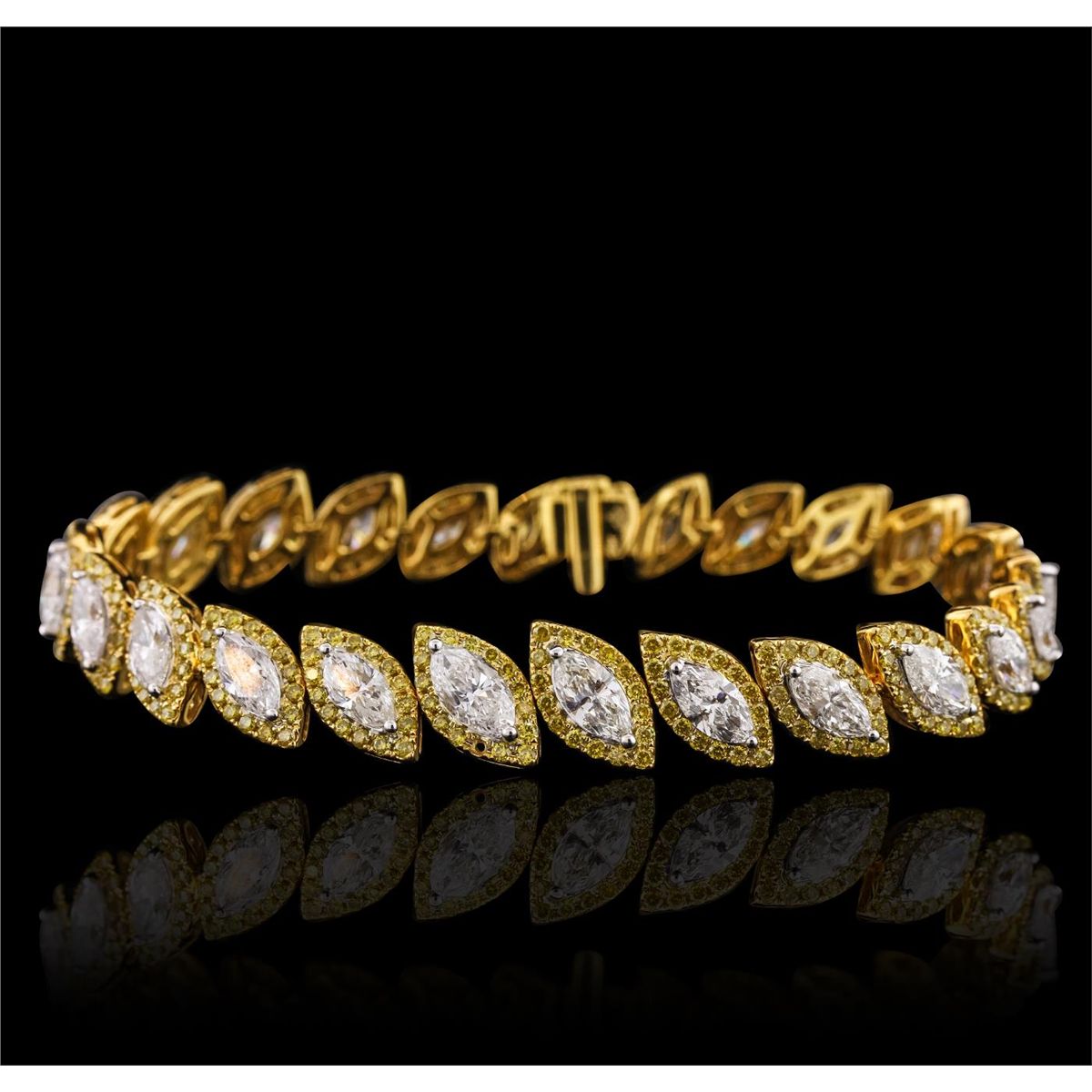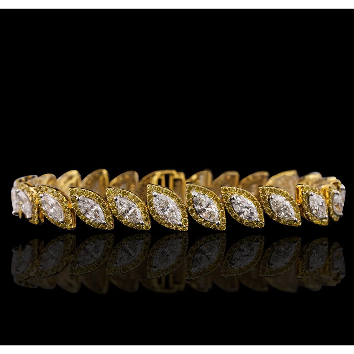One electronically tested 18KT Yellow Gold ladies custom cast & hand crafted diamond bracelet with a bright polish finish. The seven and one quarter inch length bracelet features a ribbon of twenty five diagonally set tapering marquise cut diamonds. Concealed clasp, with safety. Identified with markings of "18K". Condition is very good. Containing: Nine prong set marquise shaped cut diamonds, measuring 7.50 x 4.50 x 2.84mm (depth est.) approximate total weight of 9 Stones = 5.00ct. The measurements range from 7.90 x 4.50mm to 7.30 x 4.40mm. Graded in the setting. Clarity: VS-2 to SI-3. Color: E - F Sixteen prong set marquise shaped cut diamonds, measuring 5.80 x 4.00 x 2.48mm (depth est.) approximate total weight of 16 Stones = 5.20ct. The measurements range from 6.80 x 4.30mm, to 4.30 x 2.80mm. Graded in the setting. Clarity: SI-1 to I-1. Color: E - G Three Hundred Forty-Six prong set round brilliant cut diamonds, measuring 1.50 - 1.40 x 0.90mm (depth est.) approximate total weight of 346 Stones = 4.28ct. This color of diamond is commonly irradiated to improve or change the color. Evidence that may confirm irradiation is typically lacking. Graded in the setting. Clarity: SI-1 to I-1. Total Weight of Diamonds 14.48ct. Total Weight of Bracelet 29.16 grams. AIG Appraised at $84,000.00.