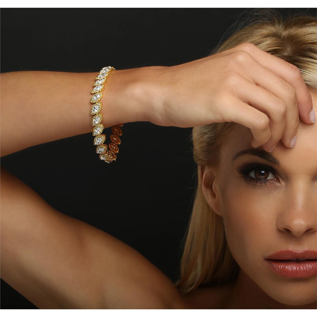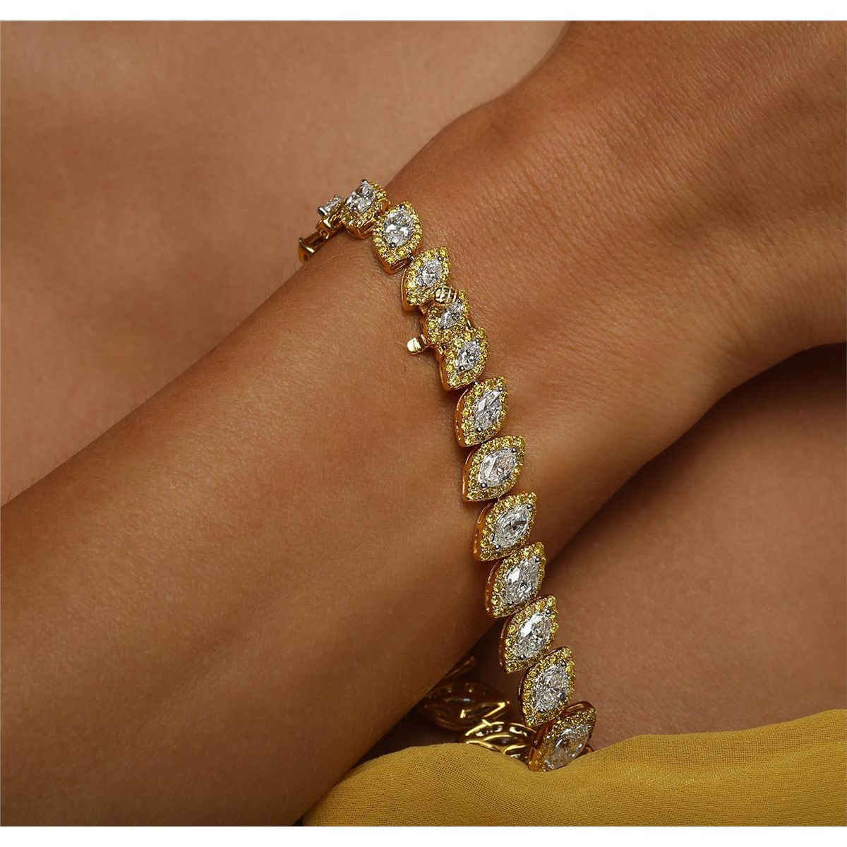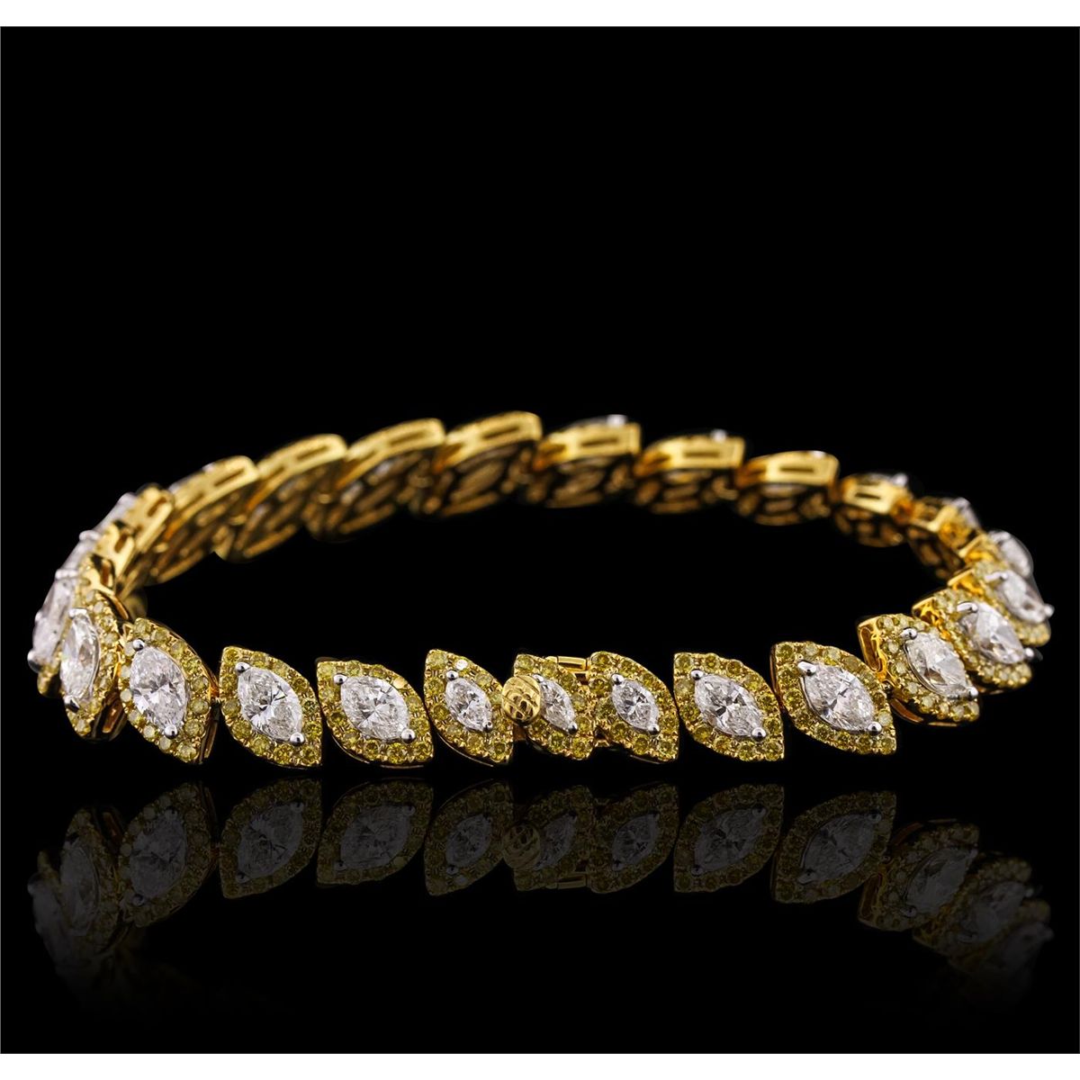One electronically tested 18KT Yellow Gold ladies custom cast & hand crafted diamond bracelet with a bright polish finish. The seven and one quarter inch length bracelet features a ribbon of twenty five diagonally set tapering marquise cut diamonds. Concealed clasp, with safety. Identified with markings of "18K". Condition is very good. Containing: Nine prong set marquise shaped cut diamonds, measuring 7.50 x 4.50 x 2.84mm (depth est.) approximate total weight of 9 Stones = 5.00ct. The measurements range from 7.90 x 4.50mm to 7.30 x 4.40mm. Graded in the setting. Clarity: VS-2 to SI-3. Color: E - F Sixteen prong set marquise shaped cut diamonds, measuring 5.80 x 4.00 x 2.48mm (depth est.) approximate total weight of 16 Stones = 5.20ct. The measurements range from 6.80 x 4.30mm, to 4.30 x 2.80mm. Graded in the setting. Clarity: SI-1 to I-1. Color: E - G Three Hundred Forty-Six prong set round brilliant cut diamonds, measuring 1.50 - 1.40 x 0.90mm (depth est.) approximate total weight of 346 Stones = 4.28ct. This color of diamond is commonly irradiated to improve or change the color. Evidence that may confirm irradiation is typically lacking. Graded in the setting. Clarity: SI-1 to I-1. Total Weight of Diamonds 14.48ct. Total Weight of Bracelet 29.16 grams. AIG Appraised at $84,000.00.