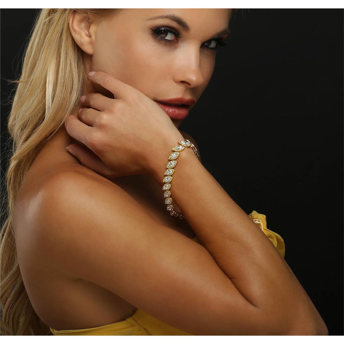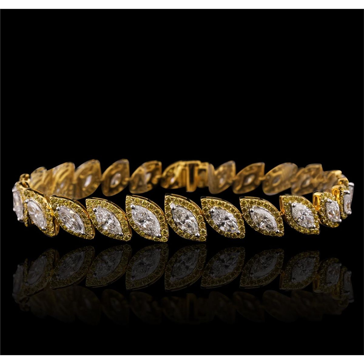 One electronically tested 18KT Yellow Gold ladies custom cast & hand crafted diamond bracelet with a bright polish finish. The seven and one quarter inch length bracelet features a ribbon of twenty five diagonally set tapering marquise cut diamonds. Concealed clasp, with safety. Identified with markings of "18K". Condition is very good. Containing: Nine prong set marquise shaped cut diamonds, measuring 7.50 x 4.50 x 2.84mm (depth est.) approximate total weight of 9 Stones = 5.00ct. The measurements range from 7.90 x 4.50mm to 7.30 x 4.40mm. Graded in the setting. Clarity: VS-2 to SI-3. Color: E - F Sixteen prong set marquise shaped cut diamonds, measuring 5.80 x 4.00 x 2.48mm (depth est.) approximate total weight of 16 Stones = 5.20ct. The measurements range from 6.80 x 4.30mm, to 4.30 x 2.80mm. Graded in the setting. Clarity: SI-1 to I-1. Color: E - G Three Hundred Forty-Six prong set round brilliant cut diamonds, measuring 1.50 - 1.40 x 0.90mm (depth est.) approximate total weight of 346 Stones = 4.28ct. This color of diamond is commonly irradiated to improve or change the color. Evidence that may confirm irradiation is typically lacking. Graded in the setting. Clarity: SI-1 to I-1. Total Weight of Diamonds 14.48ct. Total Weight of Bracelet 29.16 grams. AIG Appraised at $84,000.00.