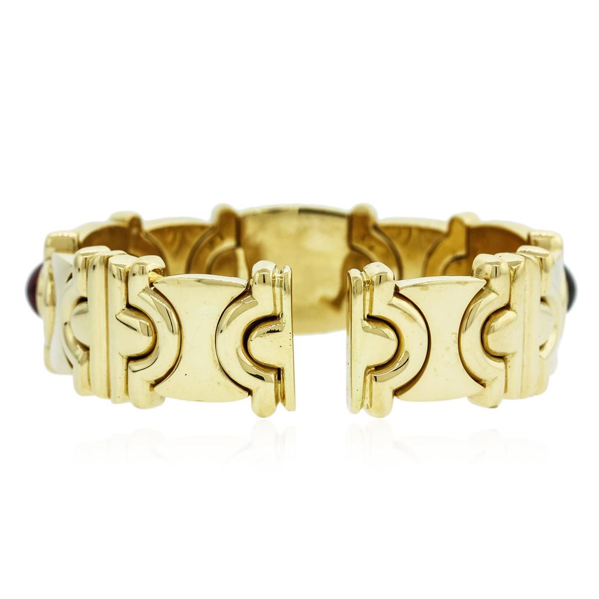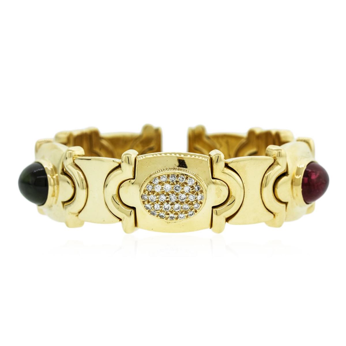 One electronically tested 18KT yellow gold Ladies combination cast & die struck bangle bracelet with a bright polish finish. Trademark is Acciato. Identified with markings of "750". Condition is excellent. Containing: One bezel set oval cabochon cut natural green tourmaline, measuring 14.00 x 10.60 x 6.89mm, approximate weight of 8.45ct., clarity is eye clean, type I, medium light, moderately strong, very slightly bluish green color, (GIA vslbG 4/4), cut is very good. One bezel set oval cabochon cut natural pink tourmaline, measuring 14.00 x 9.50 x 6.18mm, approximate weight of 6.79ct., clarity is eye clean, type II, medium light, moderately strong, reddish purple color, (GIA rP 4/4), cut is very good. Twenty-Nine bead set round brilliant cut diamonds, measuring 1.60 - 1.50 x 0.93mm (depth est.) approximate total weight of 29 Stones = 0.39ct. Clarity of VS-2 to SI-1, Color of F - G, Cut is Very Good. Total Weight of Colored Stones 15.24ct. Total Weight of Diamonds 0.39ct. Total Weight of Bracelet 103.10gm. GGL Appraised at $25,910.00.