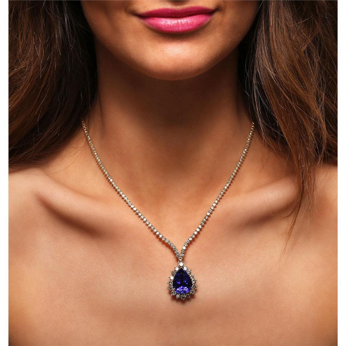 One electronically tested 18KT yellow gold Ladies combination cast & die struck necklace with a hidden box clasp with a bright polish finish. Identified with markings of "18K". Condition is excellent. Containing: One prong set pear modified brilliant cut natural tanzanite, measuring 17.72 x 13.54 x 9.91mm, approximate weight of 15.44ct., clarity is eye clean, type I, medium dark, moderately strong, violetish blue color, (GIA vB 6/4), cut is very good. GIA Colored Stone report attached. Graded loose prior to setting in the GIA Laboratory: Report #2151735827. Colored gemstones are presumed to have been subjected to commonly used and possible undetectable color/clarity enhancement processes. Ninety-Five prong set round brilliant cut diamonds, measuring 3.50 - 2.45 x 1.79mm (depth est.) approximate total weight of 95 Stones = 9.61ct. Clarity of I-1 to I-2, Color of K, Cut is Good. Total Weight of Colored Stones 15.44ct. Total eight of Diamonds 9.61ct. Total Weight of Necklace 24.80gm. GGLAppraised at $52,560.00.