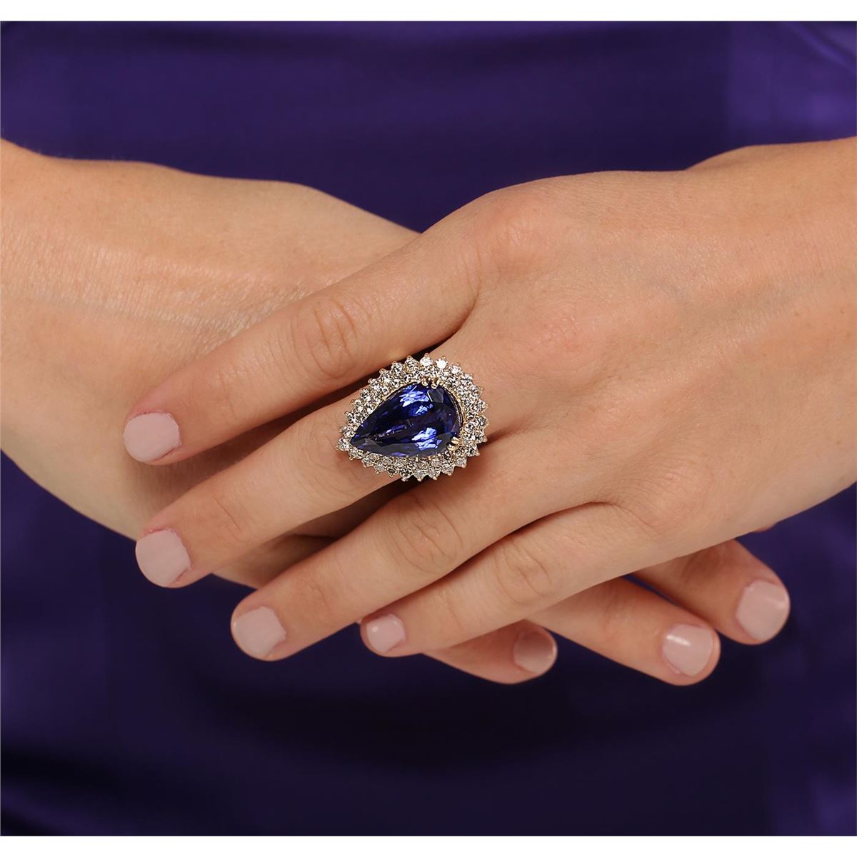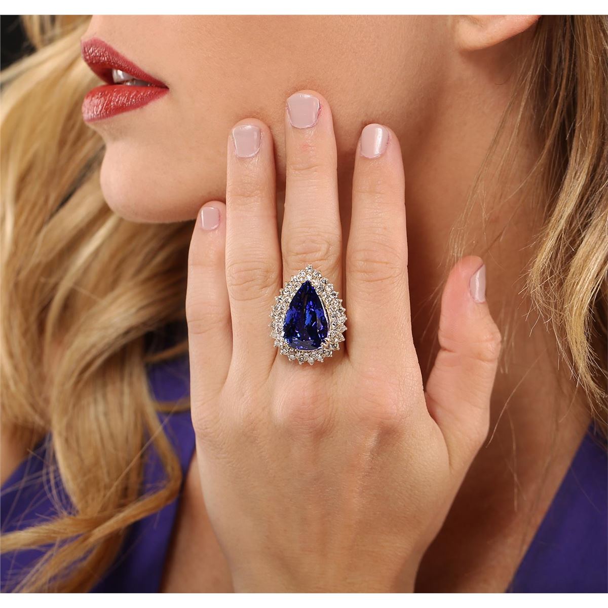 One electronically tested 18KT yellow gold ladies cast tanzanite and diamond ring with a bright polish finish. The featured tanzanite is set within a two tiered diamond lattice gallery, completed by a three millimeter wide band. Identified with markings of "K18". Condition is new, good workmanship. Containing: One prong set pear modified brilliant cut natural tanzanite, measuring 20.75 x 13.52 x 8.97mm, exact weight 17.41ct., clarity is eye clean, type I, medium dark, strong, violetish blue color, (GIA vB 6/5), cut is good. Transmitting light with no distortion, transparent. GIA Colored Stone Grading Report attached. Graded loose prior to setting in the GIA Laboratory, Report # 2151735648.Tanzanite is a very rare gemstone that is only found in the country of Tanzania. Originally discovered in 1967. Tiffany & Company, named the stone Tanzanite. It is found in the Usumburu Mountains that border the Umba Valley of northern Tanzania. Tanzanite occurs in gray, brown, violet, blue, reddish-purple, & green. The gem is interesting because of its exceptional pleochroism. Rotated in different directions a tanzanite will exhibit multiple changes of color. Tanzanite has a low tolerance to ultrasonic cleaning, and should not be cleaned using this method. Fifty-Three prong set round brilliant cut diamonds, measuring 2.40 - 2.30 x 1.41mm (depth est.) approximate. Total Weight of 53 Stones = 2.61ct. Graded in the setting. Clarity: SI-2 to I-1 . Color: G - I. Total Weight of Colored Stones 17.41ct. Total Weight of Diamonds 2.61ct. AIG Appraised at $59,000.00.