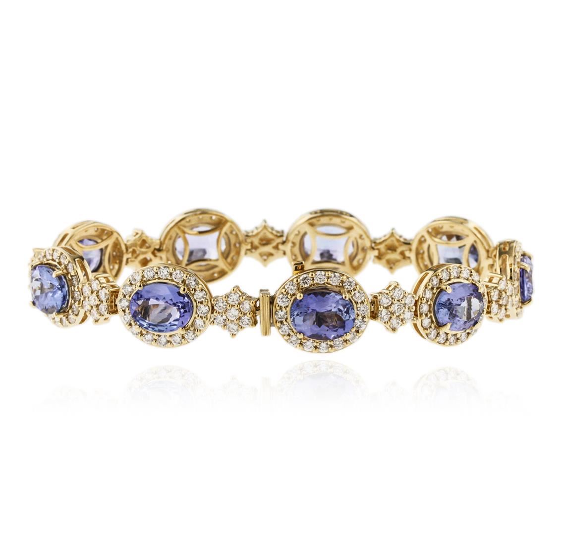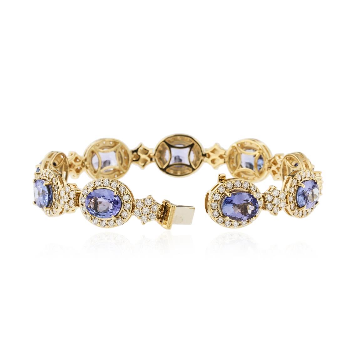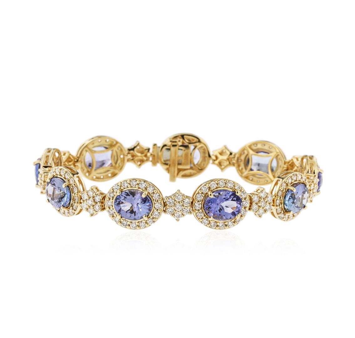 One electronically tested 18KT yellow gold ladies combination cast & assembled tanzanite and diamond bracelet with a hidden box clasp with safety closer with a bright polish finish. The bracelet measures 7" long. Identified with markings of "18K". Condition is new. Containing: Nine oval modified brilliant cut natural tanzanites, measuring 9.30 x 7.20 x 4.68mm, approximate total weight of 19.80ct., clarity is eye clean, type I, medium light, moderately strong, violet color, (GIA V 4/4), cut is very good. Two Hundred Seven prong set round brilliant cut diamonds, measuring 1.70 - 1.70 x 1.02mm (depth est.) approximate total weight of 207 Stones = 3.71ct. Clarity of SI-1 to I-1, Color of I - J, Cut is Good. All diamonds and colored gemstones are graded in the mounting, unless otherwise stated. Colored gemstones are presumed to have been subjected to commonly used enhancement processes. Total Weight of Colored Stones 19.80ct. Total Weight of Diamonds 3.71ct. Total Weight of Bracelet 33.70 grams. GGL Appraised at $18,930.00.