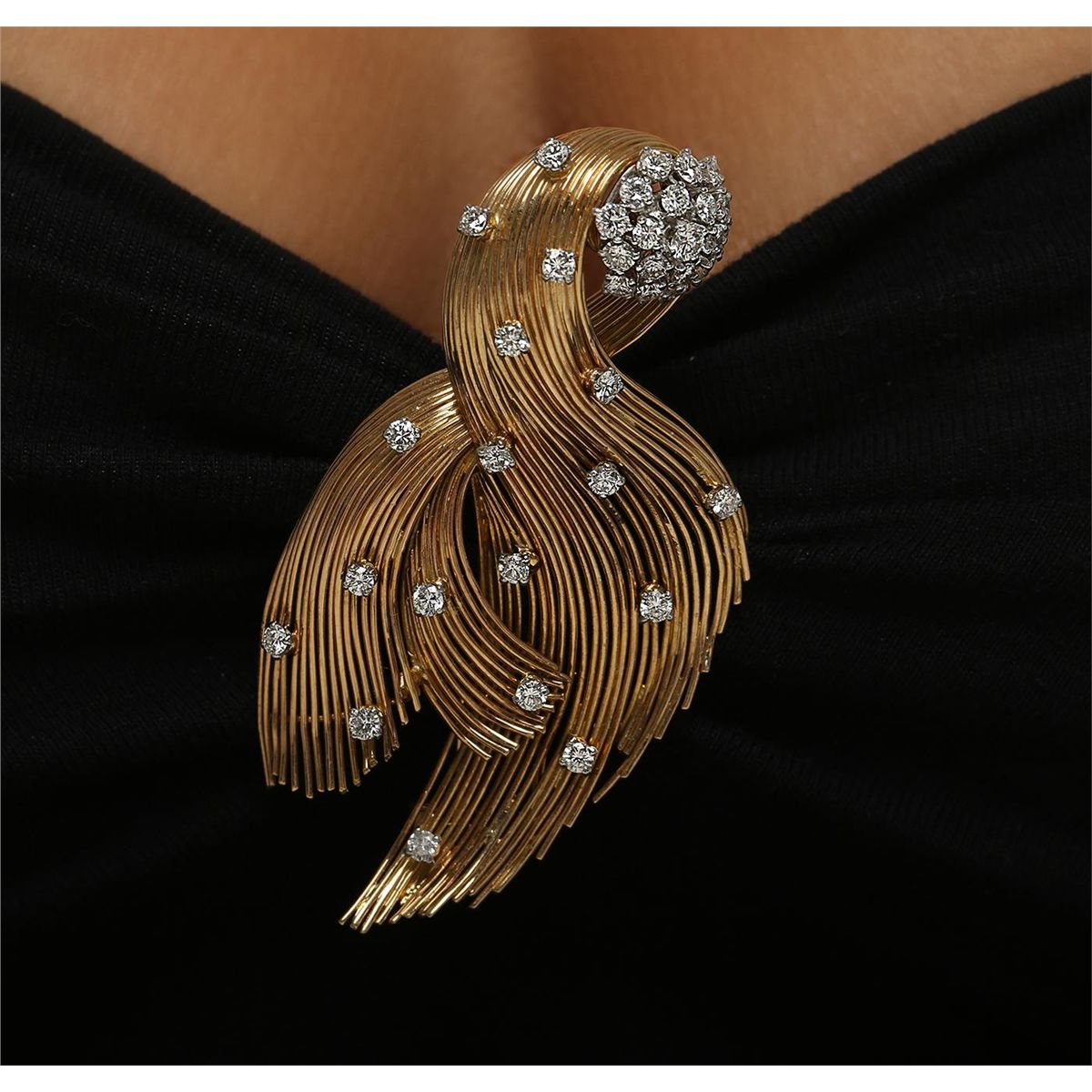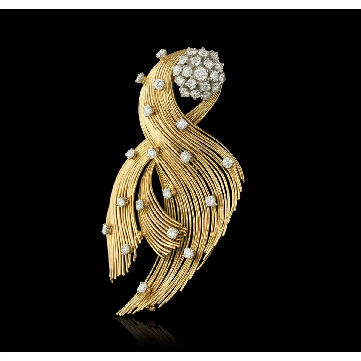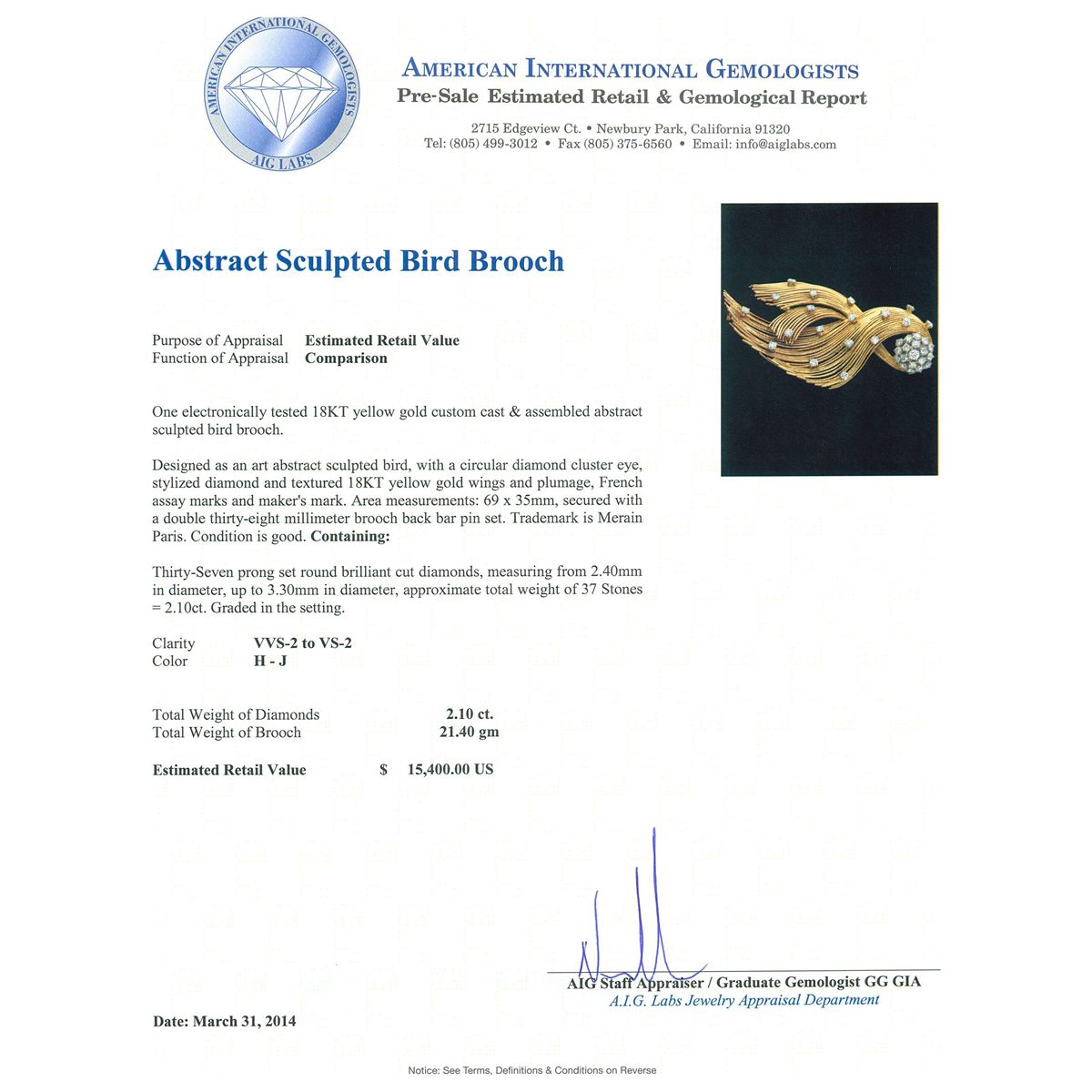 One electronically tested 18KT yellow gold custom cast and assembled abstract sculpted bird brooch. Designed as an art abstract scultped bird, with a circular diamond cluster eye, stylized diamond and textured 18KT yellow gold wings and plumage, French assay marks and maker's mark. Area measurements 69 x 35mm secured with a double thirty-eight millimeter brooch back bar pin set. Trademark is Merain Paris. Condition is good. Containing: Thirty-Seven prong set round brilliant cut diamonds, measuring from 2.40mm in diameter up to 3.30mm in diameter approximate total weight of 37 stones = 2.10ct. Graded in the setting. Clarity VVS-2 to VS-2. Color H-J. Total weight of diamonds 2.10ct. Total weight of brooch 21.40 grams. AIG Appraised at $15,400.00.