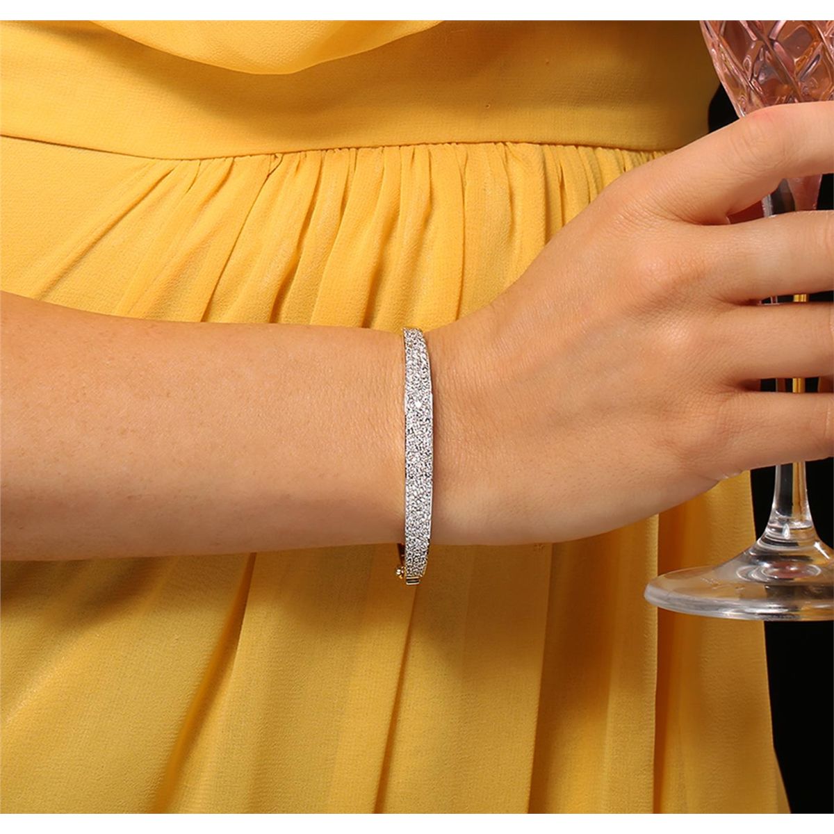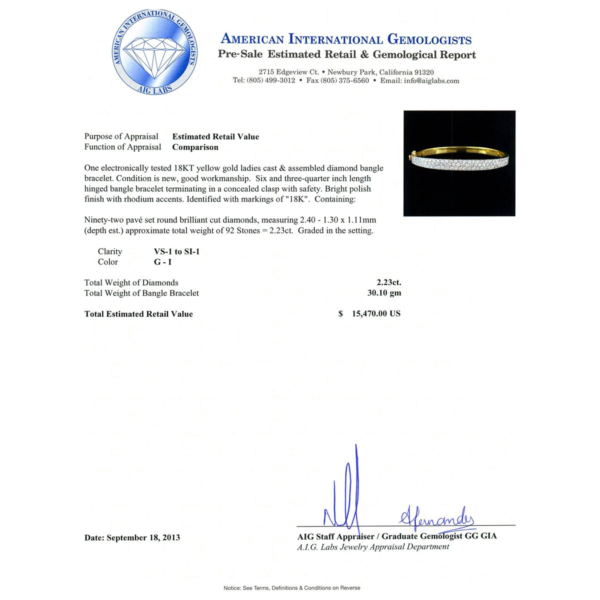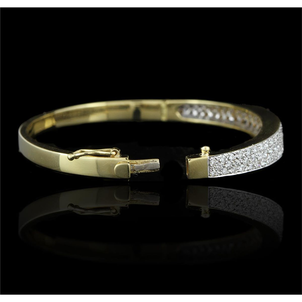 One electronically tested 18KT yellow gold ladies cast & assembled diamond bangle bracelet. Condition is new, good workmanship. Six and three-quarter inch length hinged bangle bracelet terminating in a concealed clasp with safety. Bright polish finish with rhodium accents. Identified with markings of "18K". Containing: Ninety-two pave set round brilliant cut diamonds, measuring 2.40 - 1.30 x 1.11mm (depth est.) approximate total weight of 92 Stones = 2.23ct. Graded in the setting. Clarity VS-1 to SI-1. Color G - I. Total Weight of Diamonds 2.23ct. Total Weight of Bangle Bracelet 30.10gm. AIG Appraised at $15,470.00.