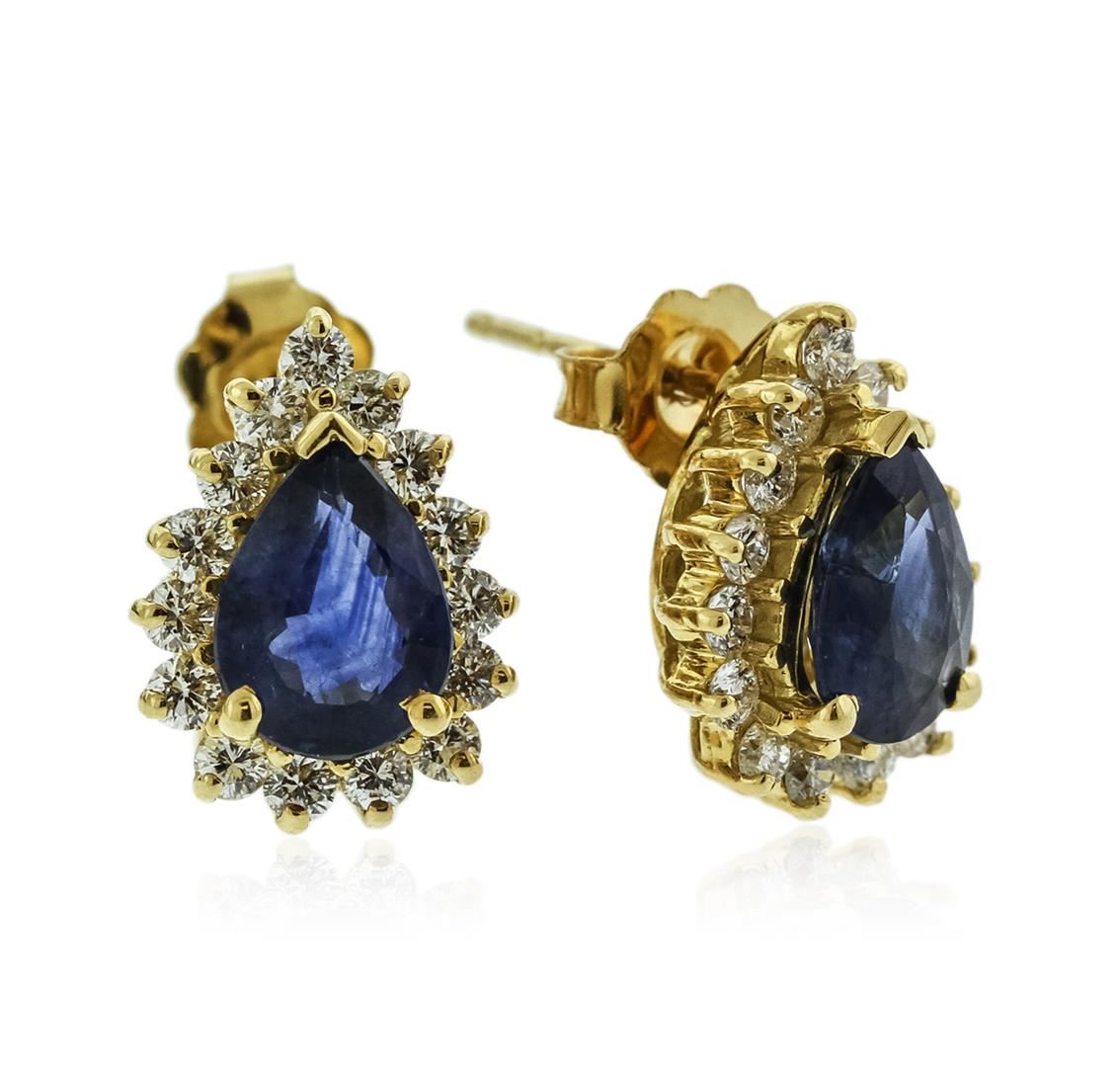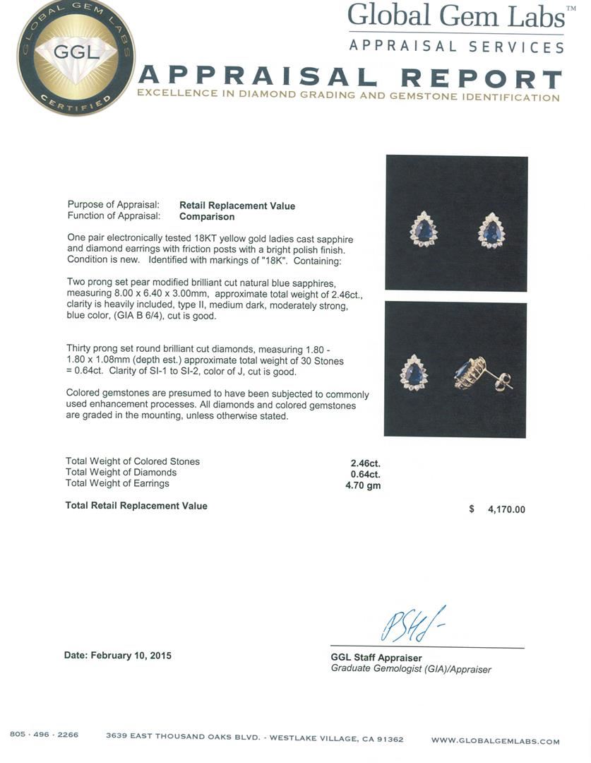 One pair electronically tested 18KT yellow gold ladies cast sapphire and diamond earrings with friction posts with a bright polish finish. Identified with markings of "18K". Condition is new. Containing: Two prong set pear modified brilliant cut natural blue sapphires, measuring 8.00 x 6.40 x 3.00mm, approximate total weight of 2.46ct., clarity is heavily included, type II, medium dark, moderately strong, blue color, (GIA B 6/4), cut is good. Thirty prong set round brilliant cut diamonds, measuring 1.80 - 1.80 x 1.08mm (depth est.) approximate total weight of 30 Stones = 0.64ct. Clarity: SI-1 to SI-2. Color: J, Cut is Good. Colored gemstones are presumed to have been subjected to commonly used enhancement processes. All diamonds and colored gemstones are graded in the mounting, unless otherwise stated. Total Weight of Colored Stones 2.46ct. Total Weight of Diamonds 0.64ct. Total Weight of Earrings 4.70 grams. GGL Appraised at $4,170.00.