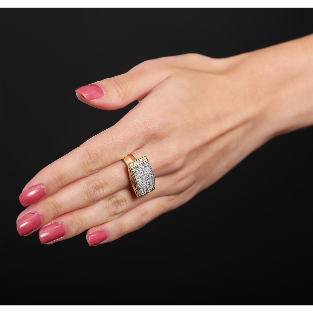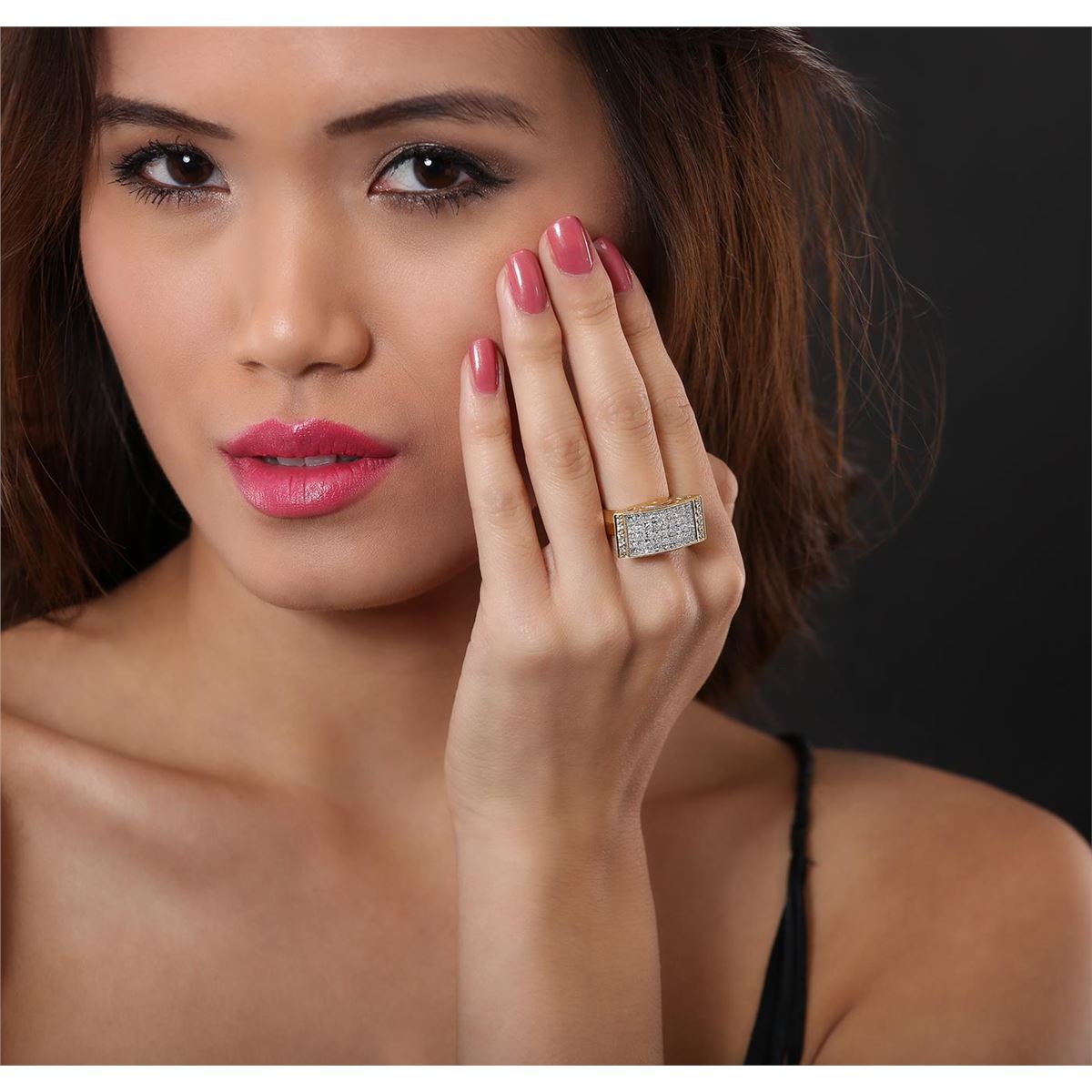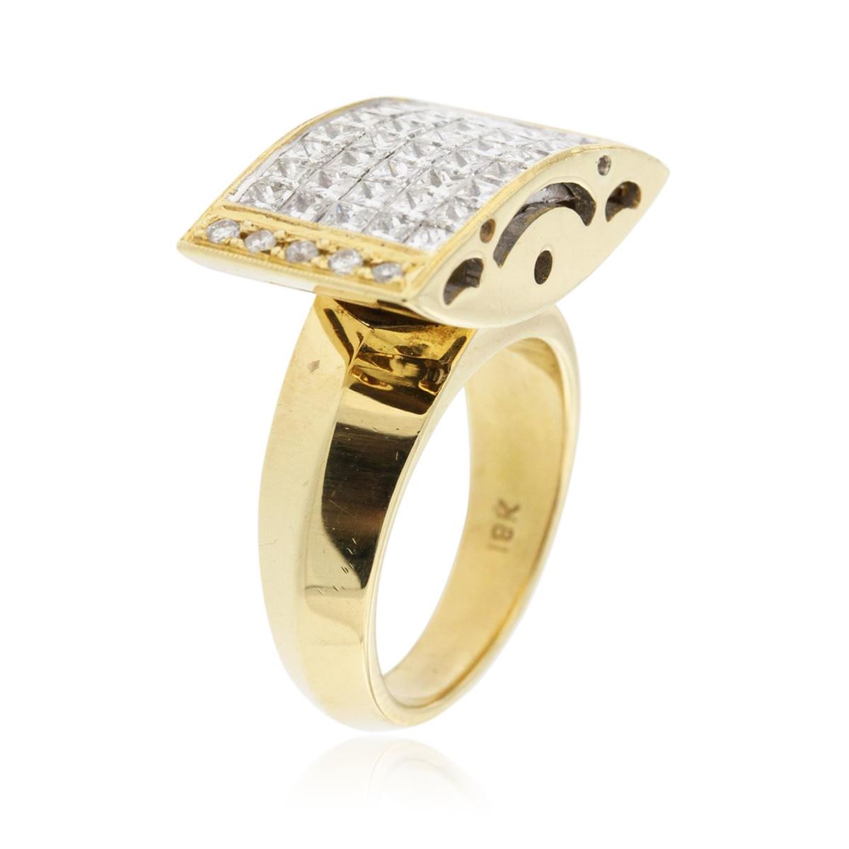 One electronically tested 18KT yellow gold ladies cast and assembled diamond ring. Condition is good. The ring features a diamond set pedestal, completed by a three and one half millimeter wide band. Bright polish finish with milgrain detailing throughout. Identified with markings if "18K". Containing: Forty five invisible set princess cut diamonds, measuring 2.00 x 2.00 x 1.50mm(depth est.) approximate total weight of 45 stones = 2.31 Graded in the setting. Clarity VS-2 to SI-2. Color G - I. Ten bead set round brilliant cut diamonds, measuring 1.60 - 1.50 x 0.93mm (depth est.) approximate total weight of 10 stones = 0.17ct. The clarity grade reflects the overall average for the group. Graded in the setting. Clarity I-1. Color G - H. Total weight of diamonds 2.48ct. Total weight of ring 16.80gm. AIG Appraised at $10,825.00.