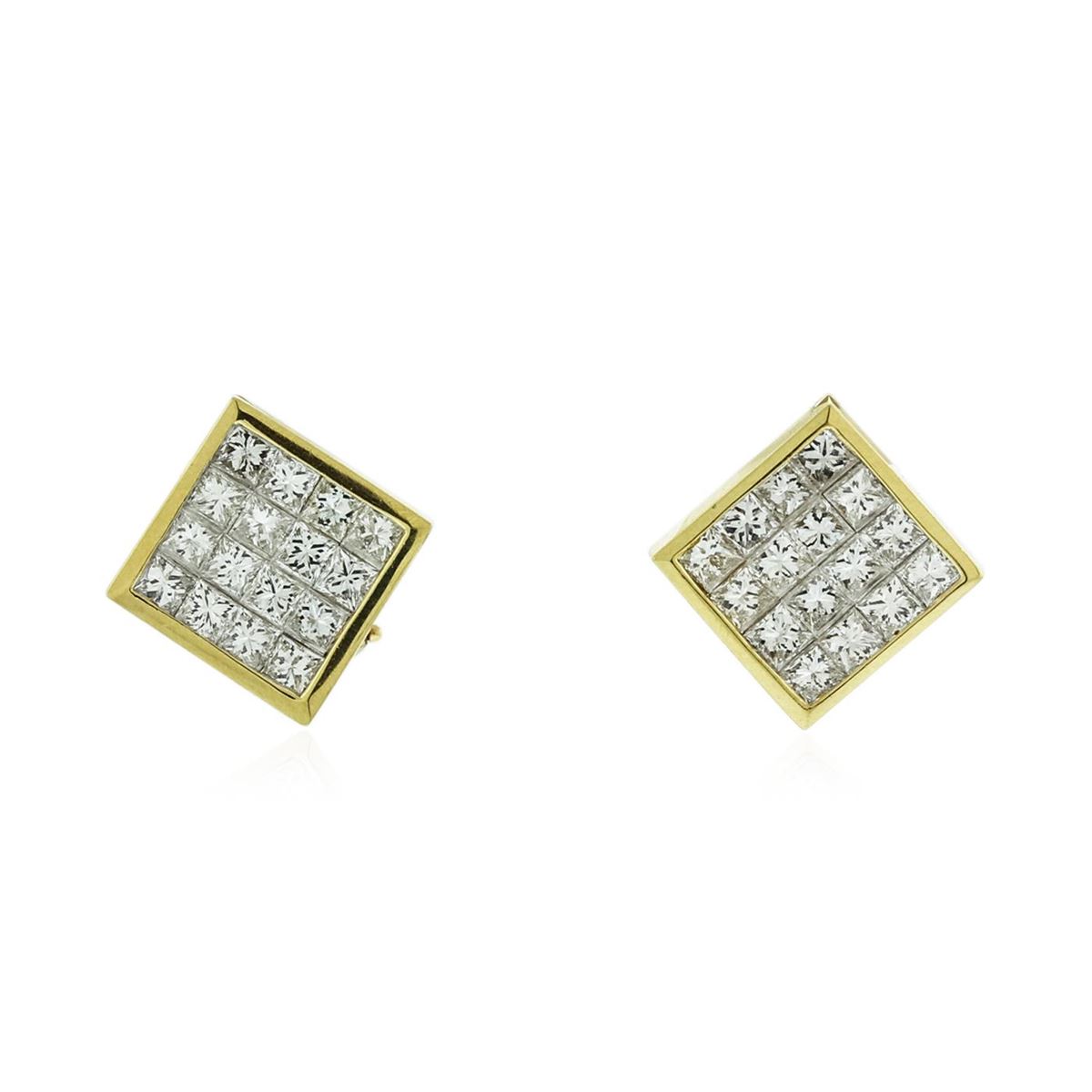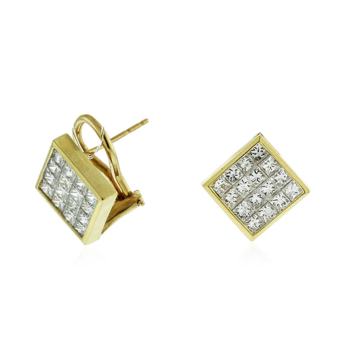 One pair electronically tested 18KT yellow gold Ladies combination cast & assembled earrings with Omega clip backs with a bright polish finish. Condition is new. Identified with markings of "18K". Containing: Thirty-Two invisible set princess cut diamonds, measuring 2.40 x 2.30 x 1.73mm (depth est.) approximate. Total Weight of 32 Stones = 2.51ct. Clarity: SI-1. Color: H - I, Cut is Good. Total Weight of Diamonds 2.51ct. Total Weight of Earrings 6.90 grams. GGL Appraised at $8,335.00.