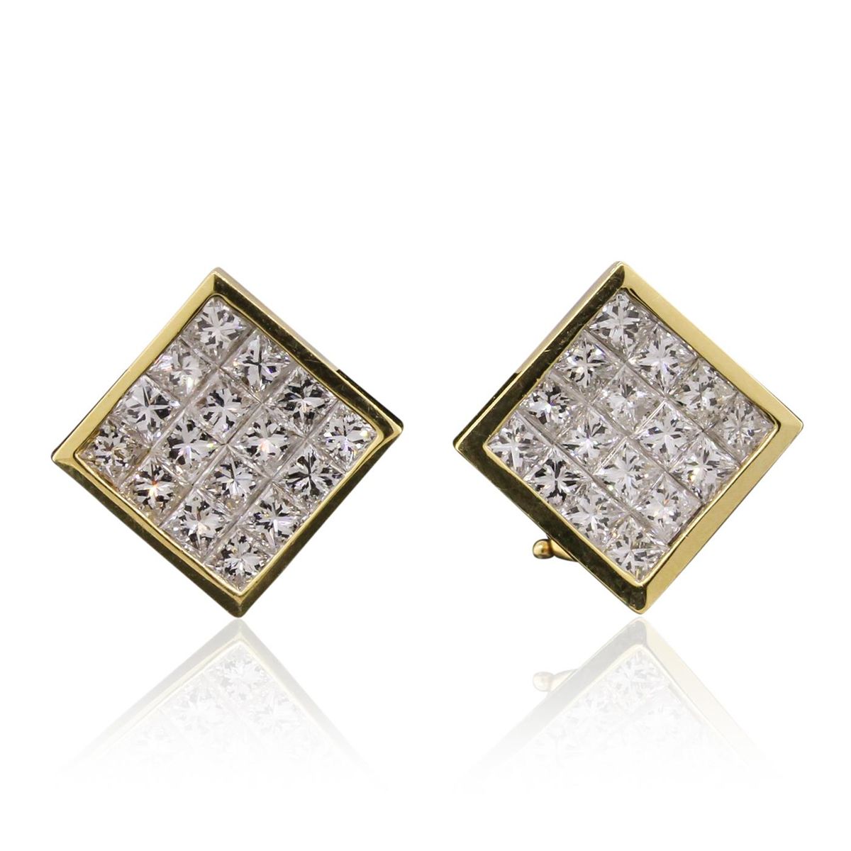One pair electronically tested 18KT yellow gold Ladies combination cast & assembled earrings with Omega clip backs with a bright polish finish. Condition is new. Identified with markings of "18K". Containing: Thirty-Two invisible set princess cut diamonds, measuring 2.40 x 2.30 x 1.73mm (depth est.) approximate. Total Weight of 32 Stones = 2.51ct. Clarity: SI-1. Color: H - I, Cut is Good. Total Weight of Diamonds 2.51ct. Total Weight of Earrings 6.90 grams. GGL Appraised at $8,335.00.