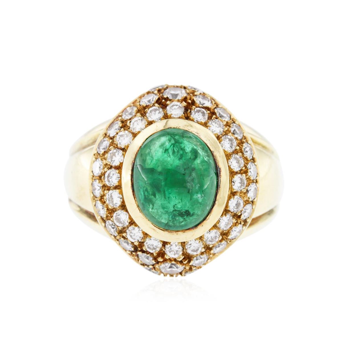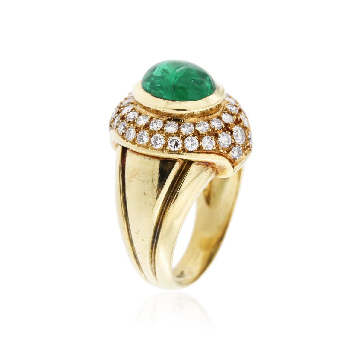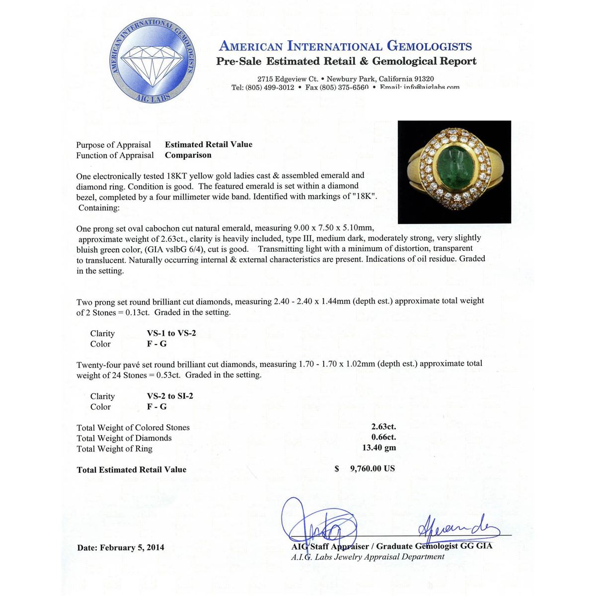 One electronically tested 18KT Yellow Gold ladies cast & assembled emerald and diamond ring. Condition is Good. The featured emerald is set within a diamond bezel, completed by a four millimeter wide band. Identified with markings of "18K". Containing: One prong set oval cabochon cut natural emerald, measuring 9.00 x 7.50 x 5.10mm, approximate weight of 2.63ct., clarity is heavily included, type III, medium dark, moderately strong, very slightly bluish green color, (GIA vslbG 6/4), cut is Good. Transmitting light with a minimum of distortion, transparent to translucent. Naturally occurring internal & external characteristics are present. Indications of oil residue. Graded in the setting. Two prong set round brilliant cut diamonds, measuring 2.40 - 2.40 x 1.44mm (depth est.) approximate total weight of 2 Stones = 0.13ct. Graded in the setting. Clarity: VS-1 to VS-2. Color: F - G Twenty-Four pave‚ set round brilliant cut diamonds, measuring 1.70 - 1.70 x 1.02mm (depth est.) approximate total weight of 24 Stones = 0.53ct. Graded in the setting. Clarity: VS-2 to SI-2. Color: F - G. Total Weight of Colored Stones 2.63ct. Total Weight of Diamonds 0.66ct. Total Weight of Ring 13.40 grams. AIG Appraised at $9,760.00.