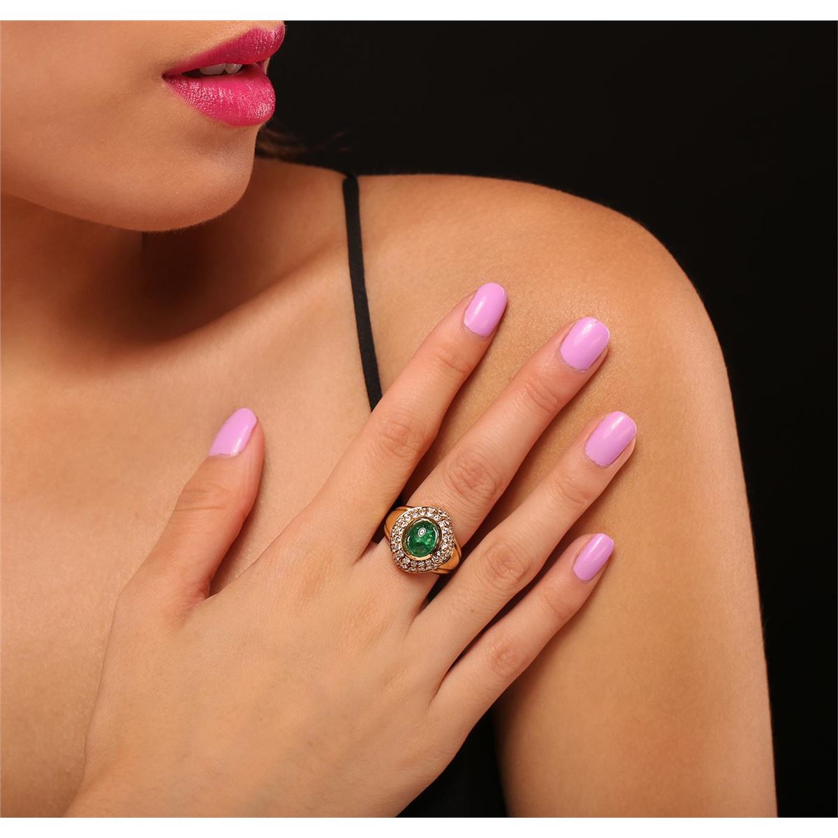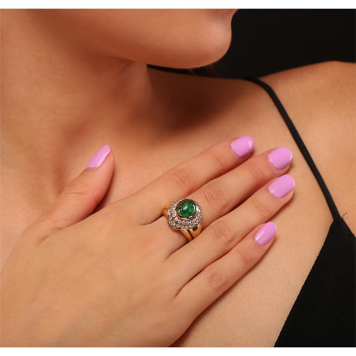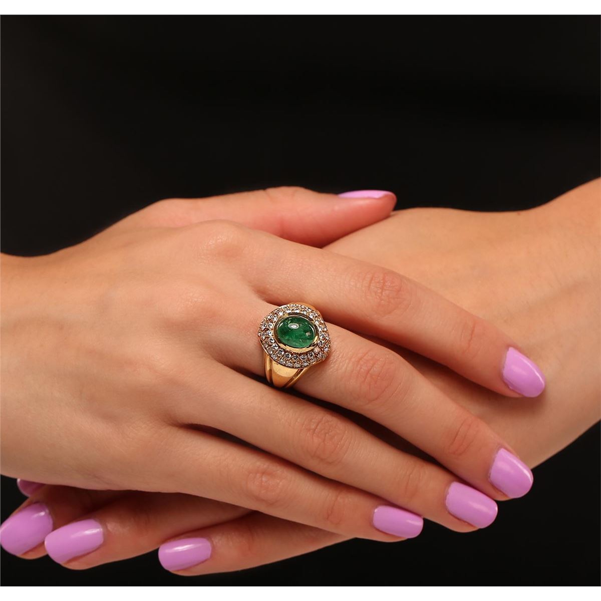 One electronically tested 18KT Yellow Gold ladies cast & assembled emerald and diamond ring. Condition is Good. The featured emerald is set within a diamond bezel, completed by a four millimeter wide band. Identified with markings of "18K". Containing: One prong set oval cabochon cut natural emerald, measuring 9.00 x 7.50 x 5.10mm, approximate weight of 2.63ct., clarity is heavily included, type III, medium dark, moderately strong, very slightly bluish green color, (GIA vslbG 6/4), cut is Good. Transmitting light with a minimum of distortion, transparent to translucent. Naturally occurring internal & external characteristics are present. Indications of oil residue. Graded in the setting. Two prong set round brilliant cut diamonds, measuring 2.40 - 2.40 x 1.44mm (depth est.) approximate total weight of 2 Stones = 0.13ct. Graded in the setting. Clarity: VS-1 to VS-2. Color: F - G Twenty-Four pave‚ set round brilliant cut diamonds, measuring 1.70 - 1.70 x 1.02mm (depth est.) approximate total weight of 24 Stones = 0.53ct. Graded in the setting. Clarity: VS-2 to SI-2. Color: F - G. Total Weight of Colored Stones 2.63ct. Total Weight of Diamonds 0.66ct. Total Weight of Ring 13.40 grams. AIG Appraised at $9,760.00.